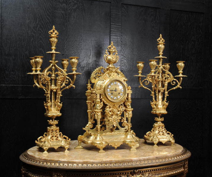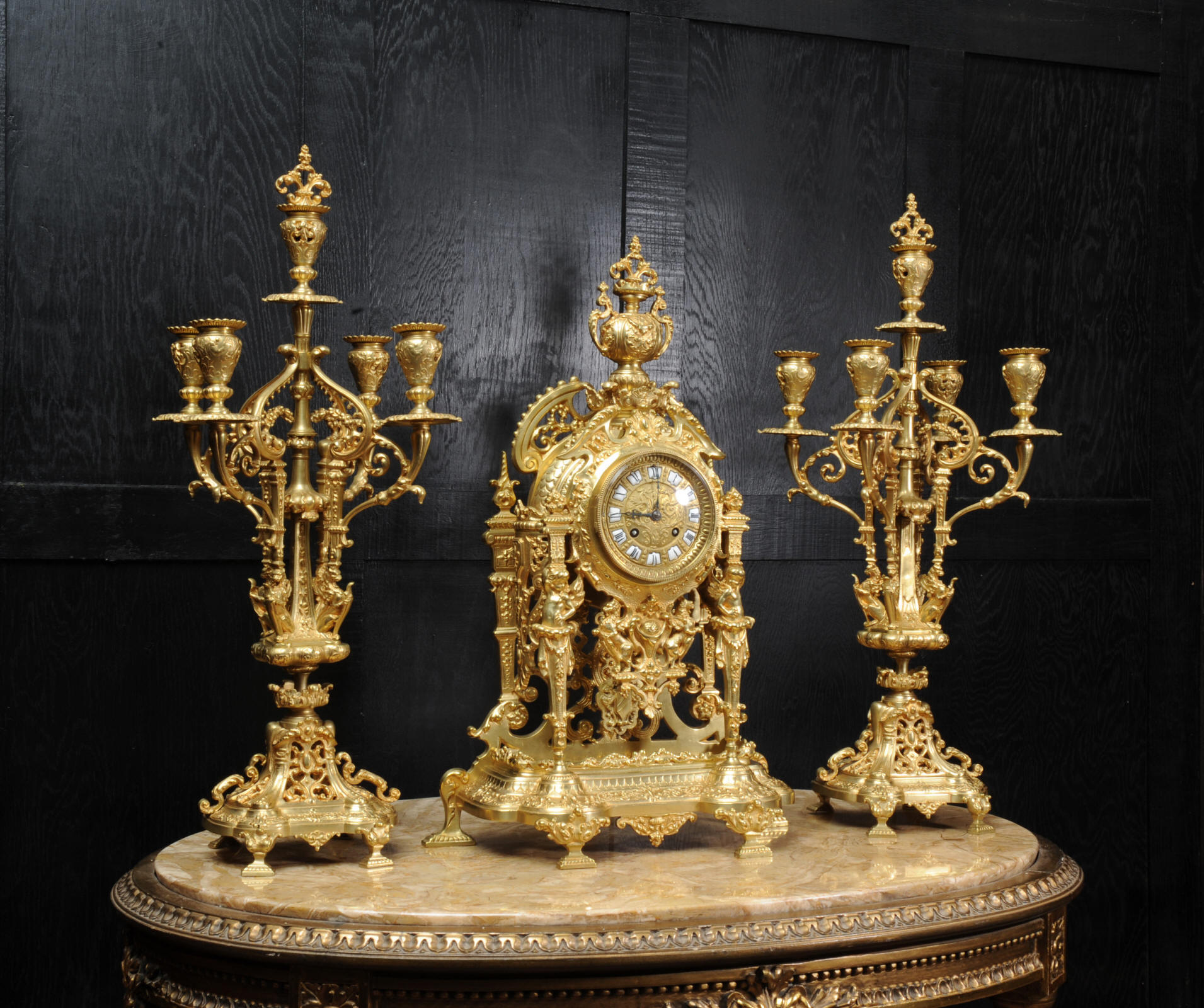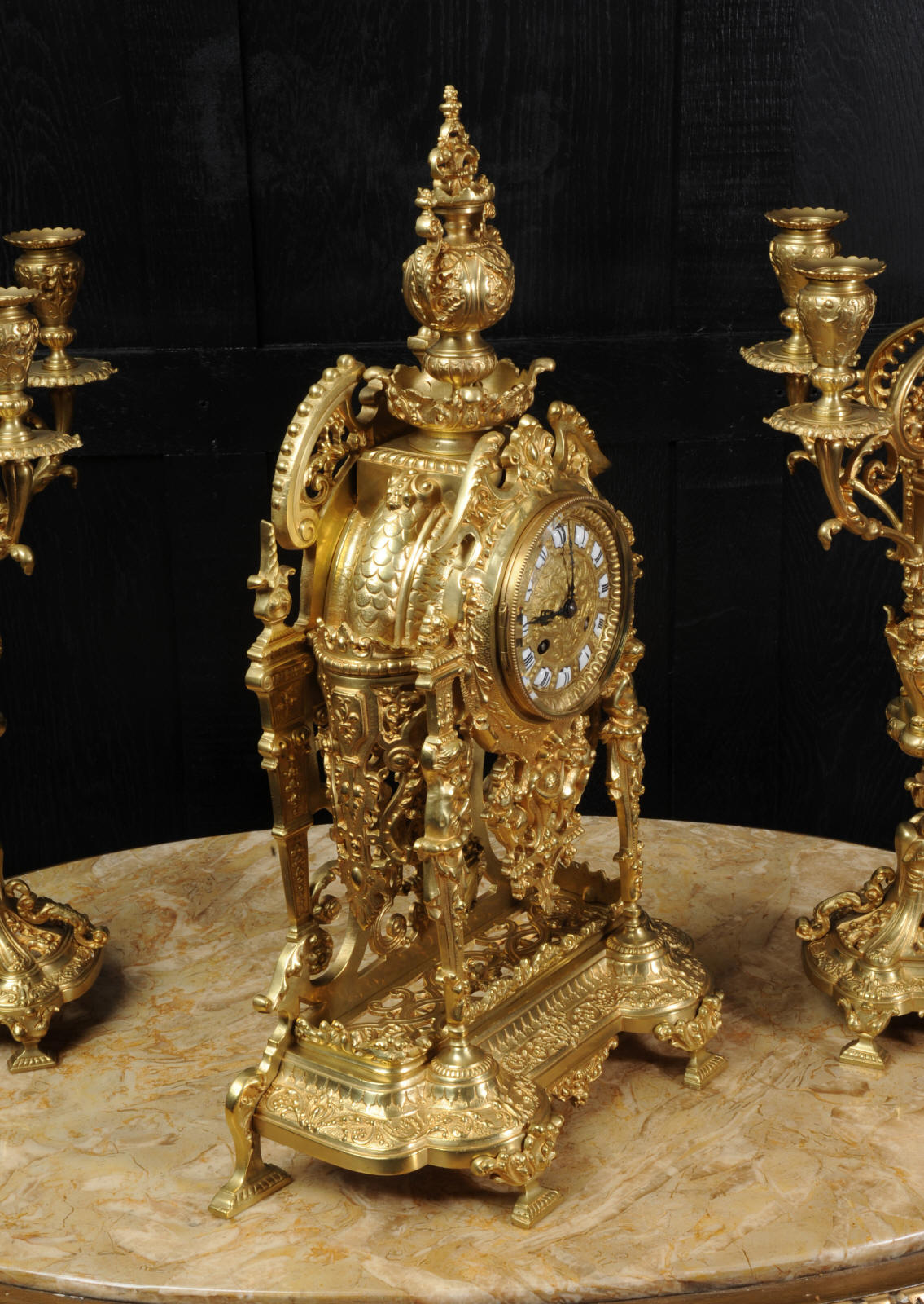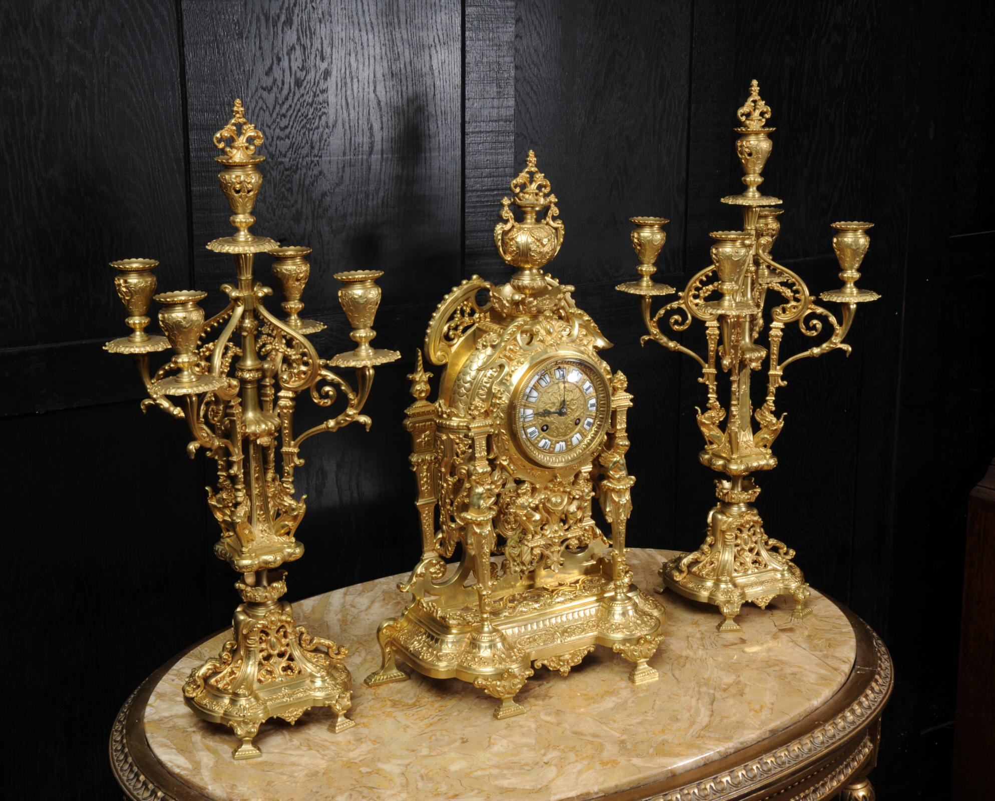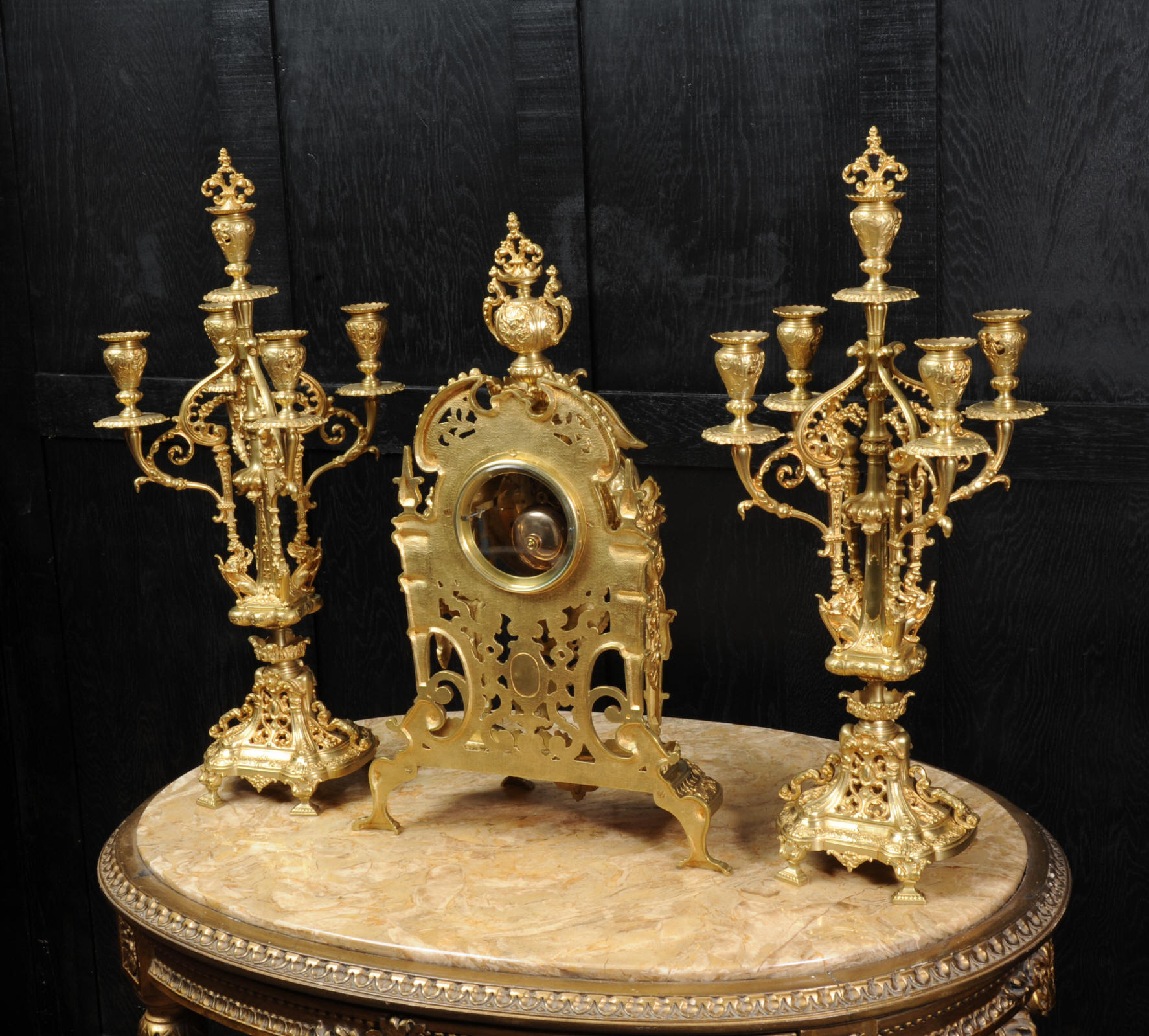 Above the dial is a typical Baroque broken arch. The back of the top is fretted along with the base and the clock is beautifully detailed and well finished. Candelabra have four lions supporting high, twirling acanthus branches. Snuffers sit in the central nozzle as a finial. The dial is also gilt bronze with 12 individual enamel cartouches and blued steel hands. The rear door is glazed to allow the movement to be seen. The French movement is of high quality and is in excellent clean and running condition having been fully overhauled by our clockmaker. Pendulum is original. It runs for 8 days and strikes the hours and halves on a bell. Click the video clip below to hear the bell and watch the clock running! Pierre Lemasson is listed in Tardy, Dictionnaire Des Horlogers as working in The Rue Commine, Paris in 1870. Condition of the case is excellent, the original gilding is beautifully clean and bright with hardly any wear or discolouration. The dial is also in excellent with no damage. The set makes a stunning display as you can see below.