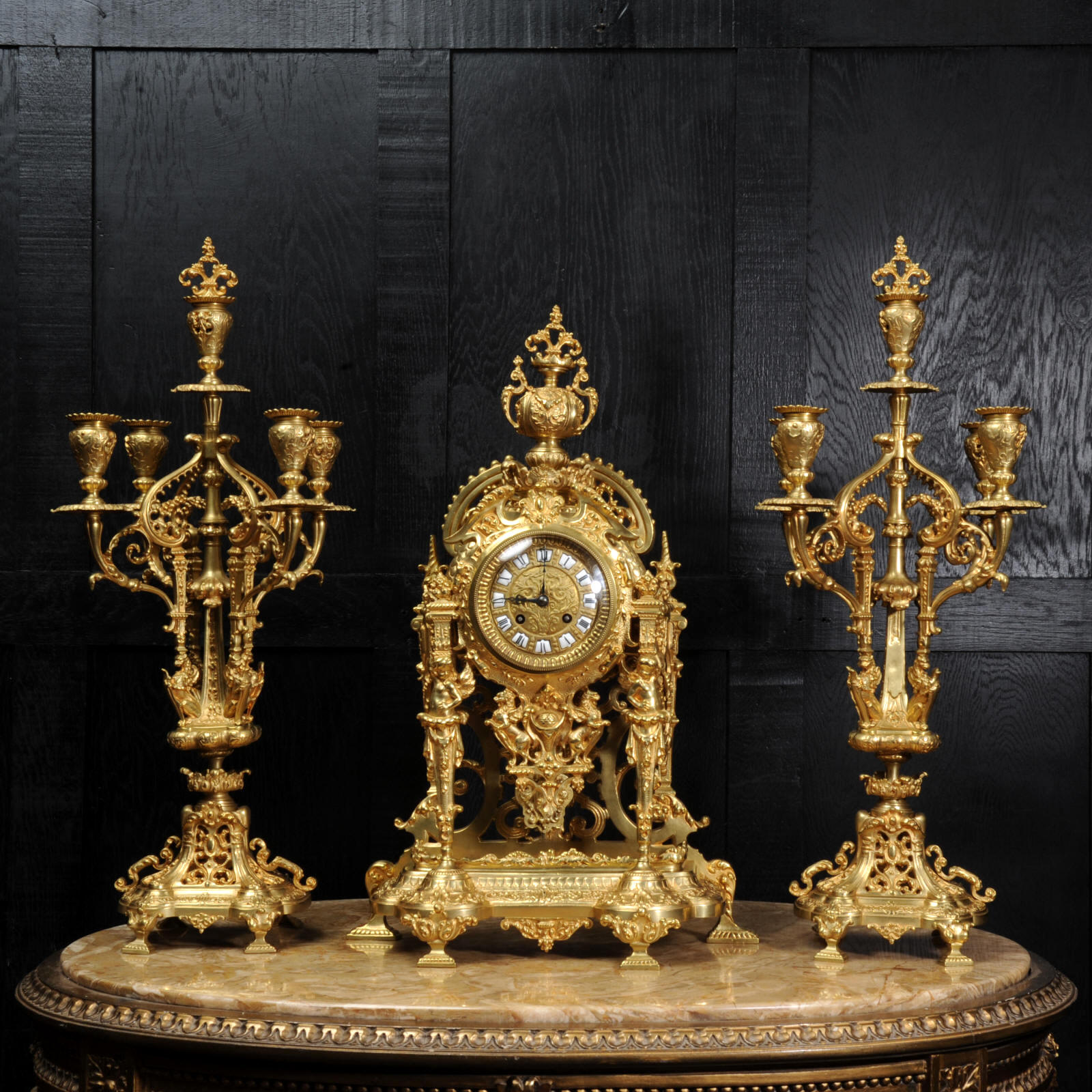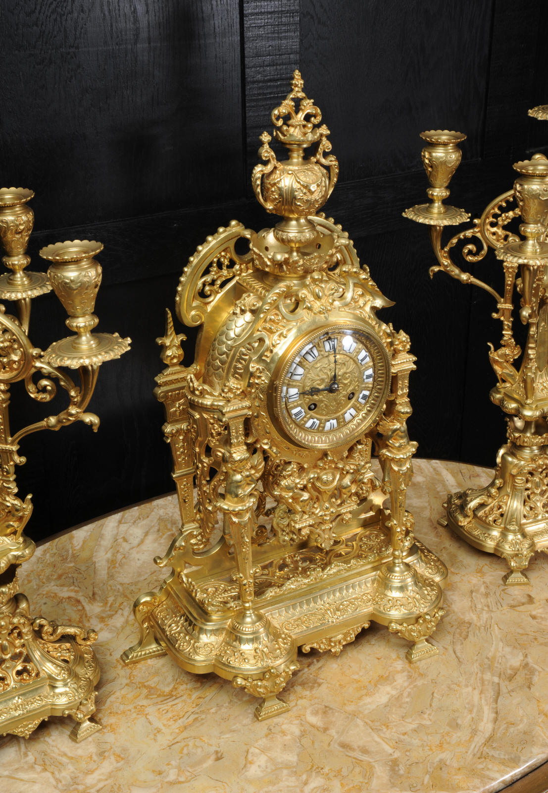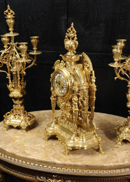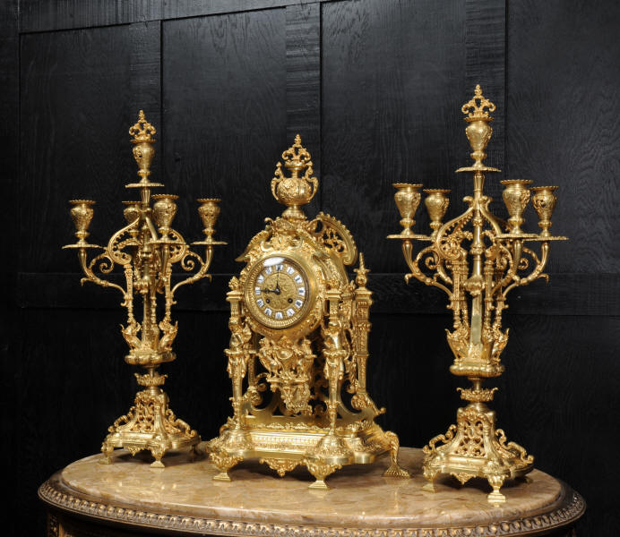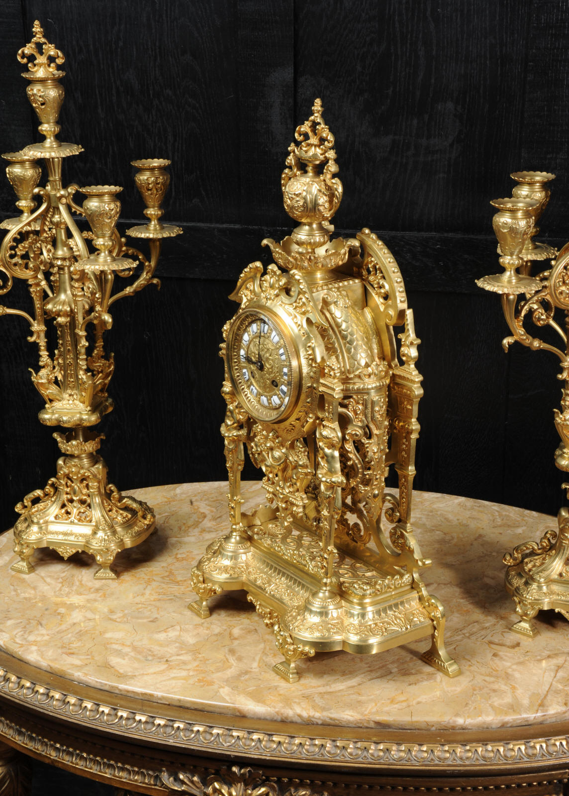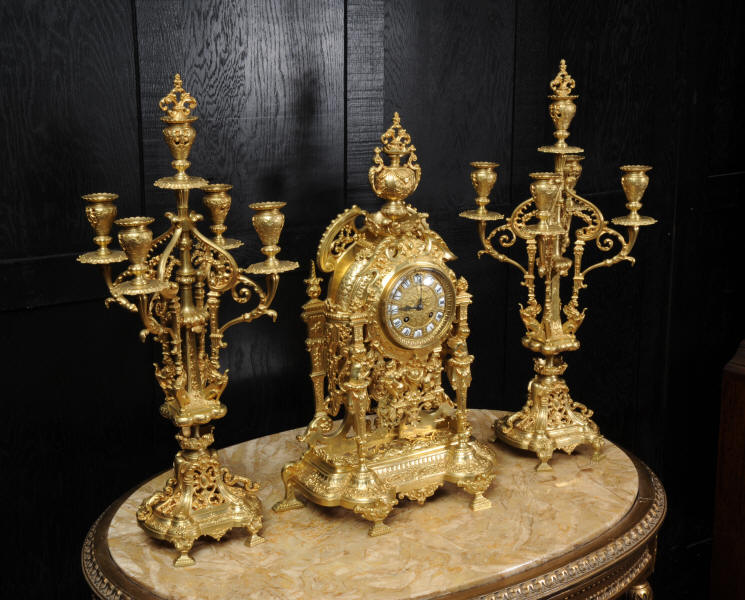 Above the dial is a typical Baroque broken arch. The back of the top is fretted along with the base and the clock is beautifully detailed and well finished. Candelabra have four lions supporting high, twirling acanthus branches. Snuffers sit in the central nozzle as a finial. The dial is also gilt bronze with 12 individual enamel cartouches and blued steel hands. The rear door is glazed to allow the movement to be seen. The French movement is of high quality and is in excellent clean and running condition having been fully overhauled by our clockmaker. Pendulum is original. It runs for 8 days and strikes the hours and halves on a bell. Click the video clip below to hear the bell and watch the clock running! Pierre Lemasson is listed in Tardy, Dictionnaire Des Horlogers as working in The Rue Commine, Paris in 1870. Condition of the case is excellent, the original gilding is beautifully clean and bright with hardly any wear or discolouration. The dial is also in excellent with no damage. The set makes a stunning display as you can see below.
