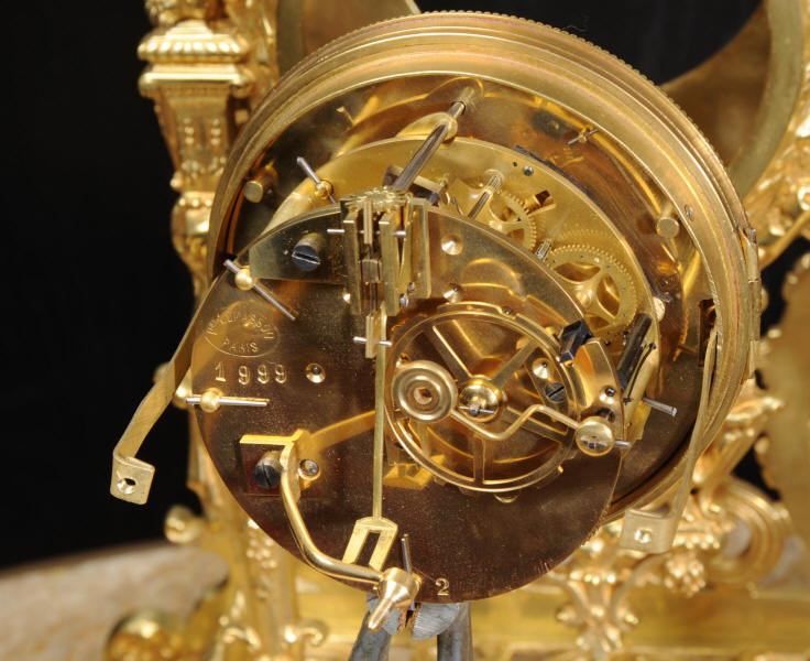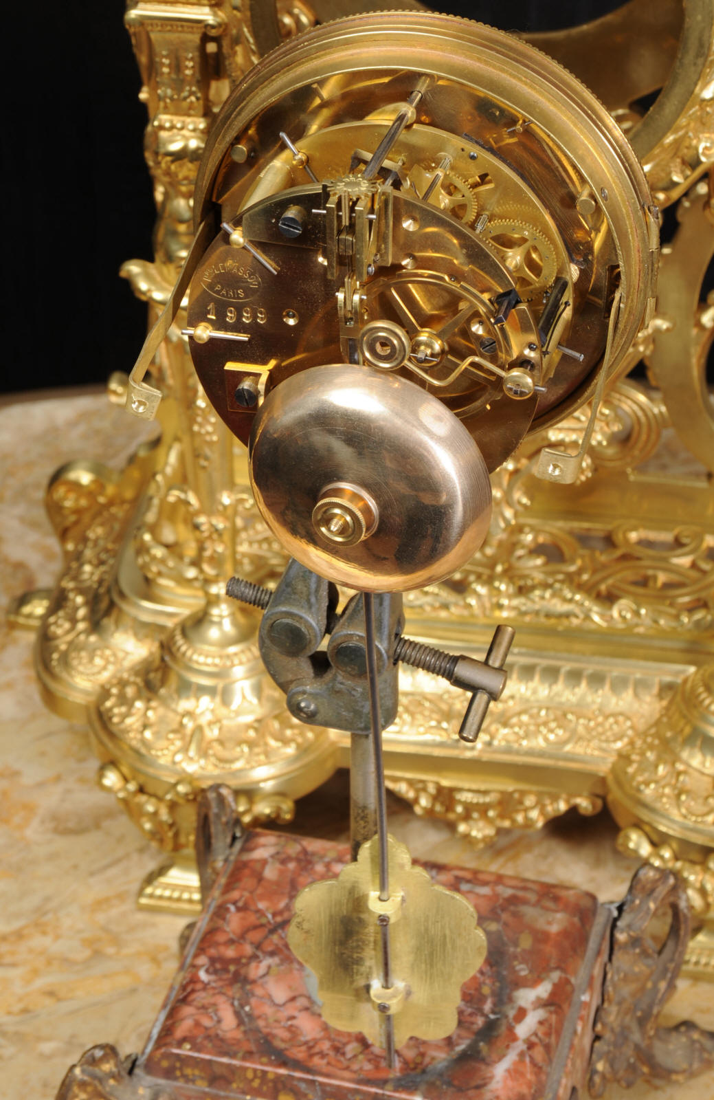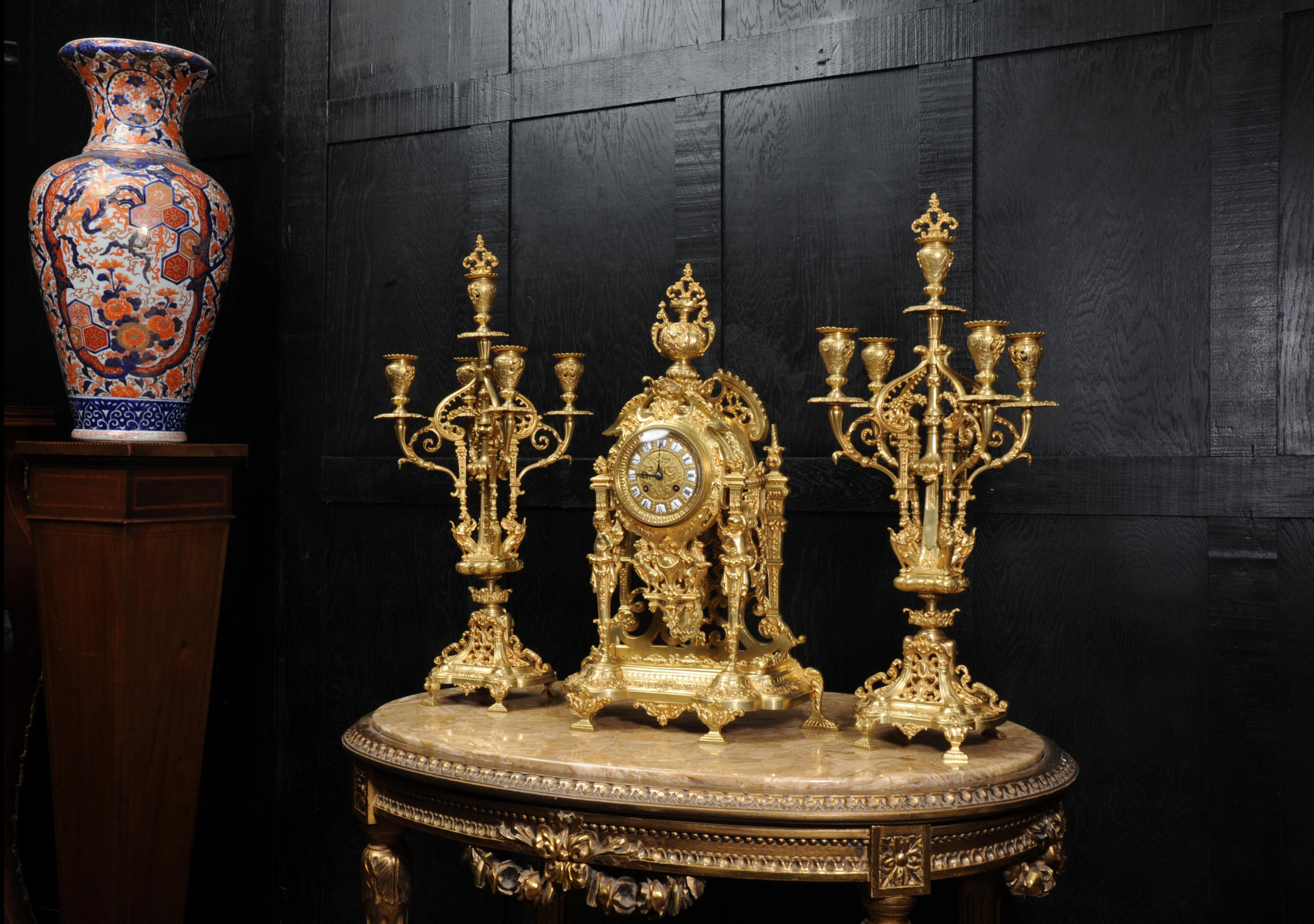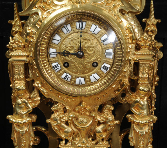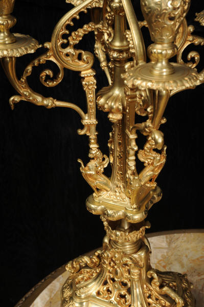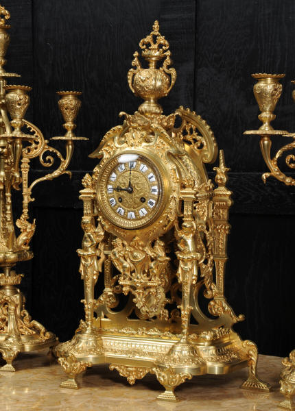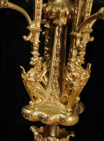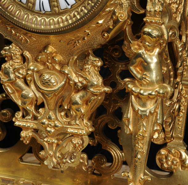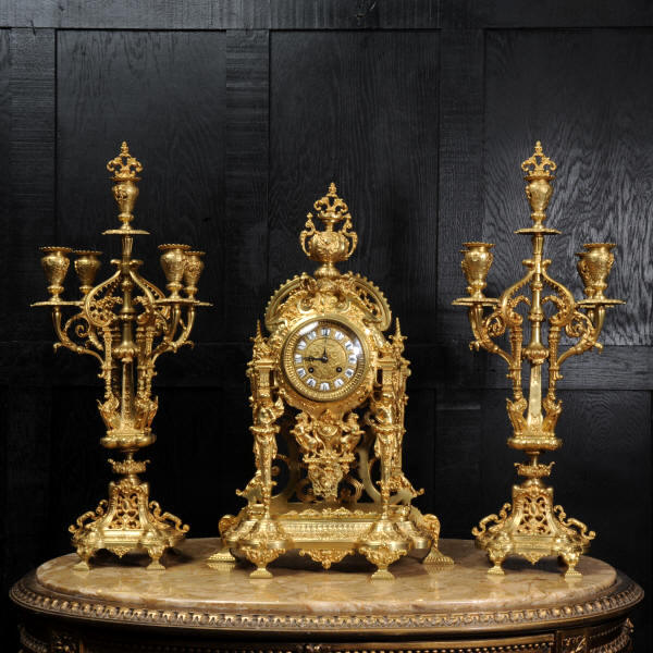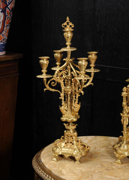 Above the dial is a typical Baroque broken arch. The back of the top is fretted along with the base and the clock is beautifully detailed and well finished. Candelabra have four lions supporting high, twirling acanthus branches. Snuffers sit in the central nozzle as a finial. The dial is also gilt bronze with 12 individual enamel cartouches and blued steel hands. The rear door is glazed to allow the movement to be seen. The French movement is of high quality and is in excellent clean and running condition having been fully overhauled by our clockmaker. Pendulum is original. It runs for 8 days and strikes the hours and halves on a bell. Click the video clip below to hear the bell and watch the clock running! Pierre Lemasson is listed in Tardy, Dictionnaire Des Horlogers as working in The Rue Commine, Paris in 1870. Condition of the case is excellent, the original gilding is beautifully clean and bright with hardly any wear or discolouration. The dial is also in excellent with no damage. The set makes a stunning display as you can see below.