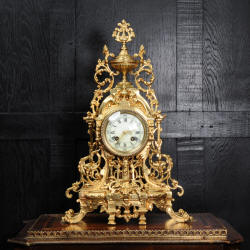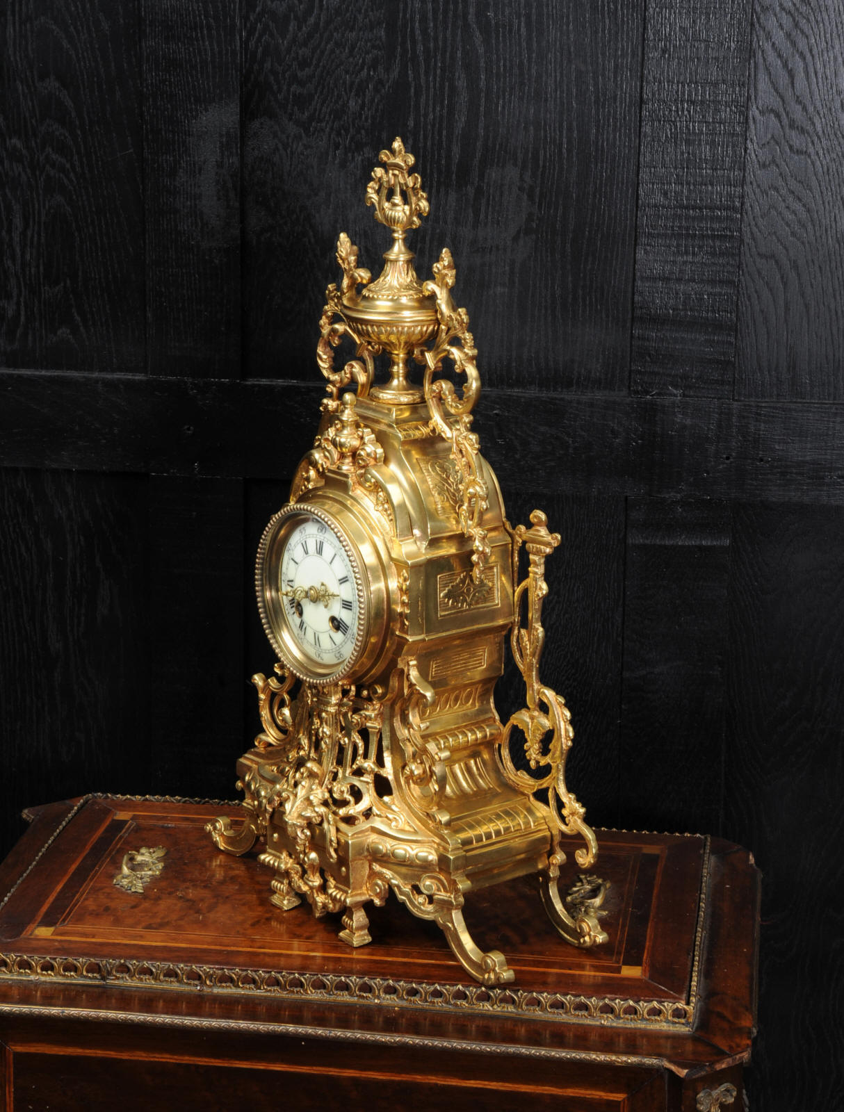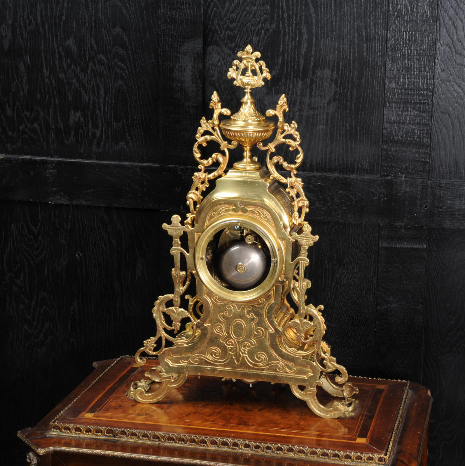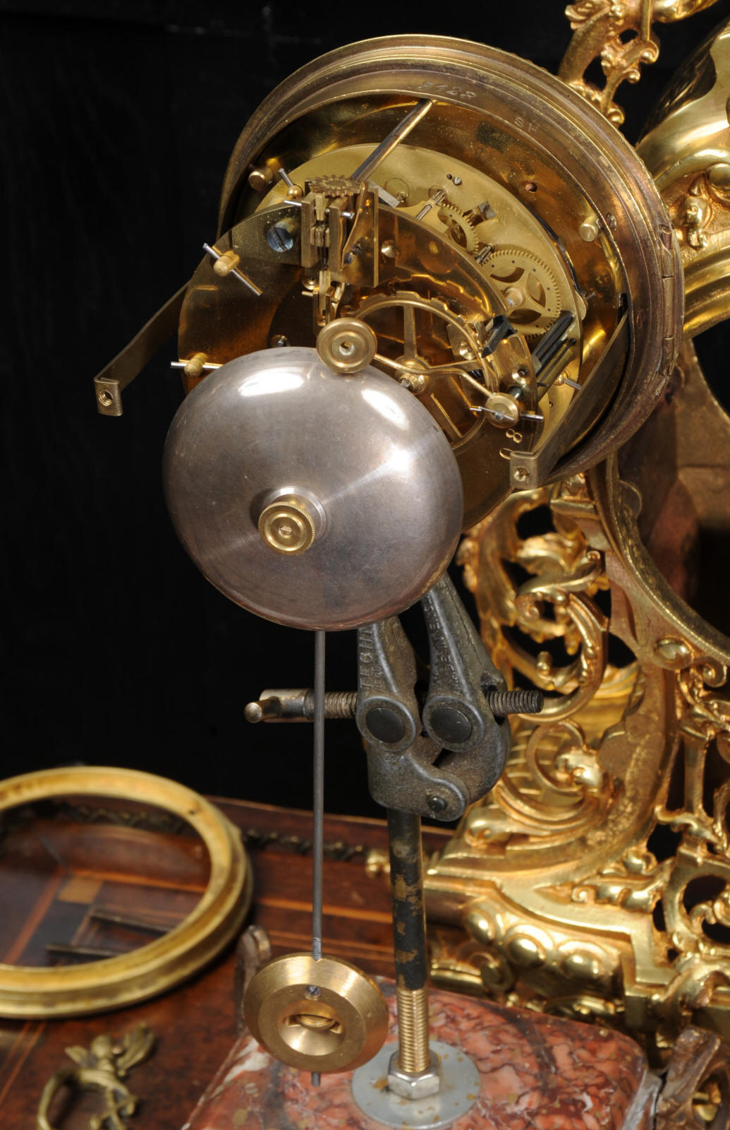 The dial is cream porcelain enamel on copper with separately lettered minute ring and finely cut gilt brass hands. The bezel is glazed with convex glass, the rear door is also glazed to allow the movement to be seen. The French movement is by A. D. Mougin and is of high quality. It is in excellent clean and running condition having been fully overhauled by our clockmaker. Pendulum is a replacement. It runs for 8 days and strikes the hours and halves on a bell. Click the video clip below to hear the bell and watch the clock running! Condition of the case is excellent, the original gilding is beautifully clean and bright with hardly any wear or discolouration and there are no losses. The dial is also in excellent condition with no damage.