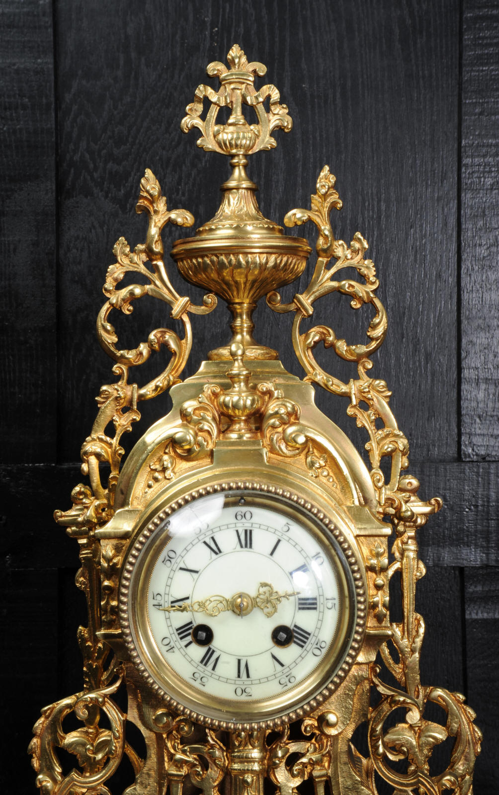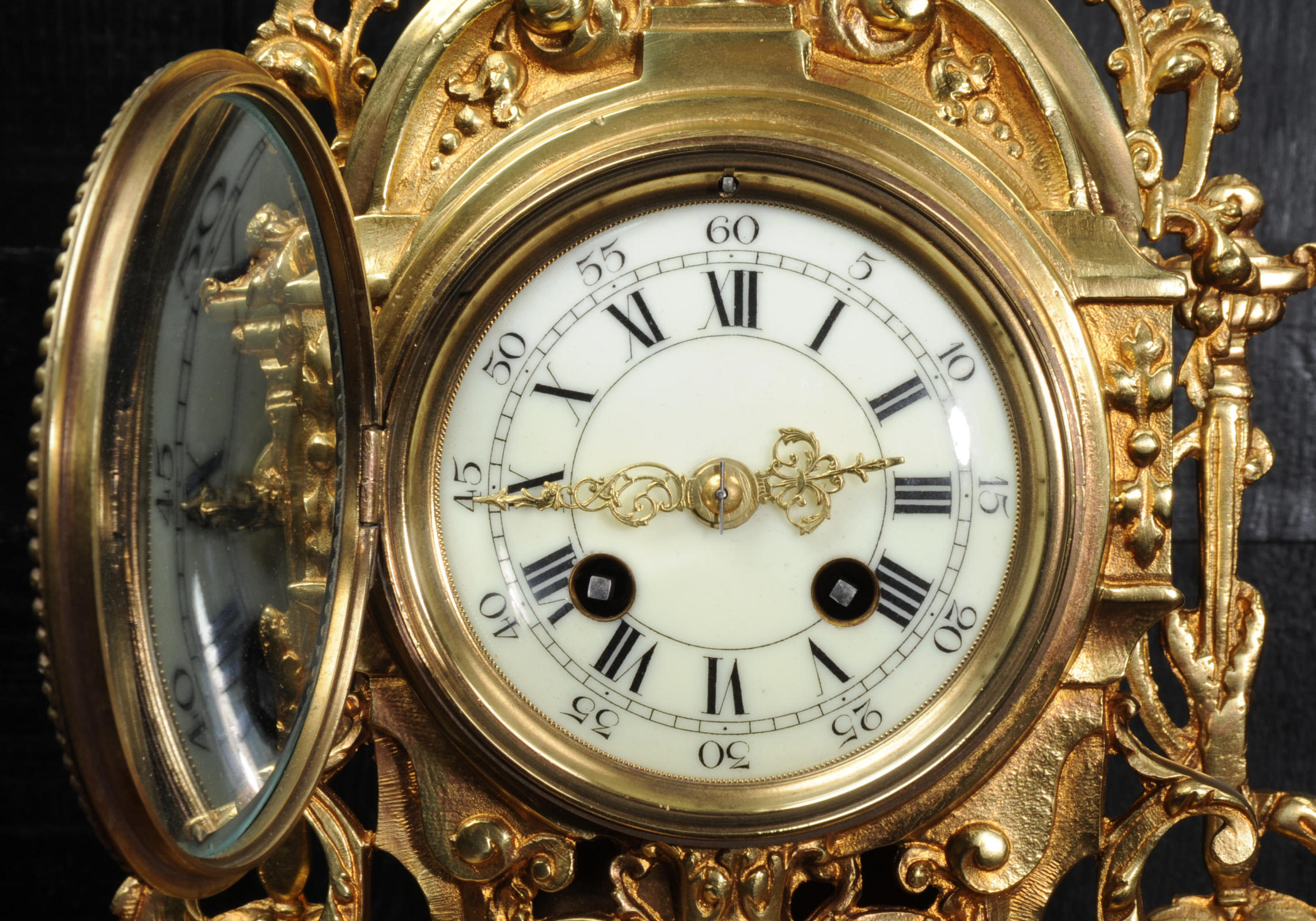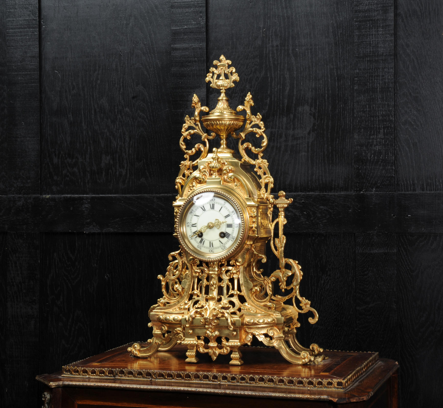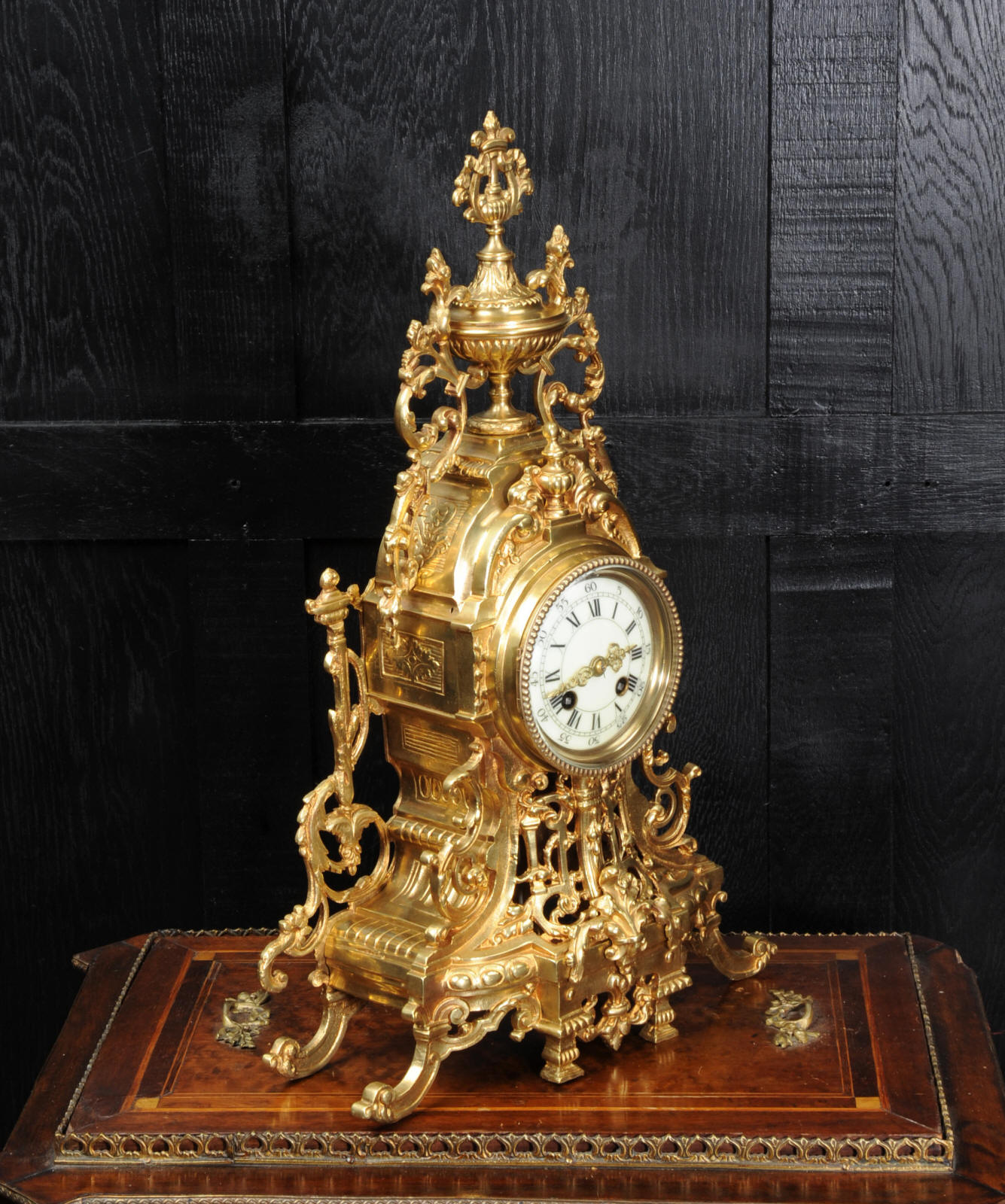 The dial is cream porcelain enamel on copper with separately lettered minute ring and finely cut gilt brass hands. The bezel is glazed with convex glass, the rear door is also glazed to allow the movement to be seen. The French movement is by A. D. Mougin and is of high quality. It is in excellent clean and running condition having been fully overhauled by our clockmaker. Pendulum is a replacement. It runs for 8 days and strikes the hours and halves on a bell. Click the video clip below to hear the bell and watch the clock running! Condition of the case is excellent, the original gilding is beautifully clean and bright with hardly any wear or discolouration and there are no losses. The dial is also in excellent condition with no damage.