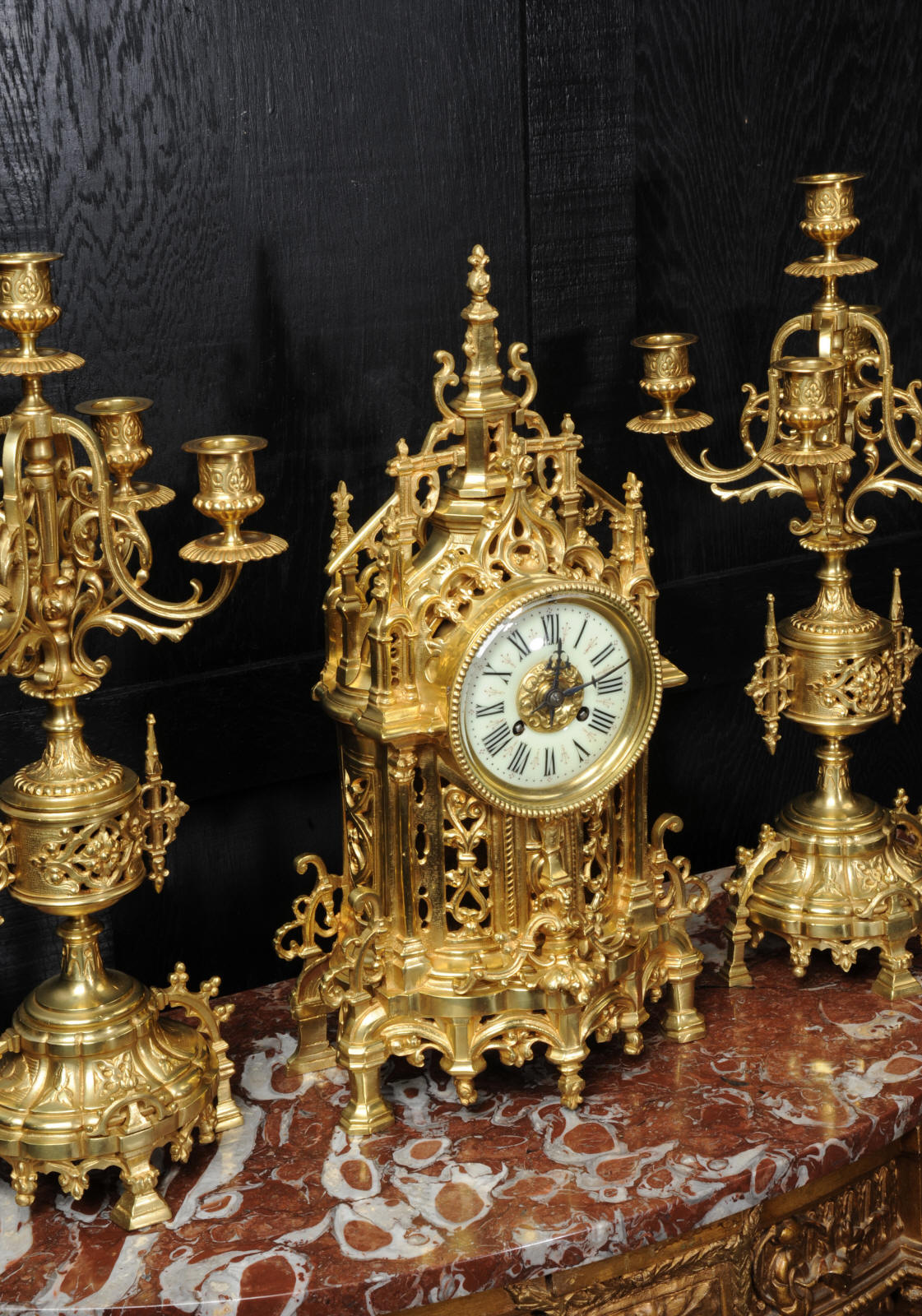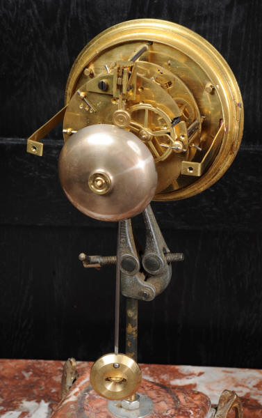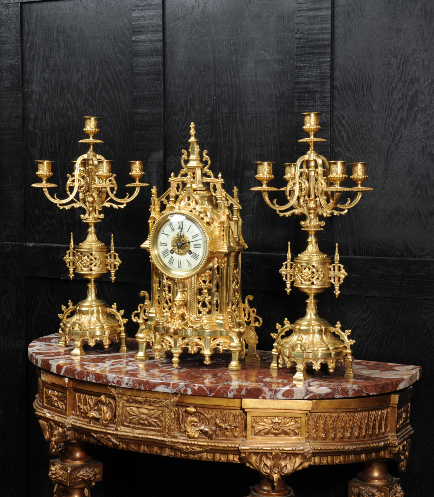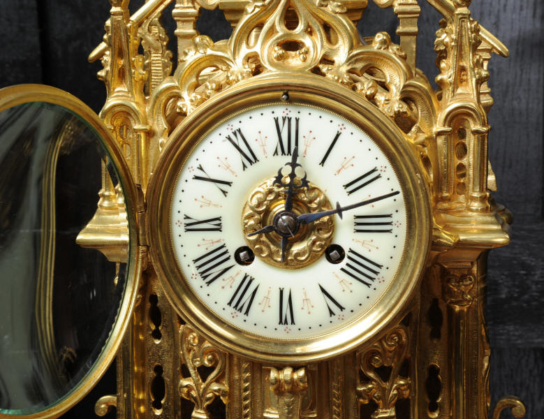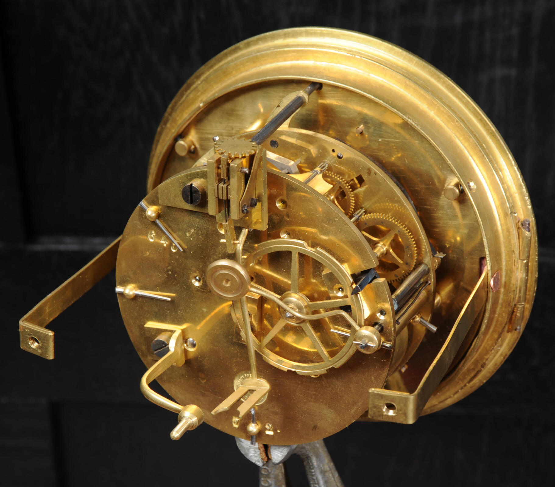 The large dial is porcelain enamel on copper with a gilt bronze centre and finely cut blued steel hands. The French movement is by Japy Freres and is of the company's usual high quality. We have fully overhauled and tested the movement. Pendulum is a replacement. It runs for 8 days and strikes the hours and halves on a bell. Click the video clip below to hear the bell and watch the clock running! Condition of the case is excellent, the original gilding is beautifully clean and bright with hardly any wear or discolouration and there are no losses. The dial is also in excellent condition just some tiny nibbles next to the winding holes and some very faint hairlines. the clock's finial is slightly distorted.