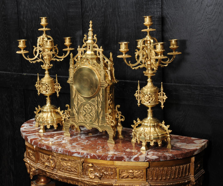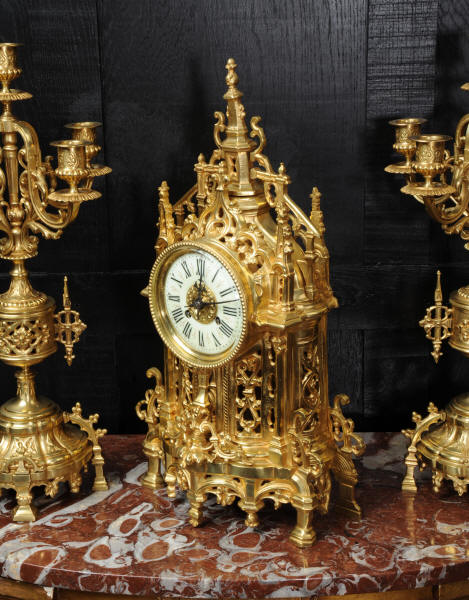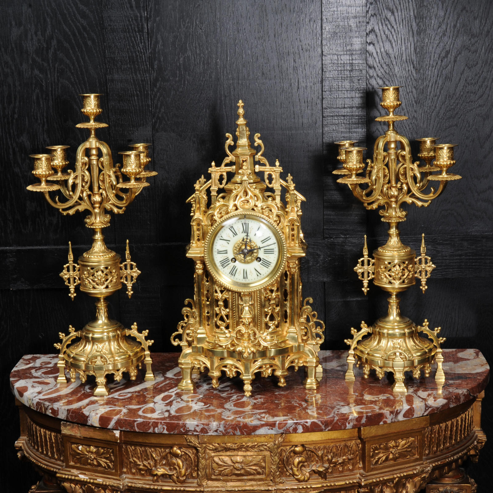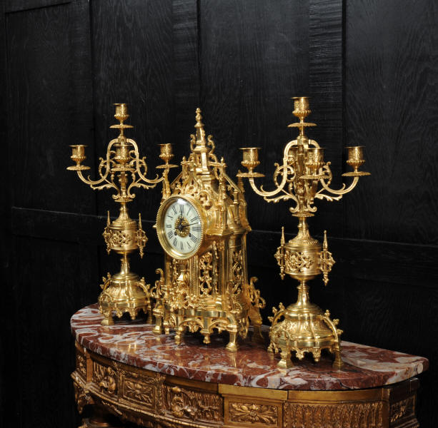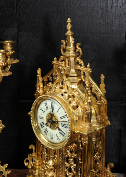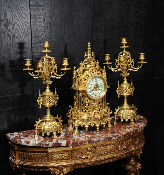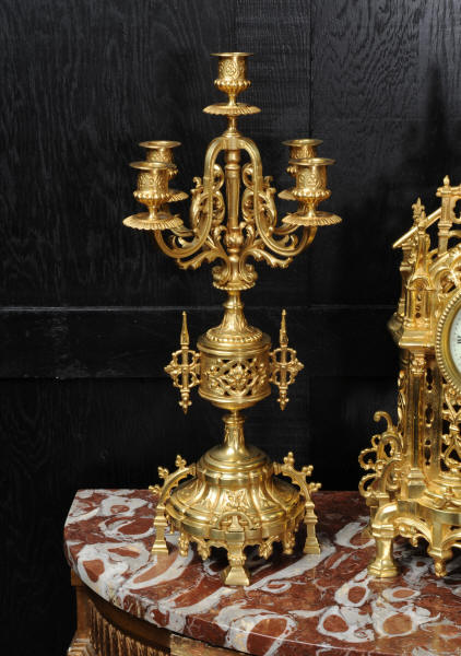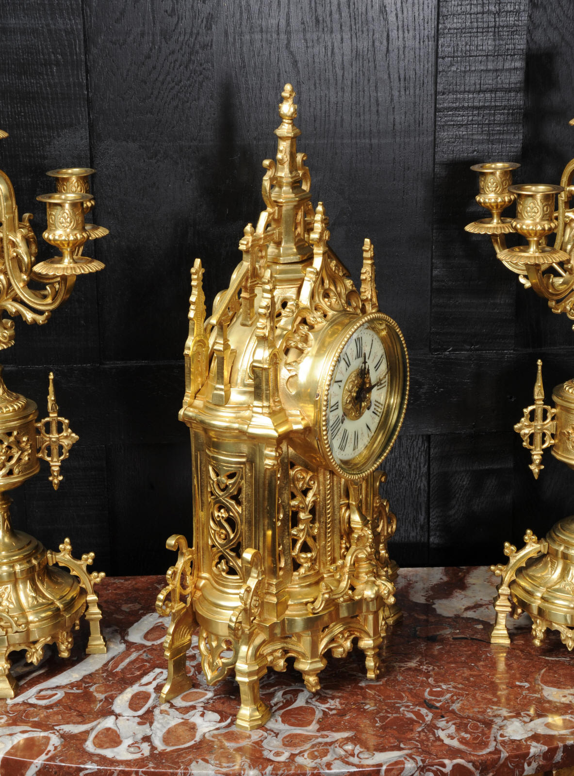 The large dial is porcelain enamel on copper with a gilt bronze centre and finely cut blued steel hands. The French movement is by Japy Freres and is of the company's usual high quality. We have fully overhauled and tested the movement. Pendulum is a replacement. It runs for 8 days and strikes the hours and halves on a bell. Click the video clip below to hear the bell and watch the clock running! Condition of the case is excellent, the original gilding is beautifully clean and bright with hardly any wear or discolouration and there are no losses. The dial is also in excellent condition just some tiny nibbles next to the winding holes and some very faint hairlines. the clock's finial is slightly distorted.