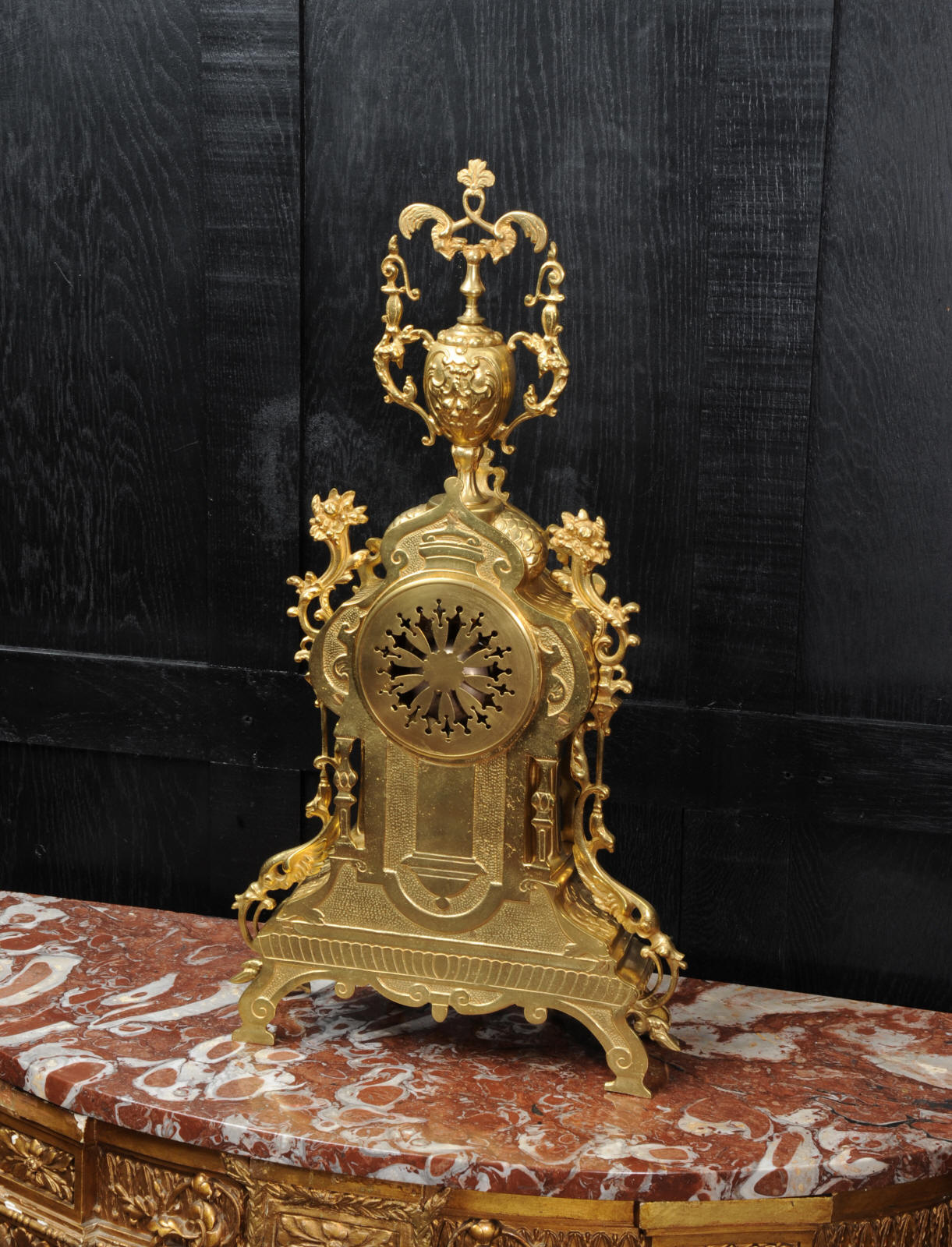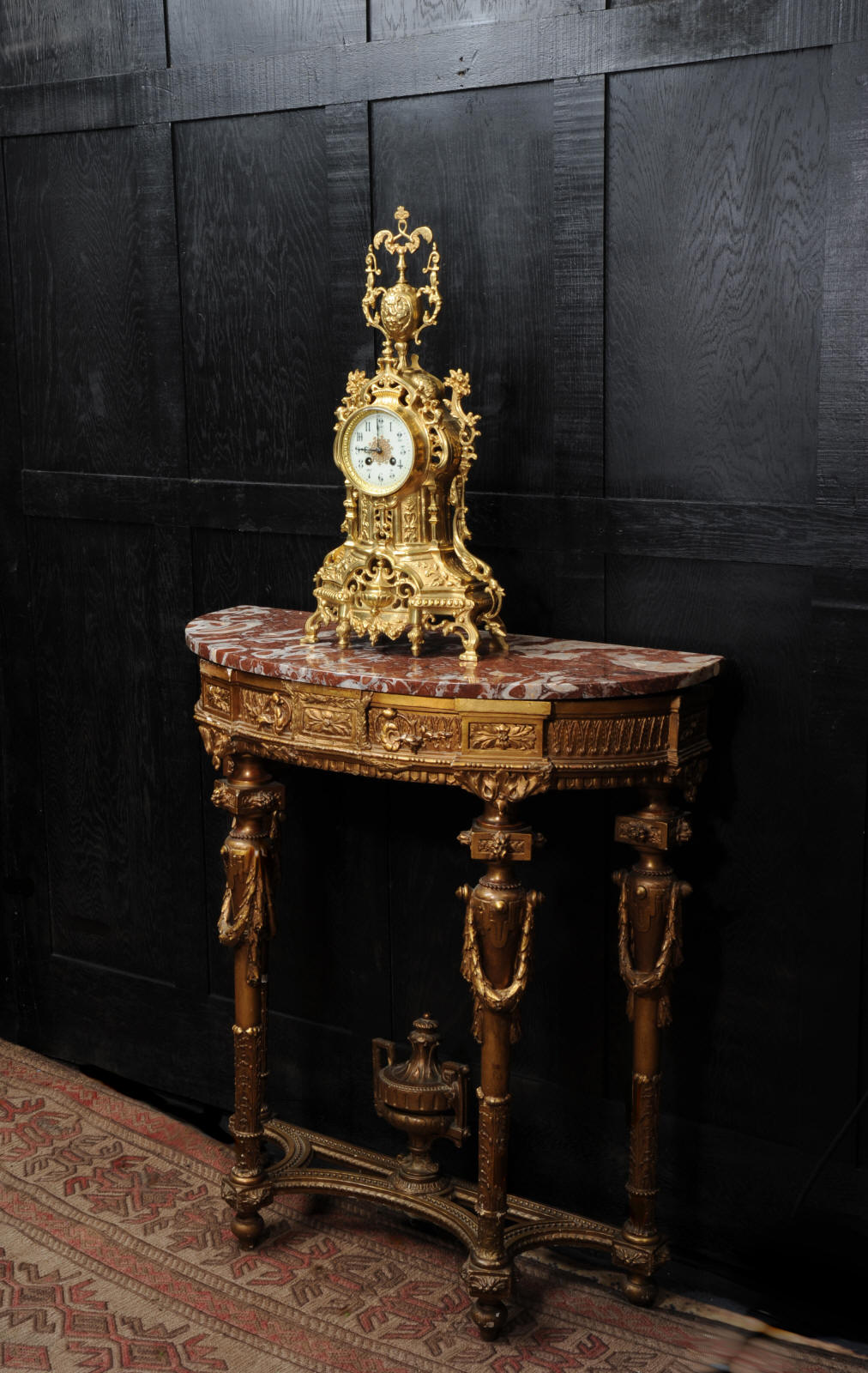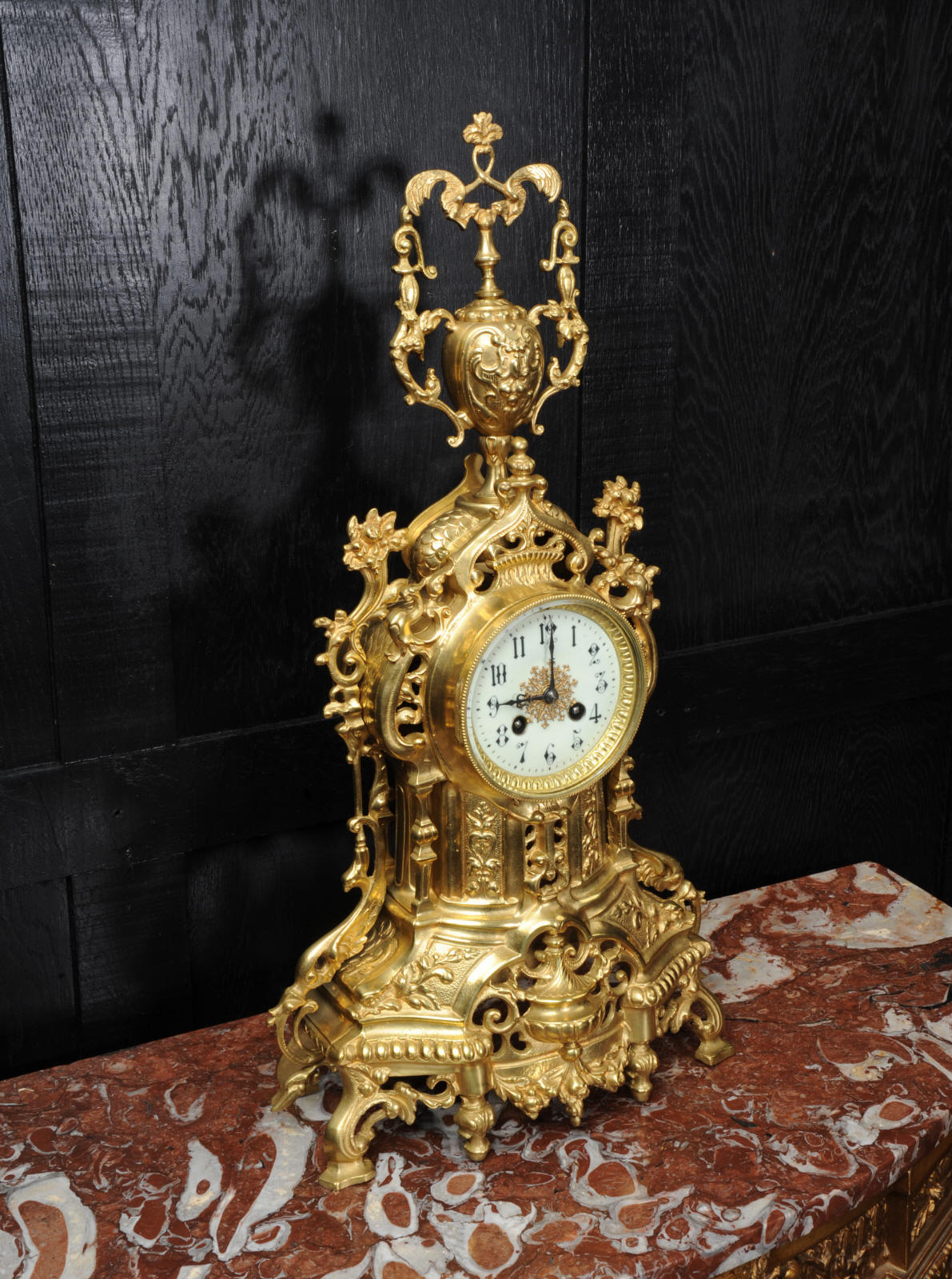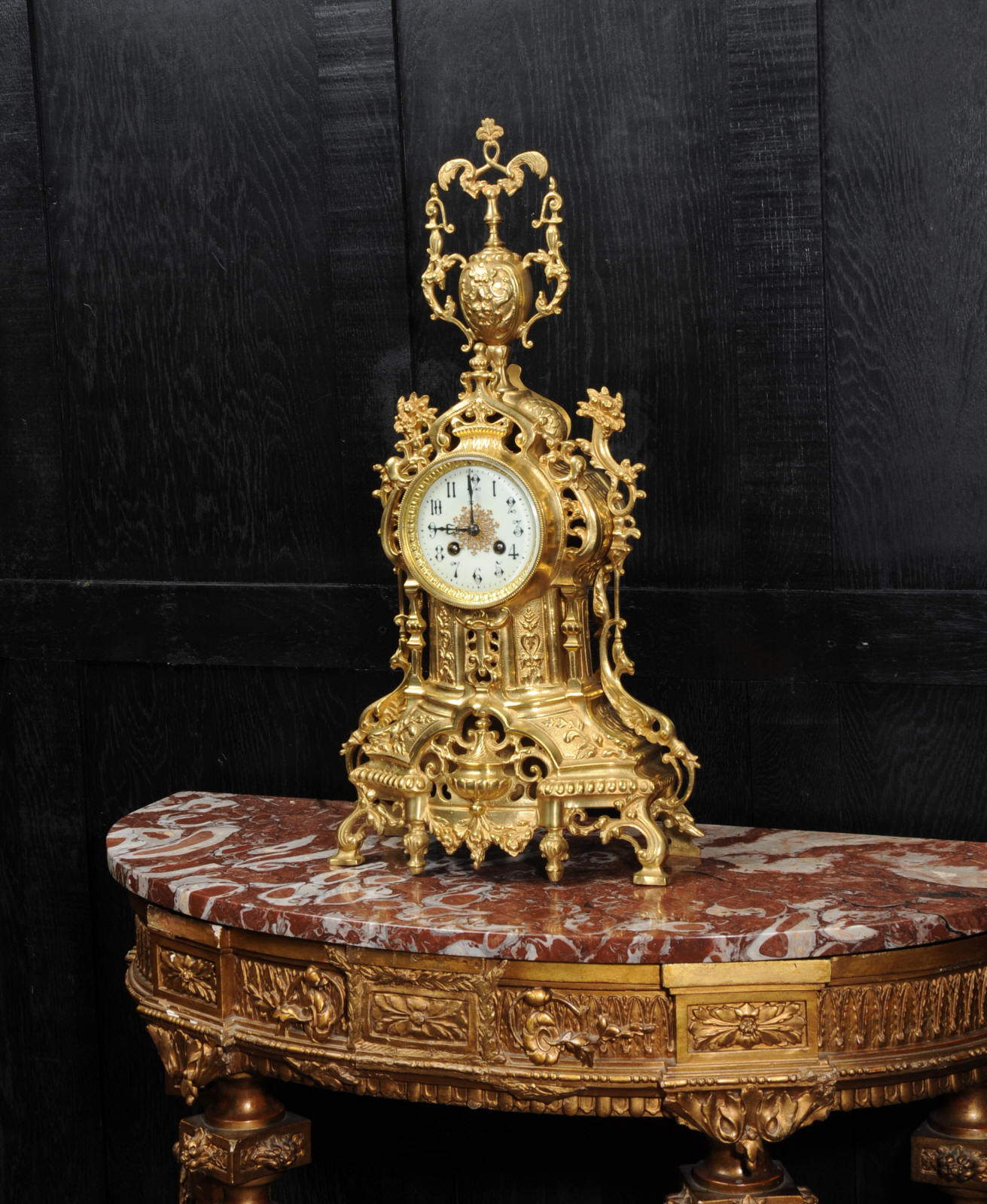 The dial is porcelain enamel on copper with a fancy gilt overlay to the centre, egg and dart bezel and blued steel hands. The French movement is of high quality and is by Japy Freres. It is in excellent clean and running condition having been fully overhauled by our clockmaker. Pendulum is a replacement. It runs for 8 days and strikes the hours and halves on a bell. Click the video clip below to hear the bell and watch the clock running! Condition of the case is excellent, the original gilding is beautifully clean and bright with hardly any wear or discolouration and there are no losses. The dial is also in excellent condition with no damage.