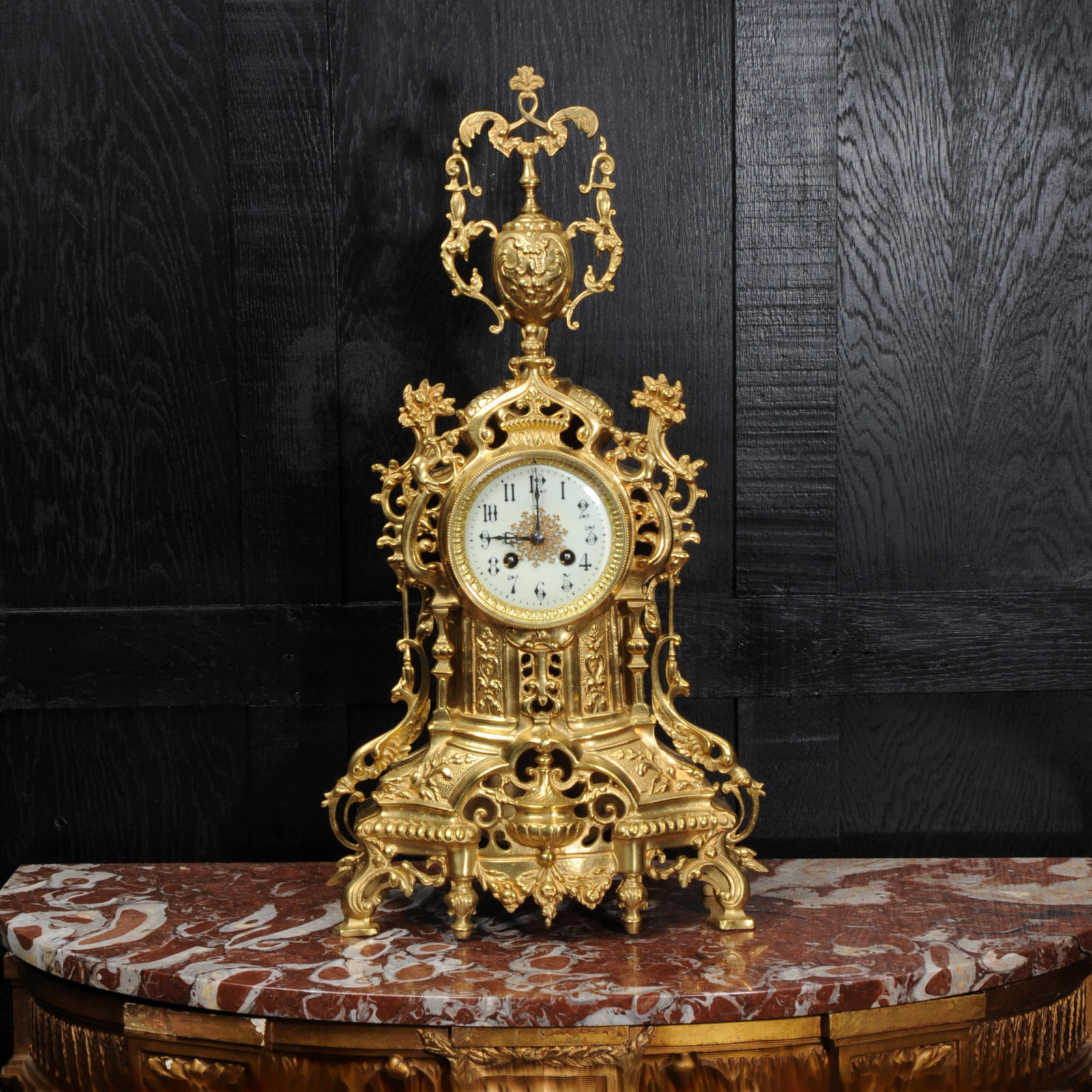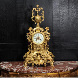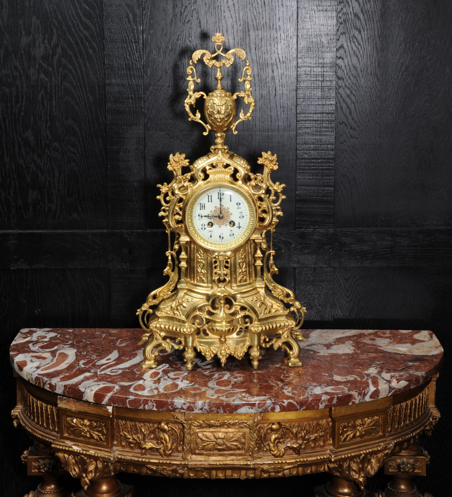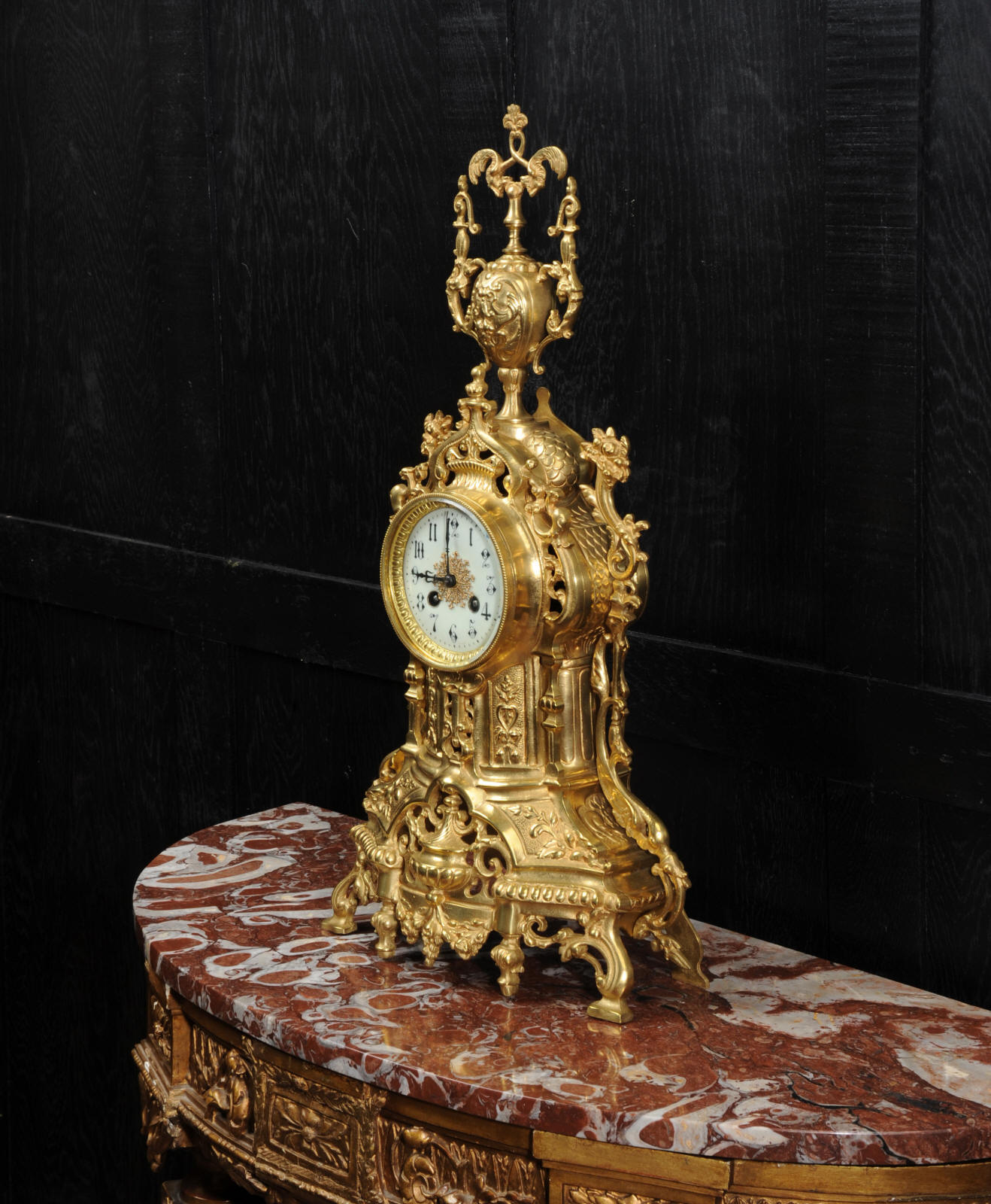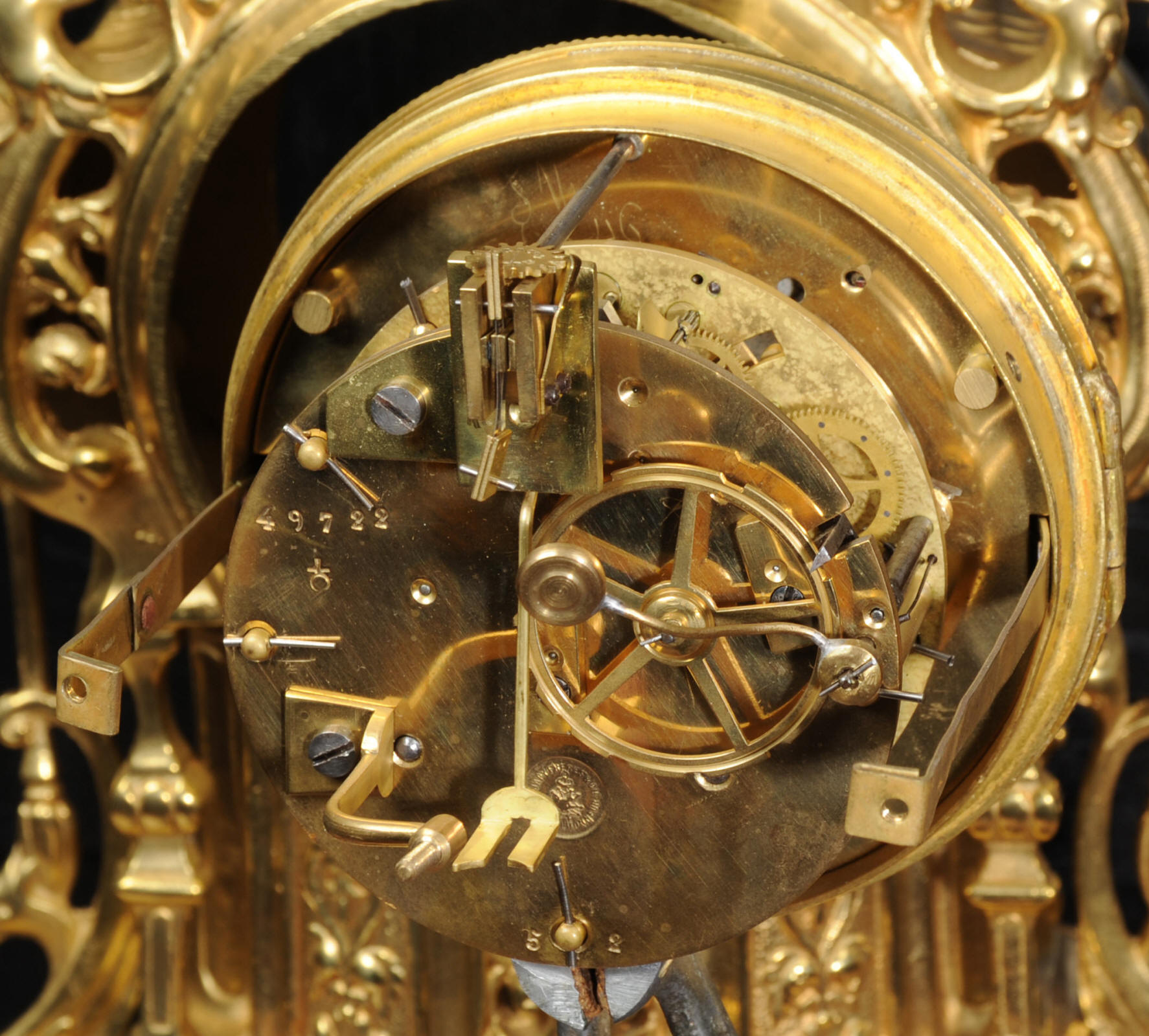 The dial is porcelain enamel on copper with a fancy gilt overlay to the centre, egg and dart bezel and blued steel hands. The French movement is of high quality and is by Japy Freres. It is in excellent clean and running condition having been fully overhauled by our clockmaker. Pendulum is a replacement. It runs for 8 days and strikes the hours and halves on a bell. Click the video clip below to hear the bell and watch the clock running! Condition of the case is excellent, the original gilding is beautifully clean and bright with hardly any wear or discolouration and there are no losses. The dial is also in excellent condition with no damage.