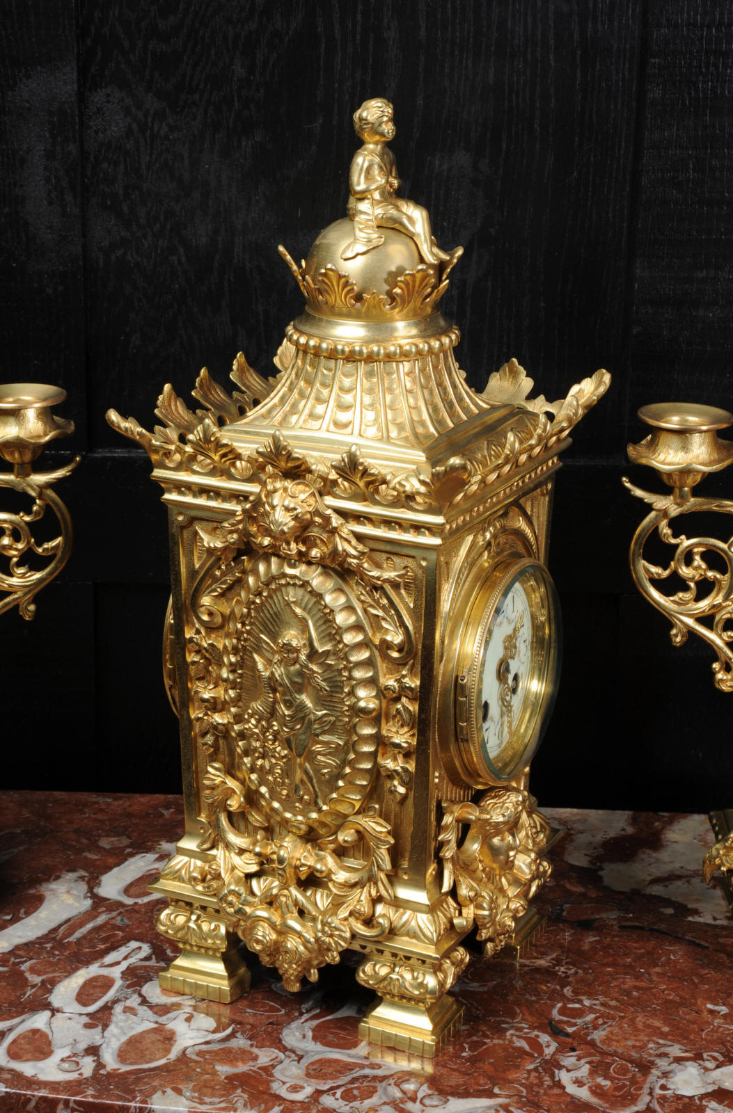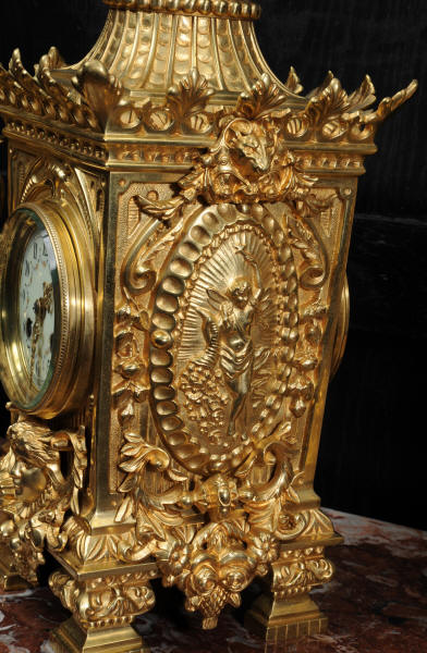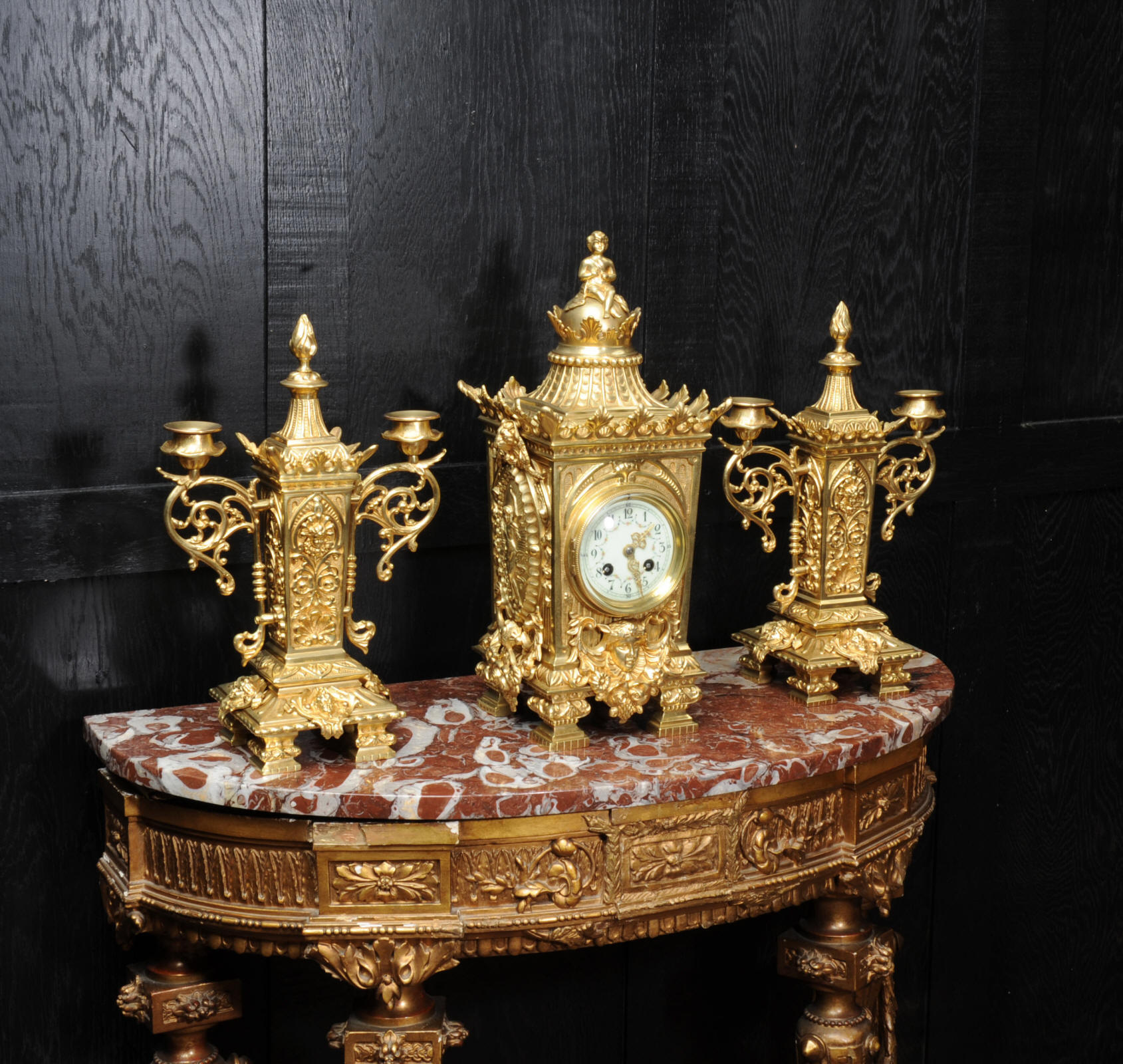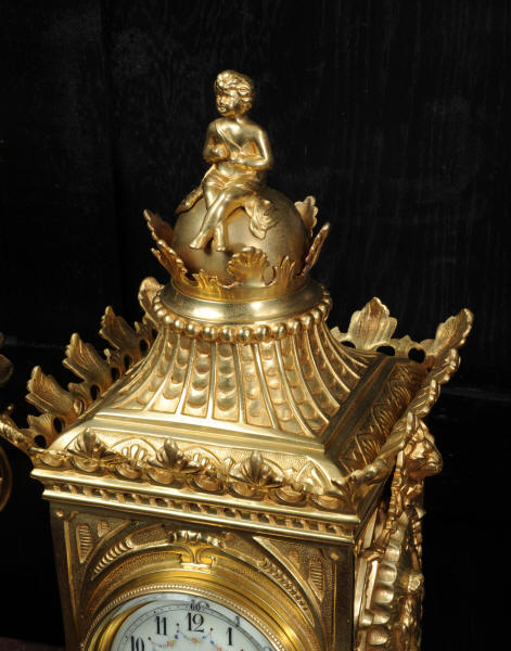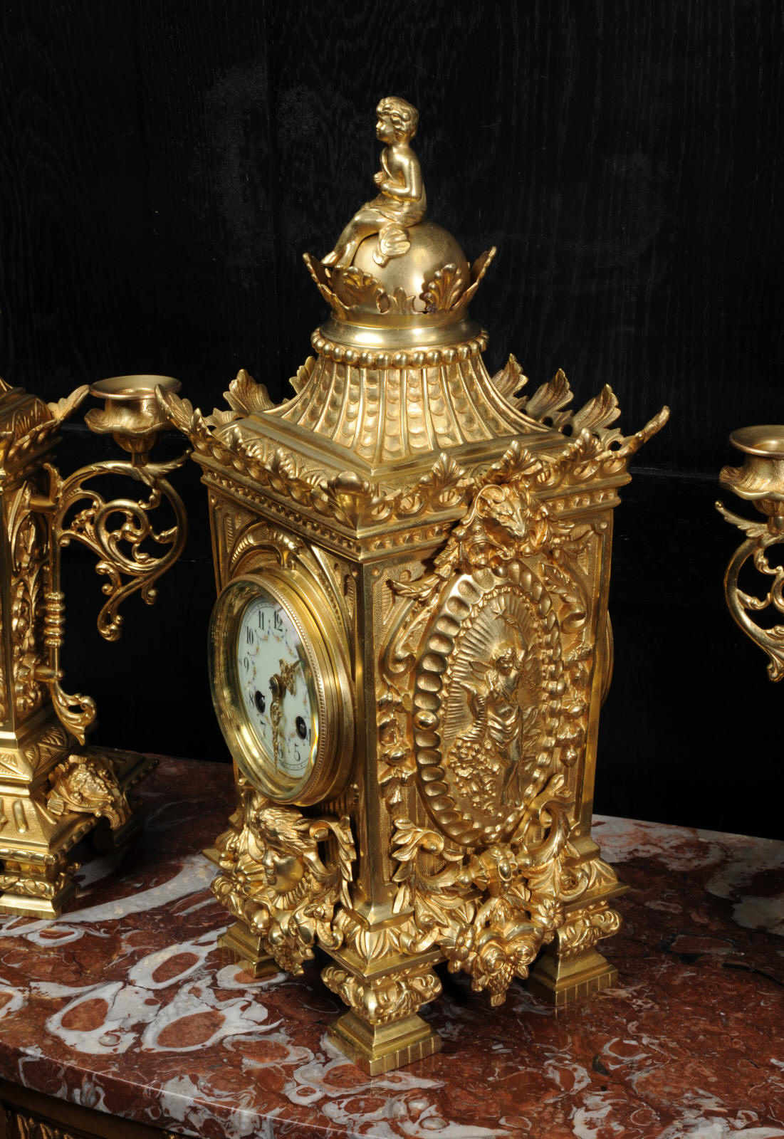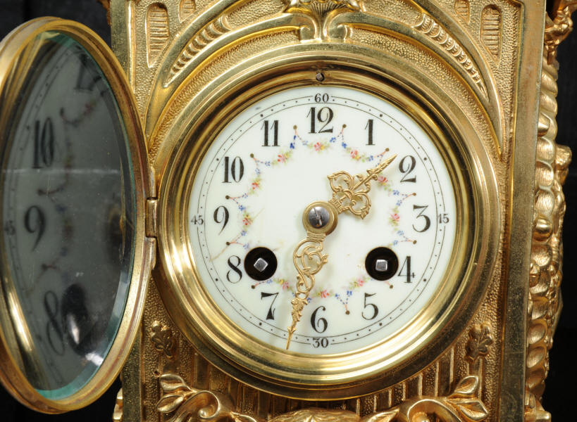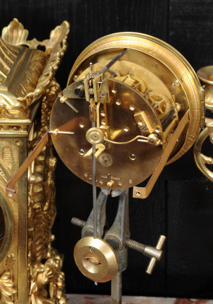 The dial cream porcelain enamel on copper with delicate floral swags and finely cut gilt hands. The French movement is by Japy Freres and is of high quality. It is in excellent clean and running condition having been fully overhauled by our clockmaker. Pendulum is a replacement. It runs for 8 days and strikes the hours and halves on a sonorous coiled gong. Click the video clip below to hear the gong and watch the clock running! Condition of the case is excellent, the original gilding is beautifully clean and bright with hardly any wear or discolouration and there are no losses. The dial is also in excellent condition just some tiny nibbles to the winding holes and a slight mark near the 8 o'clock.