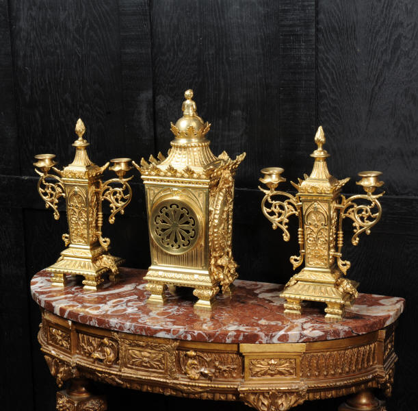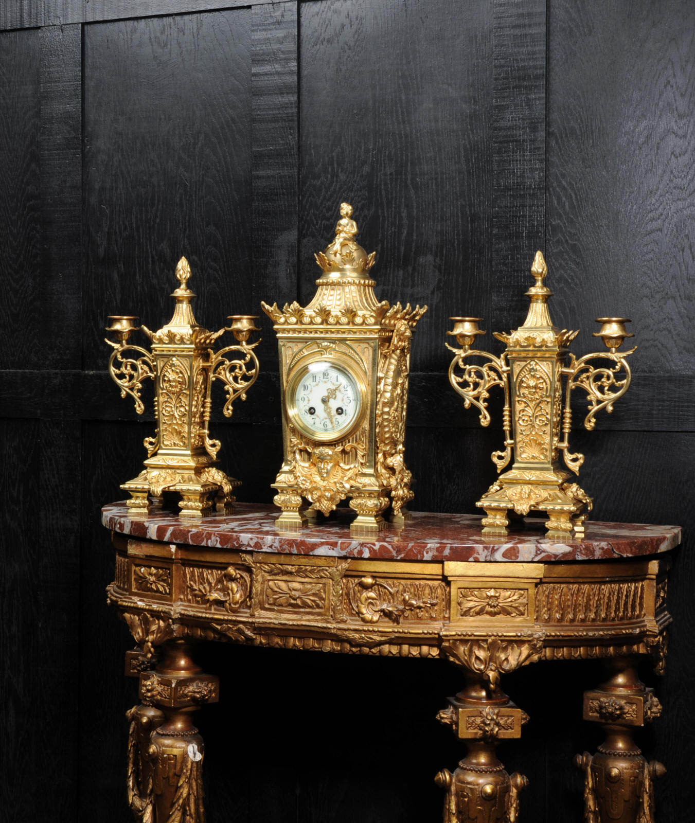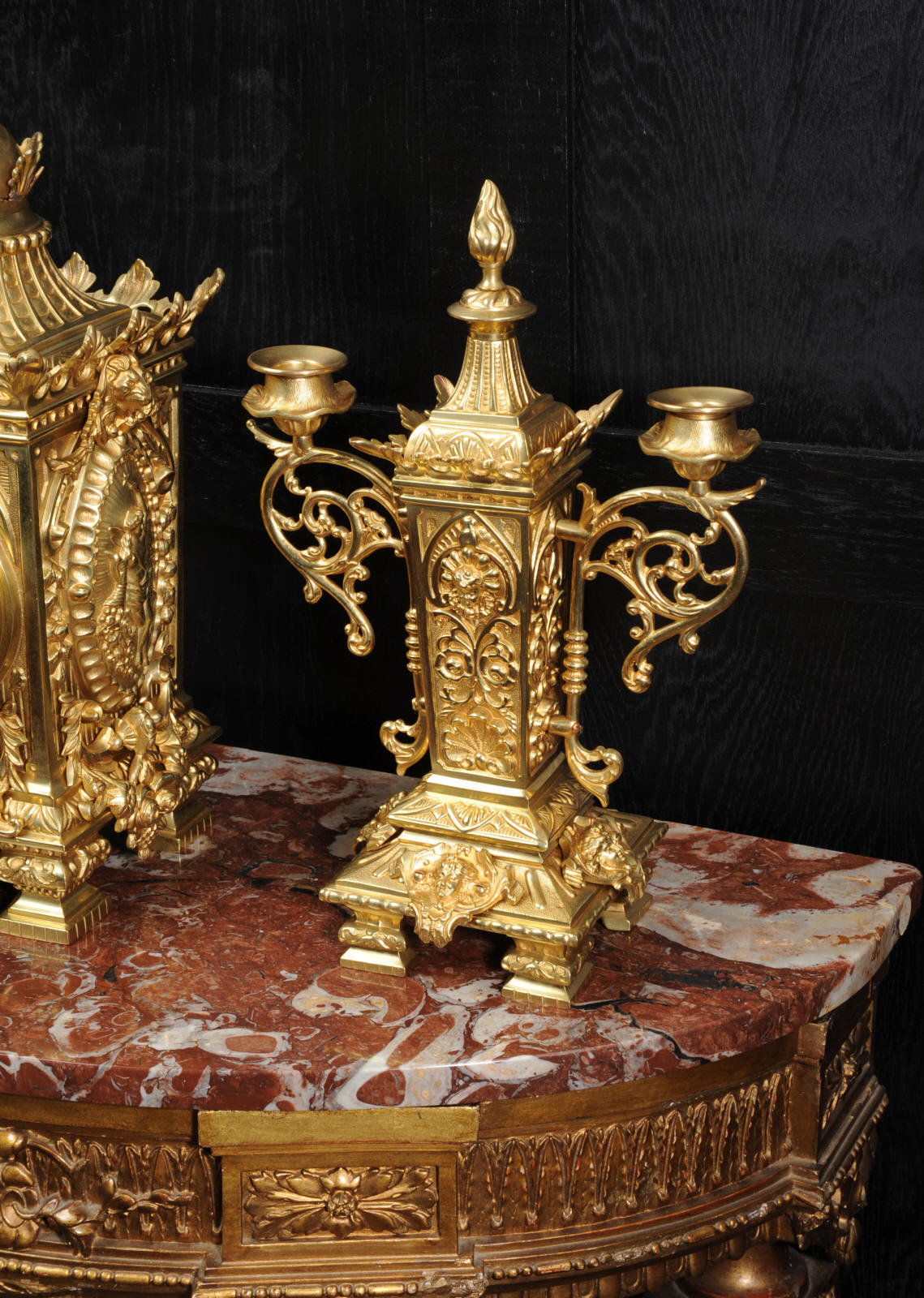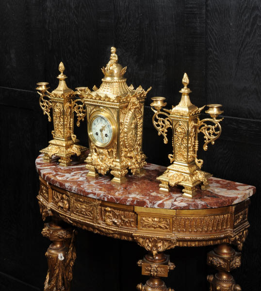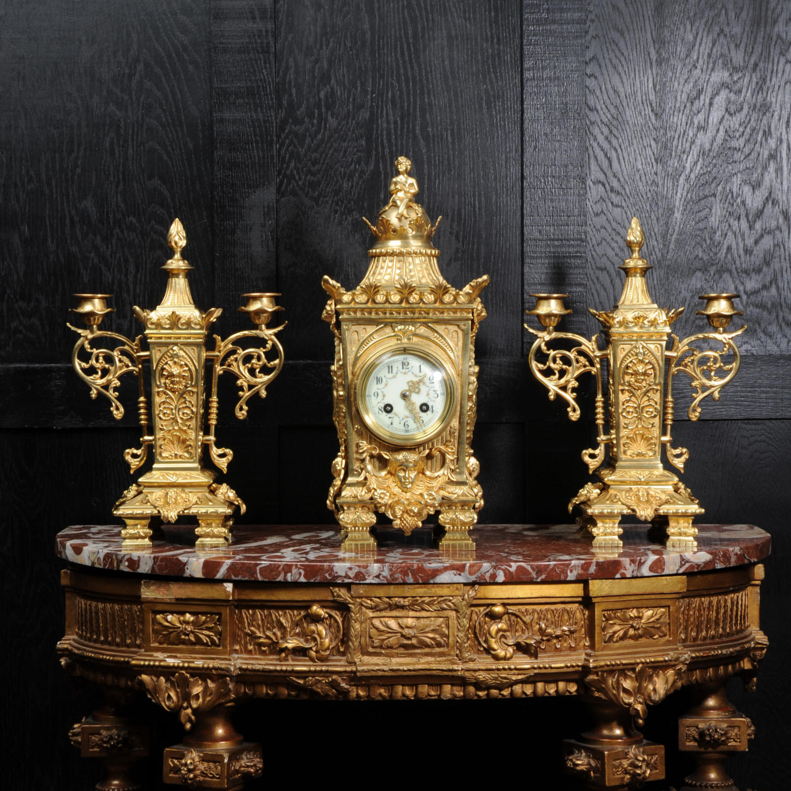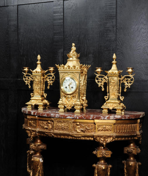 The dial cream porcelain enamel on copper with delicate floral swags and finely cut gilt hands. The French movement is by Japy Freres and is of high quality. It is in excellent clean and running condition having been fully overhauled by our clockmaker. Pendulum is a replacement. It runs for 8 days and strikes the hours and halves on a sonorous coiled gong. Click the video clip below to hear the gong and watch the clock running! Condition of the case is excellent, the original gilding is beautifully clean and bright with hardly any wear or discolouration and there are no losses. The dial is also in excellent condition just some tiny nibbles to the winding holes and a slight mark near the 8 o'clock.