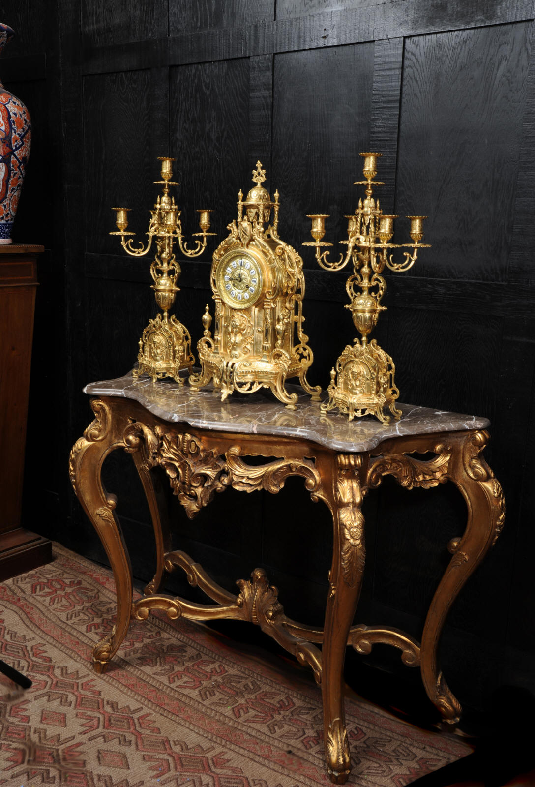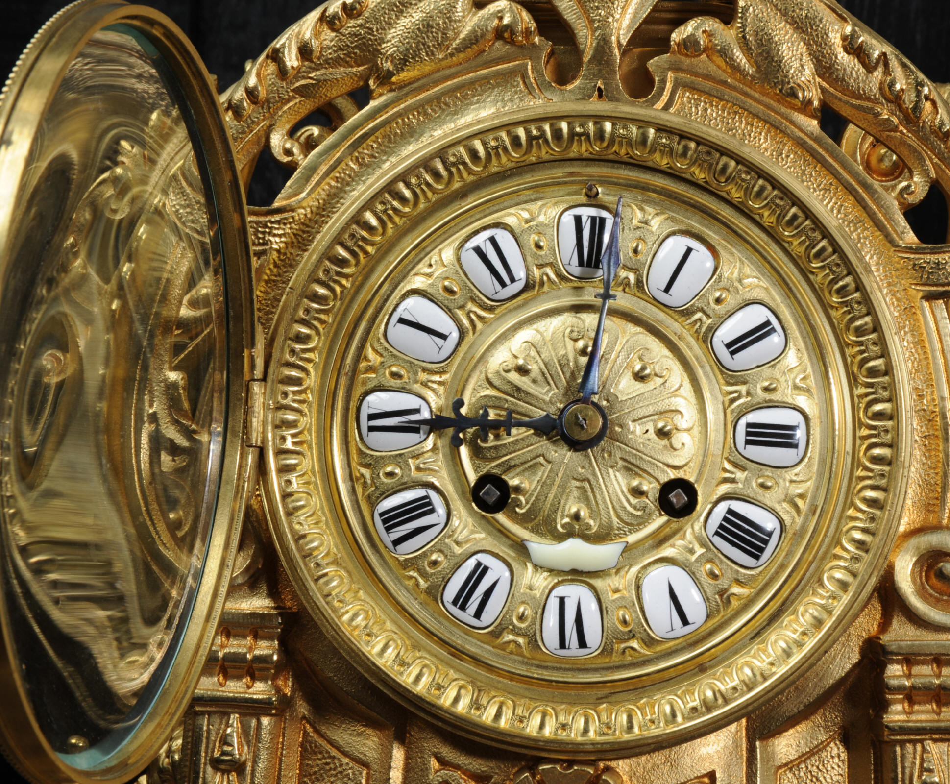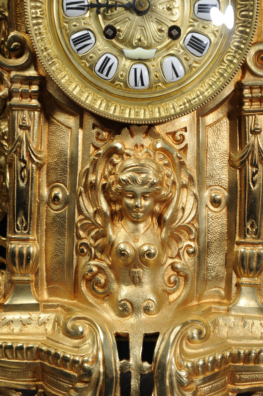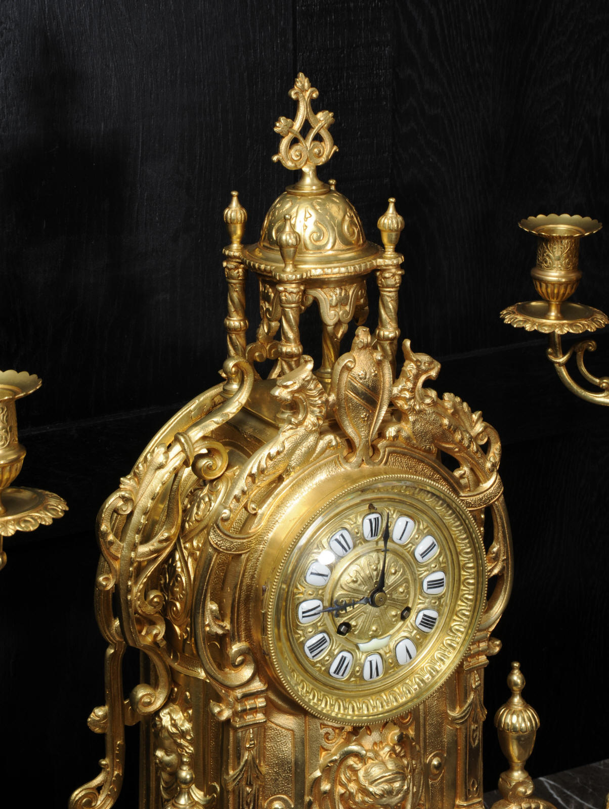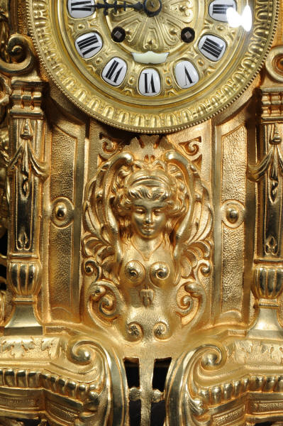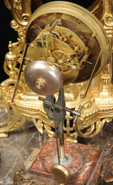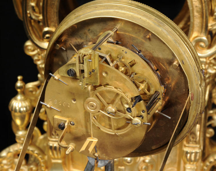 The large dial is gilt bronze mounted with 12 individual porcelain enamel cartouches. It is complete with original blued steel hands and convex glass. The French movement is of high quality and is in excellent clean and running condition having been fully overhauled by our clockmaker. Pendulum is a replacement. It runs for 8 days and strikes the hours and halves on a bell. Click the video clip below to hear the bell and watch the clock running!
