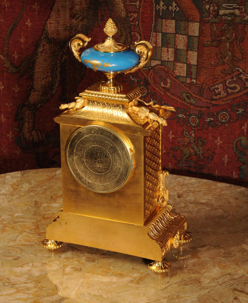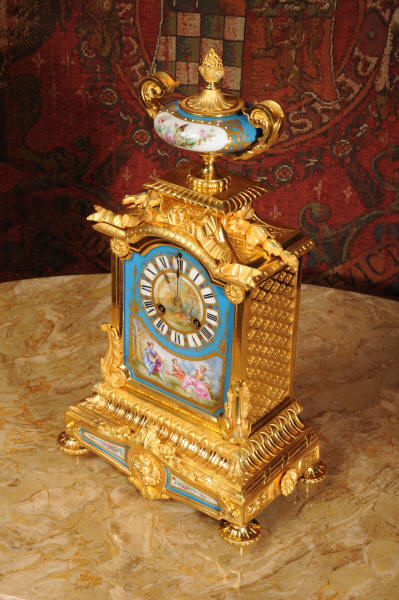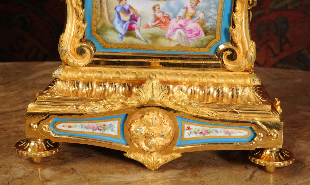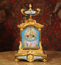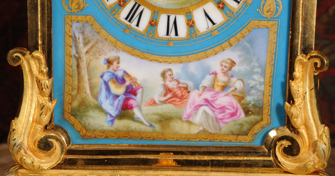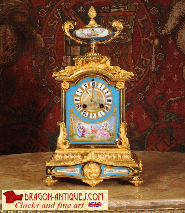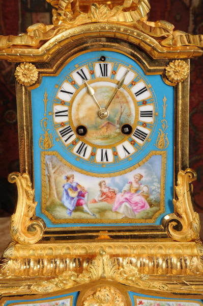 The dial has a tranquil scene of a house by a lake and the urn is decorated with the finest flowers and a butterfly. Delicate 'jewel' are applied as half hour markers between the lettering and the urn has white 'jewels' around the painted panel. The French movement is of very high quality as one would expect of Japy Freres. It has the Japy Freres 'Grande Medaille d'Honneur' mark on the movement backplate. It is in excellent clean and running condition having been fully serviced by our clockmaker. Pendulum is original. It runs for 8 days on one wind and strikes the hours and halves on a bell. Click the video clip below to hear the bell and watch the clock running! Condition of the case is superb, original condition with a clean and bright finish, there is some very minor wear to the original gilding and some occasional slight discolouration. The porcelain is in excellent condition with no damage and the vast majority of the over-glaze gilt decoration present. The dial red jewels are all present but some of the white jewels on the urn are missing. The is a fine and very decorative clock to add to your collection.