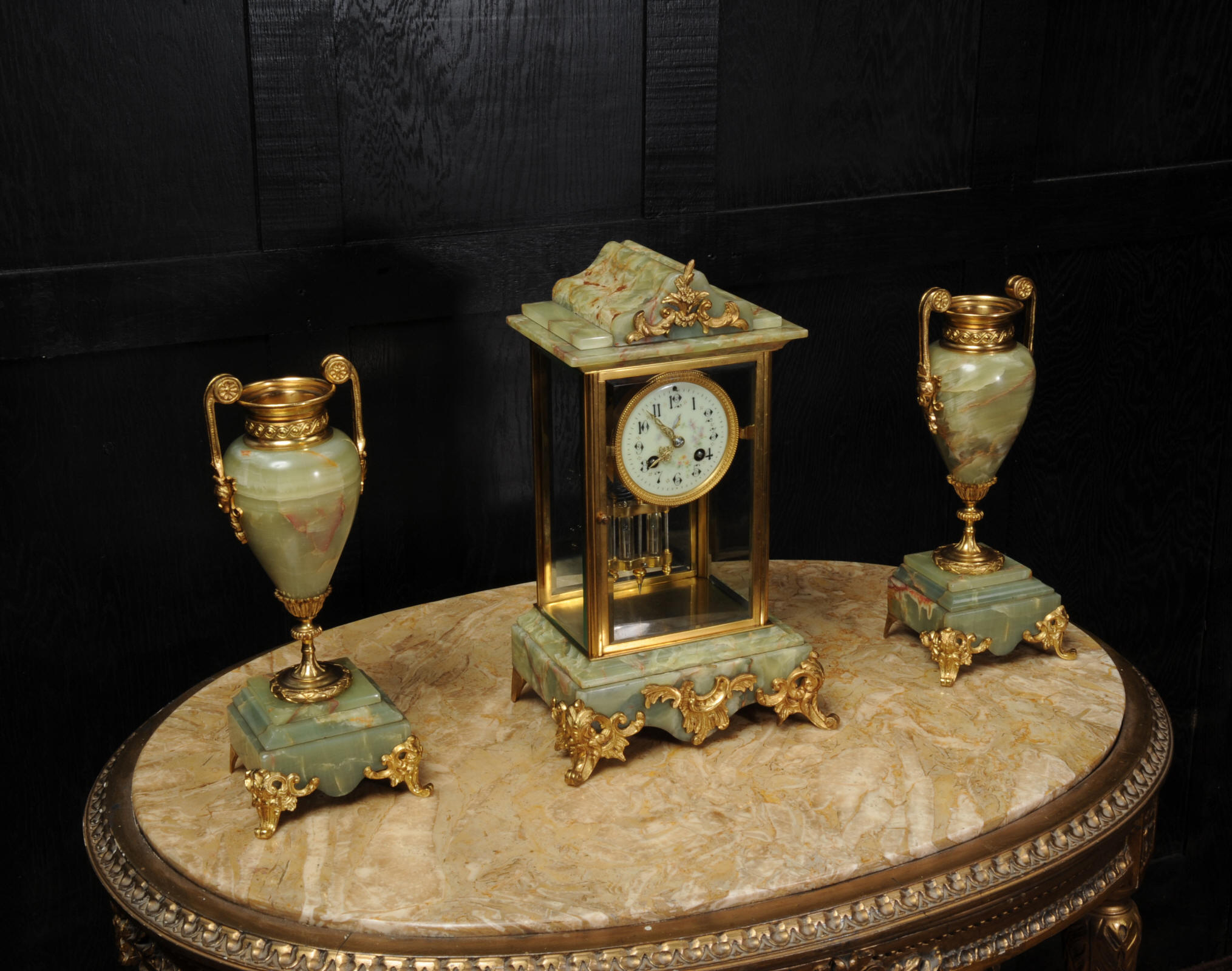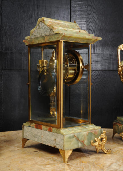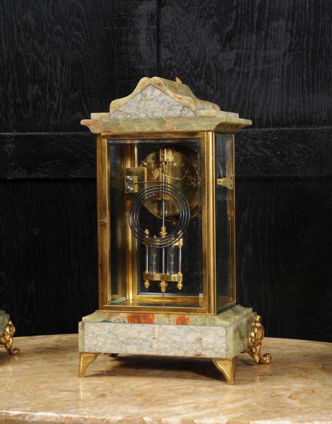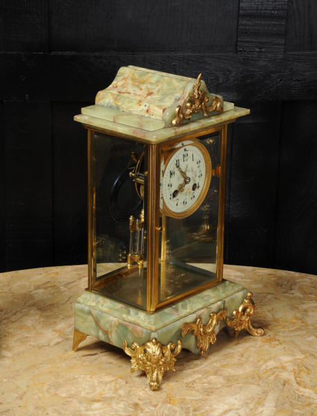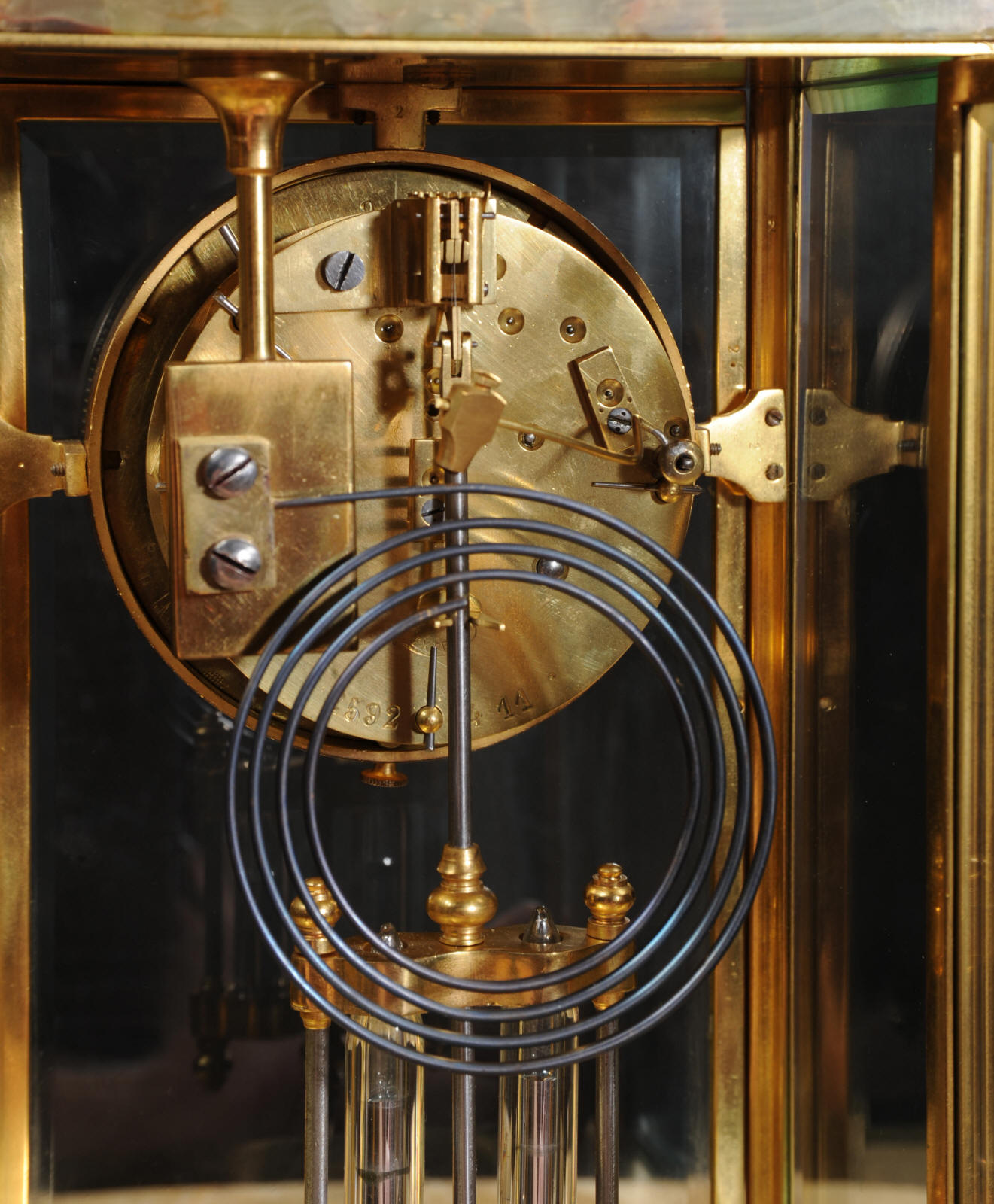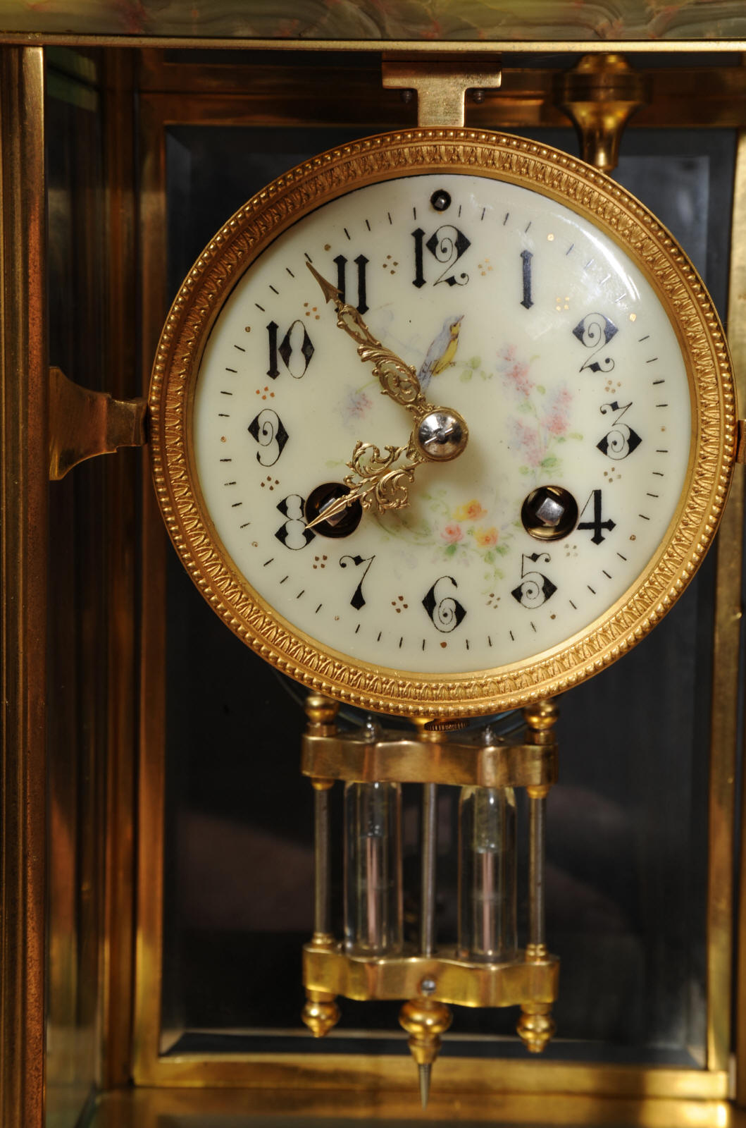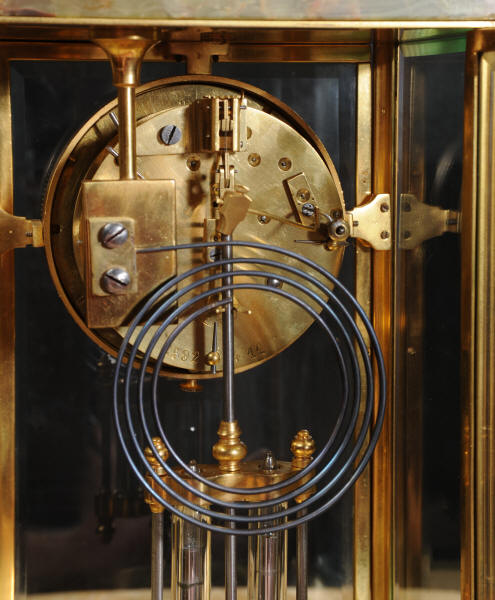 The dial is porcelain enamel on copper, delicately decorated with floral swags and a bird. It is complete with it's original finely fretted gilt brass hands. The French movement is of high quality and is in excellent clean and running condition having been fully overhauled by our clockmaker. Mercury compensated pendulum is original. It runs for 8 days and strikes the hours and halves on a coiled gong. Click the video clip below to hear the bell and watch the clock running!