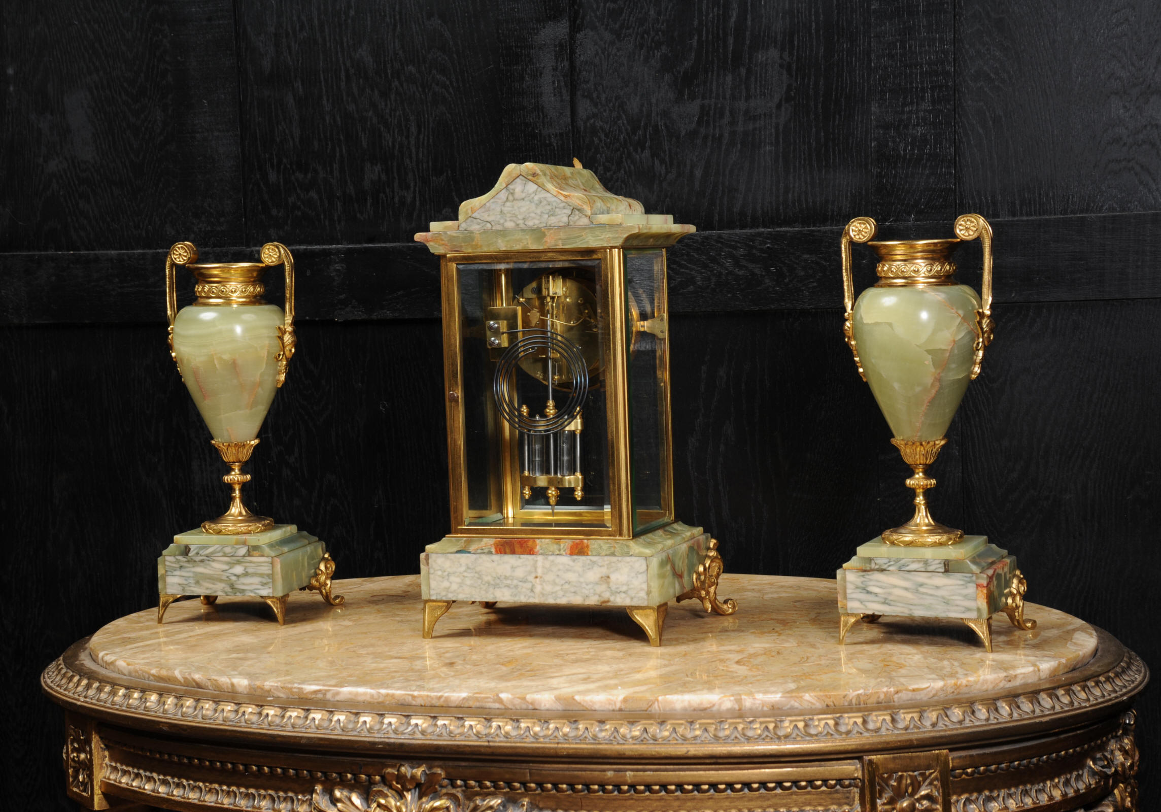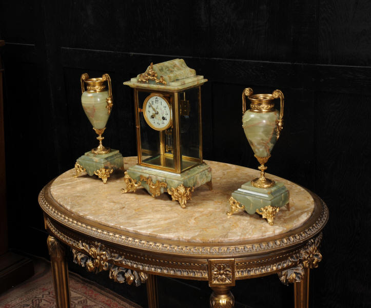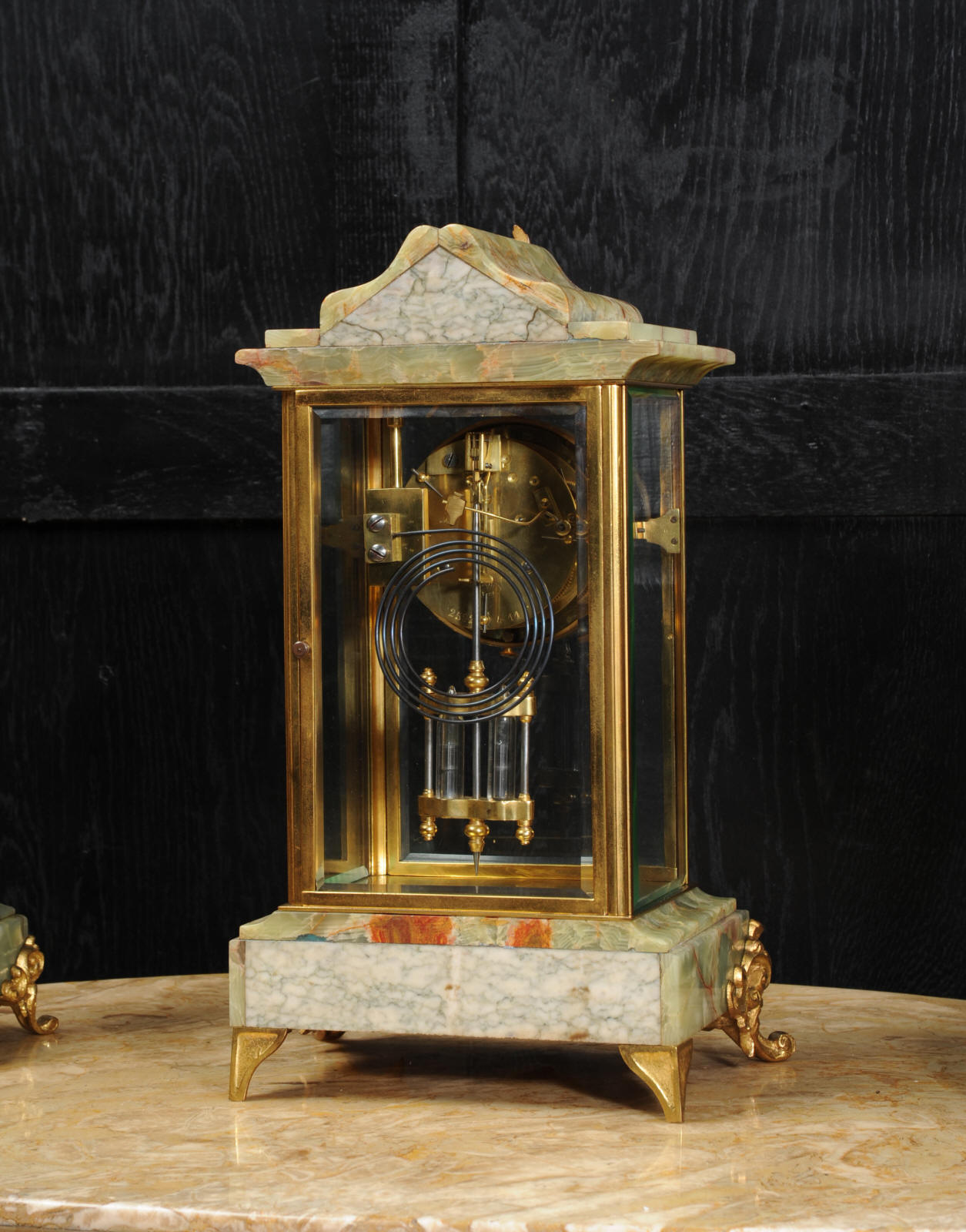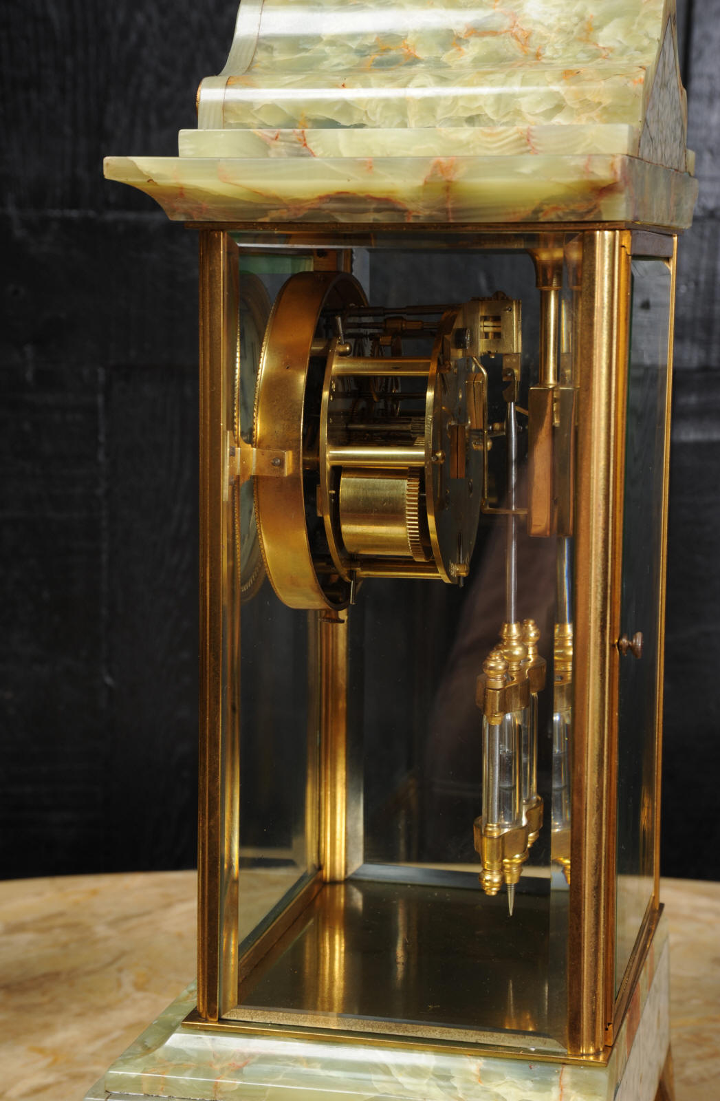 The dial is porcelain enamel on copper, delicately decorated with floral swags and a bird. It is complete with it's original finely fretted gilt brass hands. The French movement is of high quality and is in excellent clean and running condition having been fully overhauled by our clockmaker. Mercury compensated pendulum is original. It runs for 8 days and strikes the hours and halves on a coiled gong. Click the video clip below to hear the bell and watch the clock running!