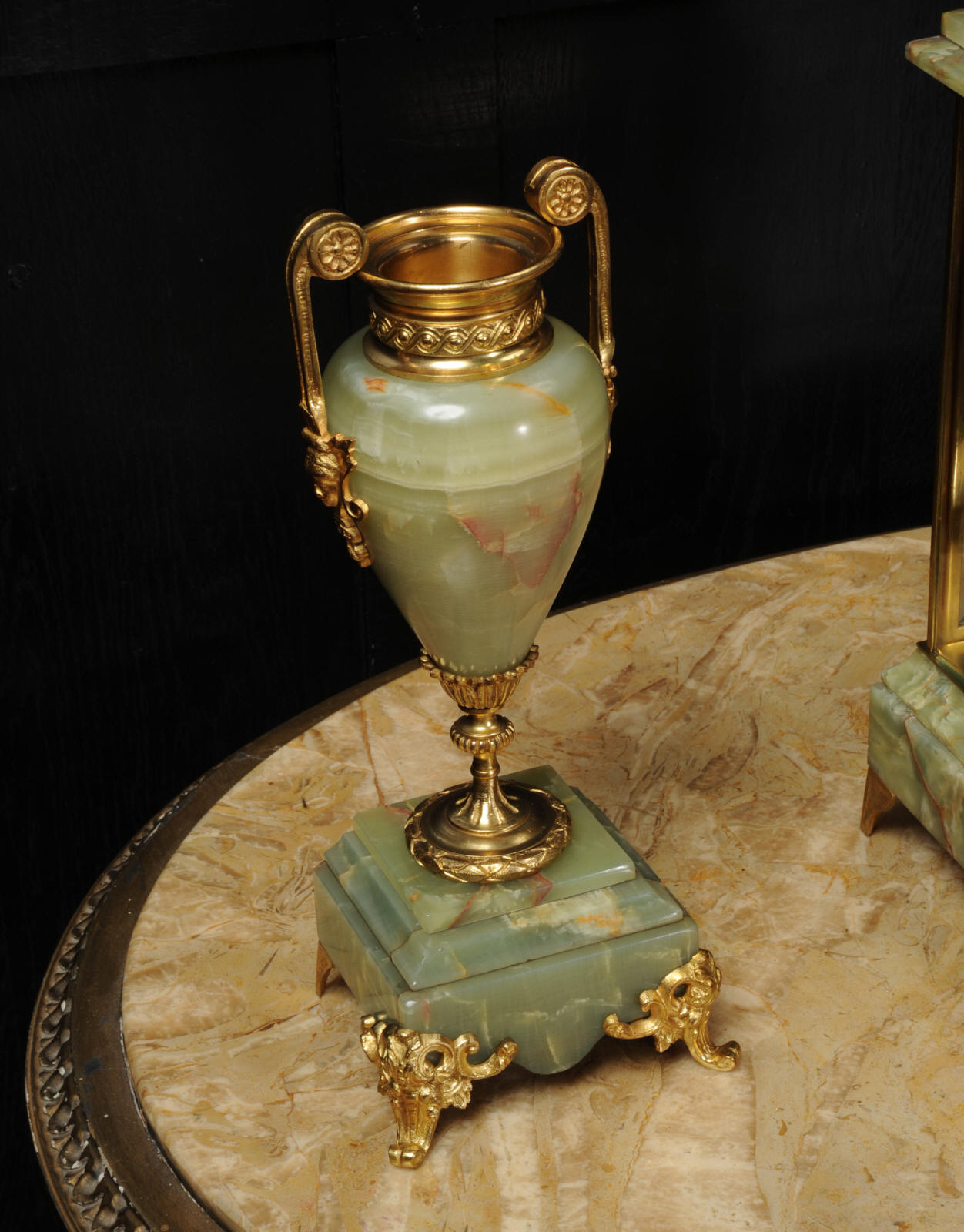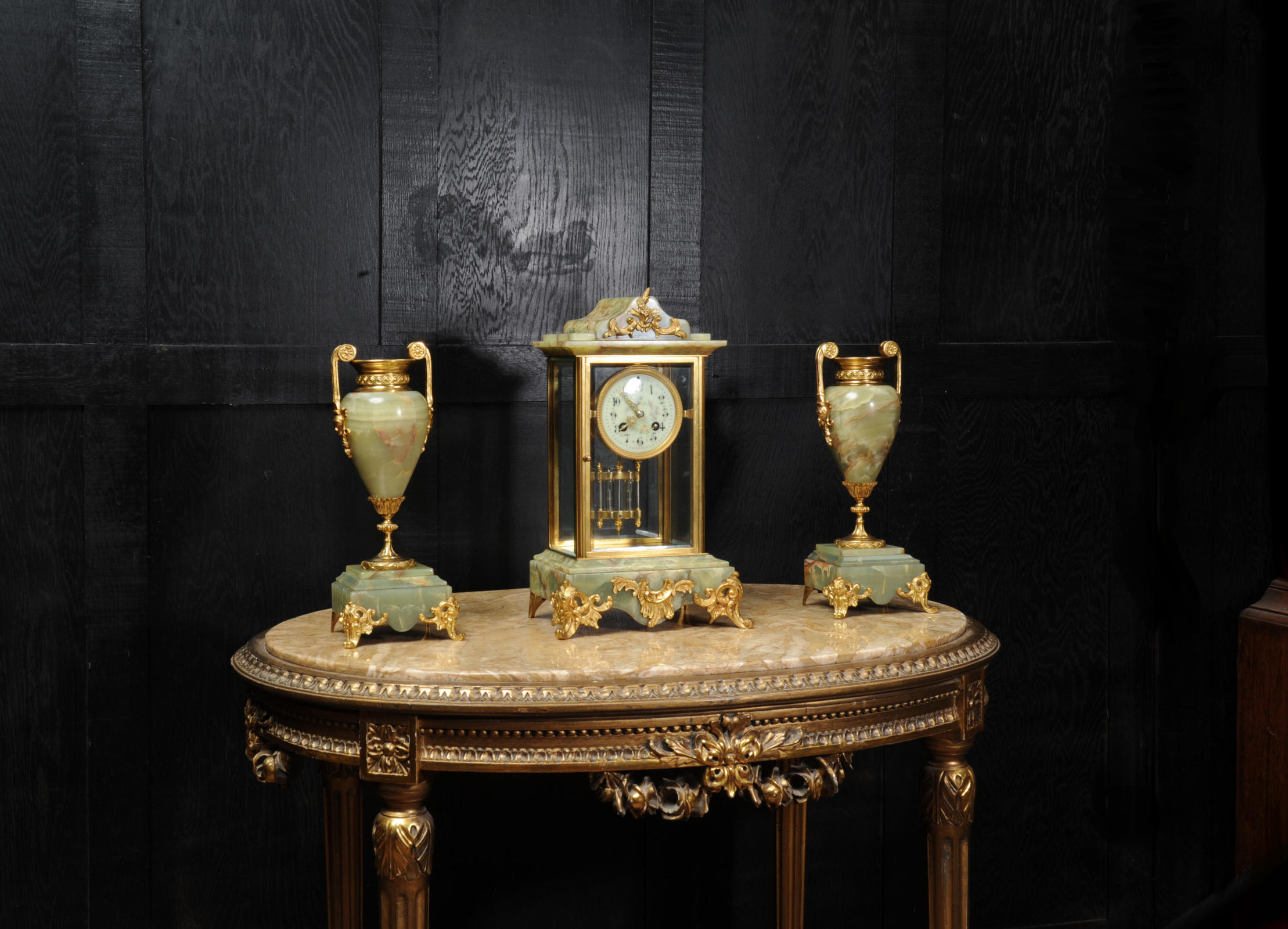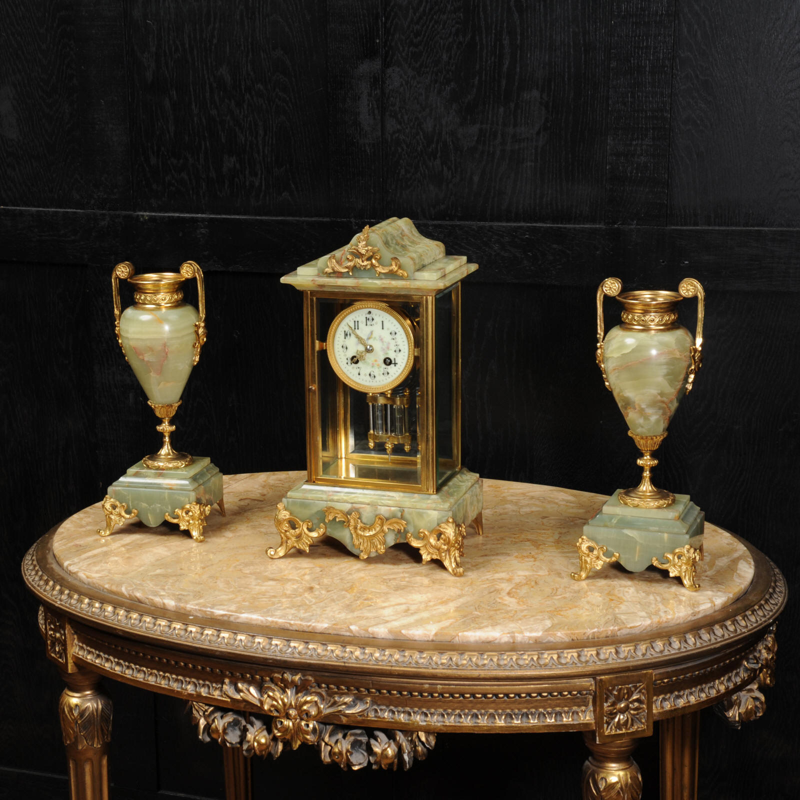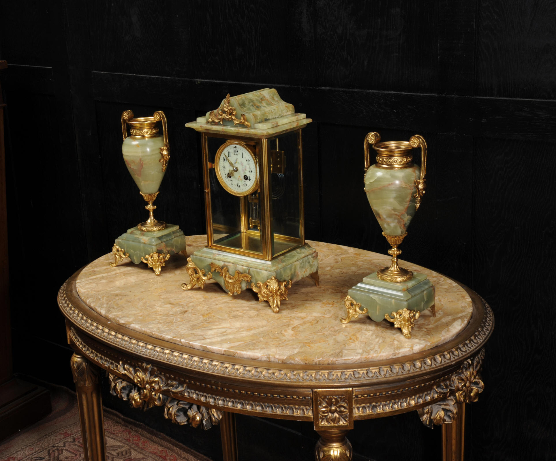 The dial is porcelain enamel on copper, delicately decorated with floral swags and a bird. It is complete with it's original finely fretted gilt brass hands. The French movement is of high quality and is in excellent clean and running condition having been fully overhauled by our clockmaker. Mercury compensated pendulum is original. It runs for 8 days and strikes the hours and halves on a coiled gong. Click the video clip below to hear the bell and watch the clock running!