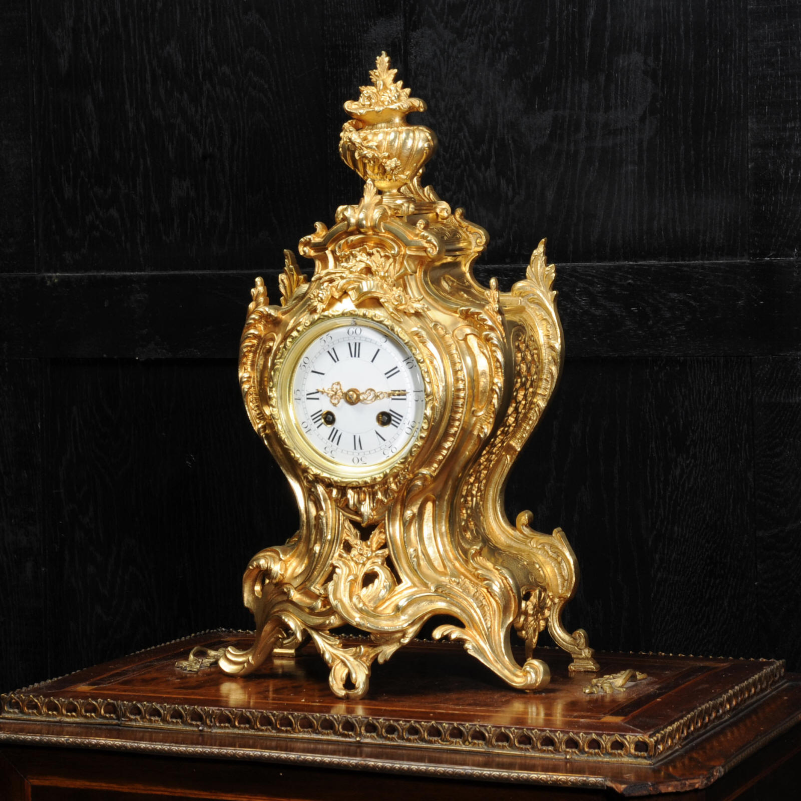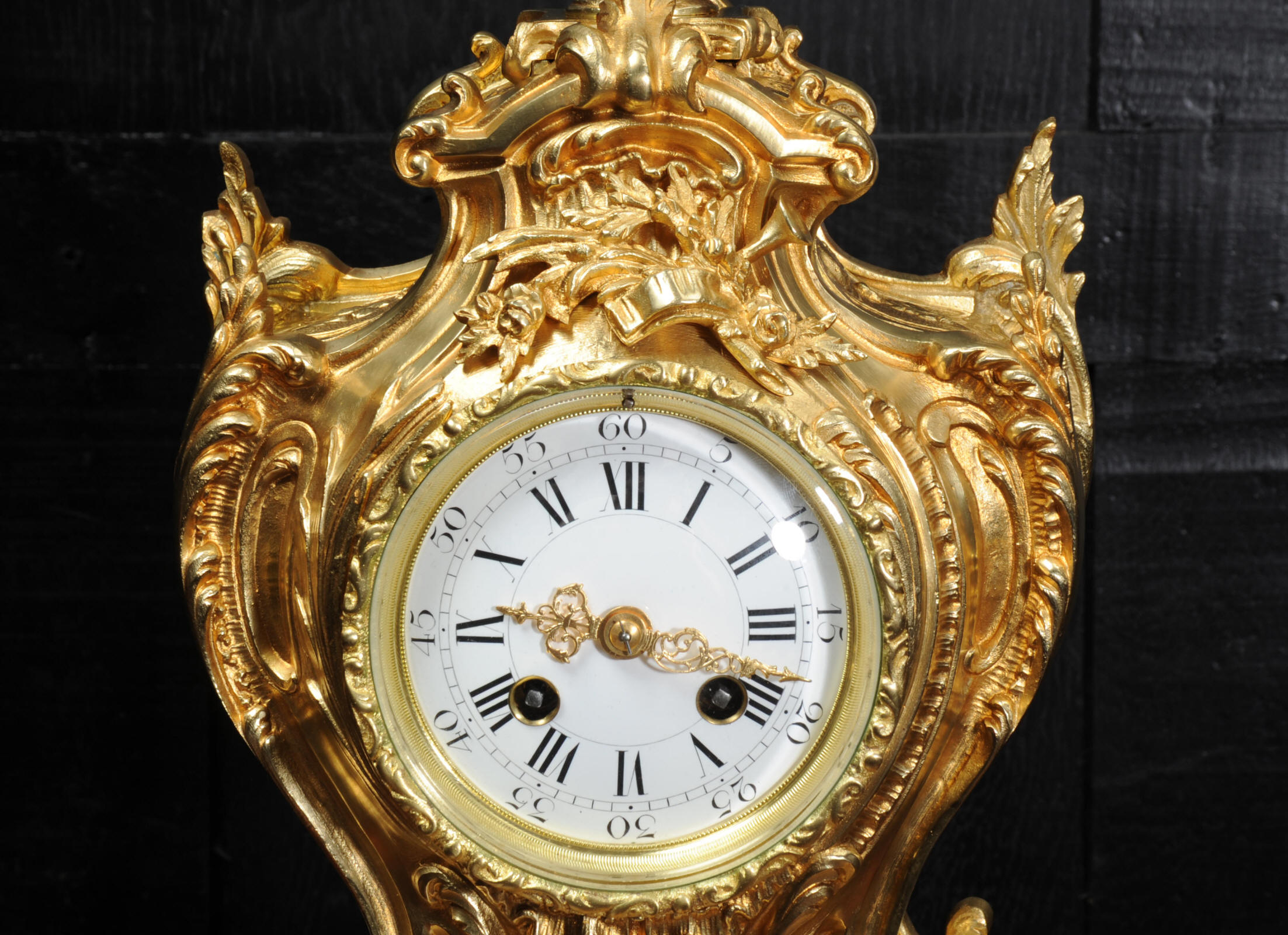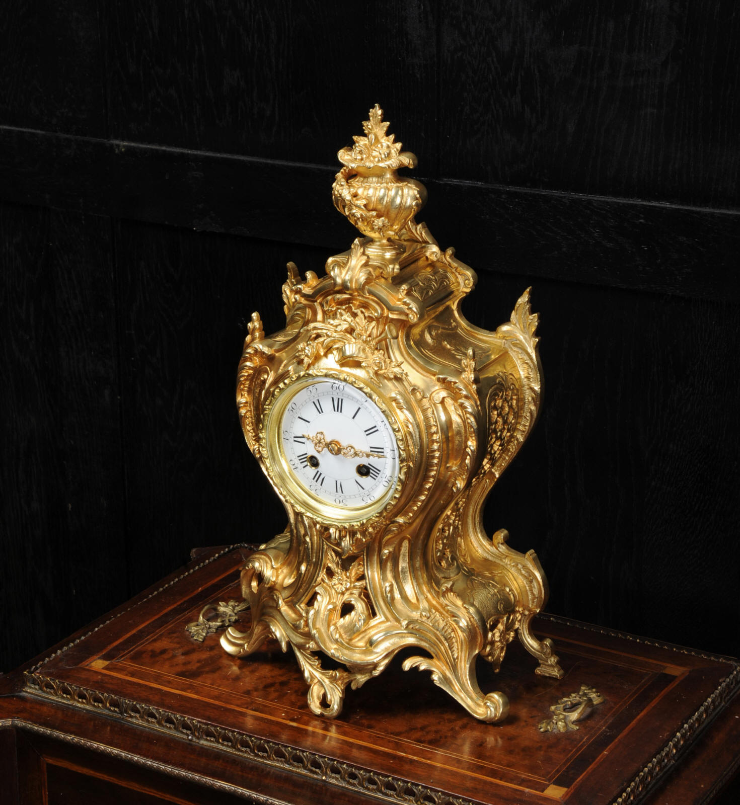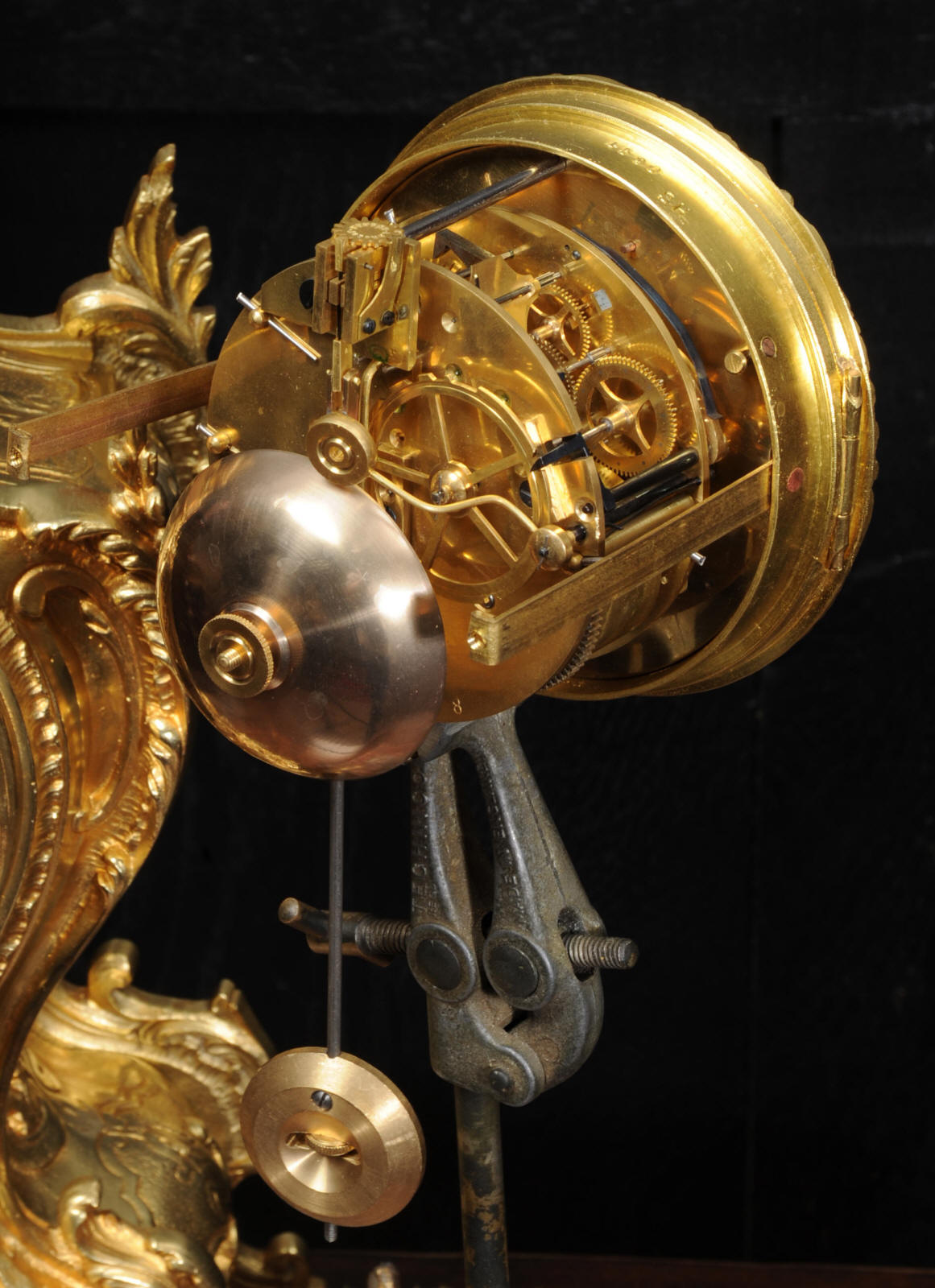 The dial is porcelain enamel on copper with delicately cut gilt hands and separate minute ring. The rear door is glazed with frosted glass. The French movement is of high quality and has the Vincenti mark on the backplate. It is in excellent clean and running condition having been fully overhauled by our clockmaker. Pendulum is a replacement. It runs for 8 days and strikes the hours and halves on a bell. Click the video clip below to hear the bell and watch the clock running! Condition of the case is excellent, the original gilding is beautifully clean and bright with hardly any wear or discolouration and there are no losses. The dial is also in excellent condition with no damage.