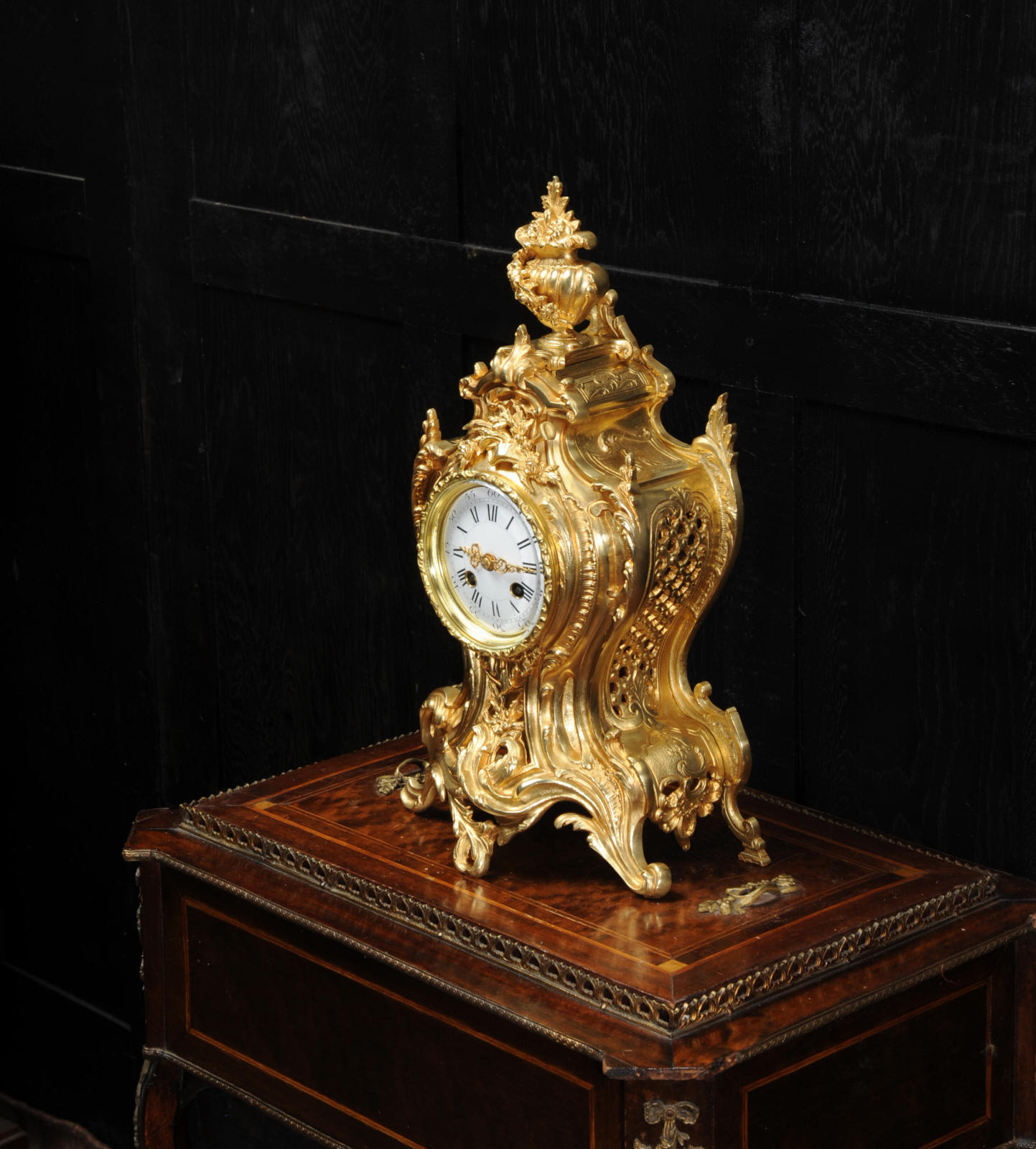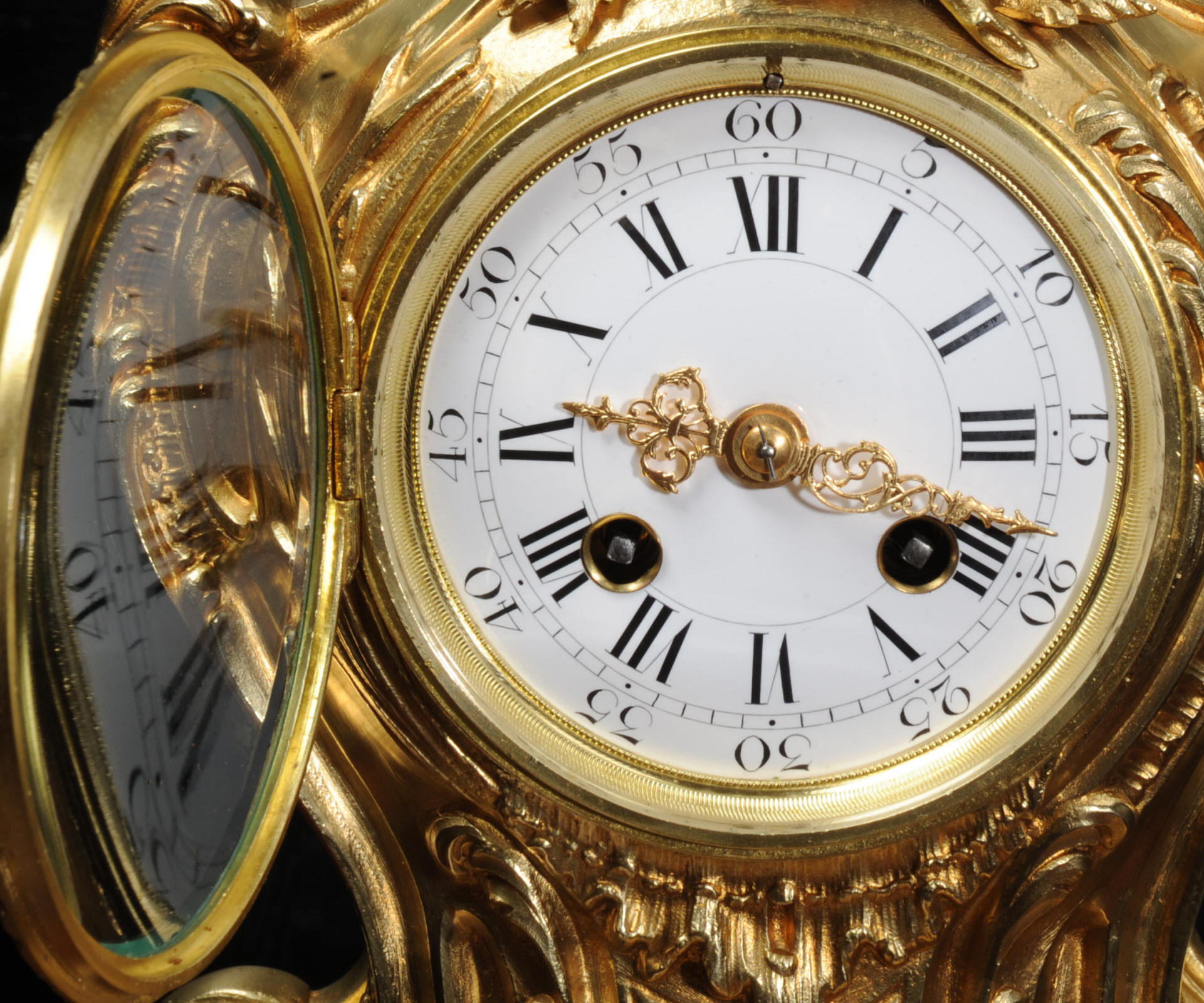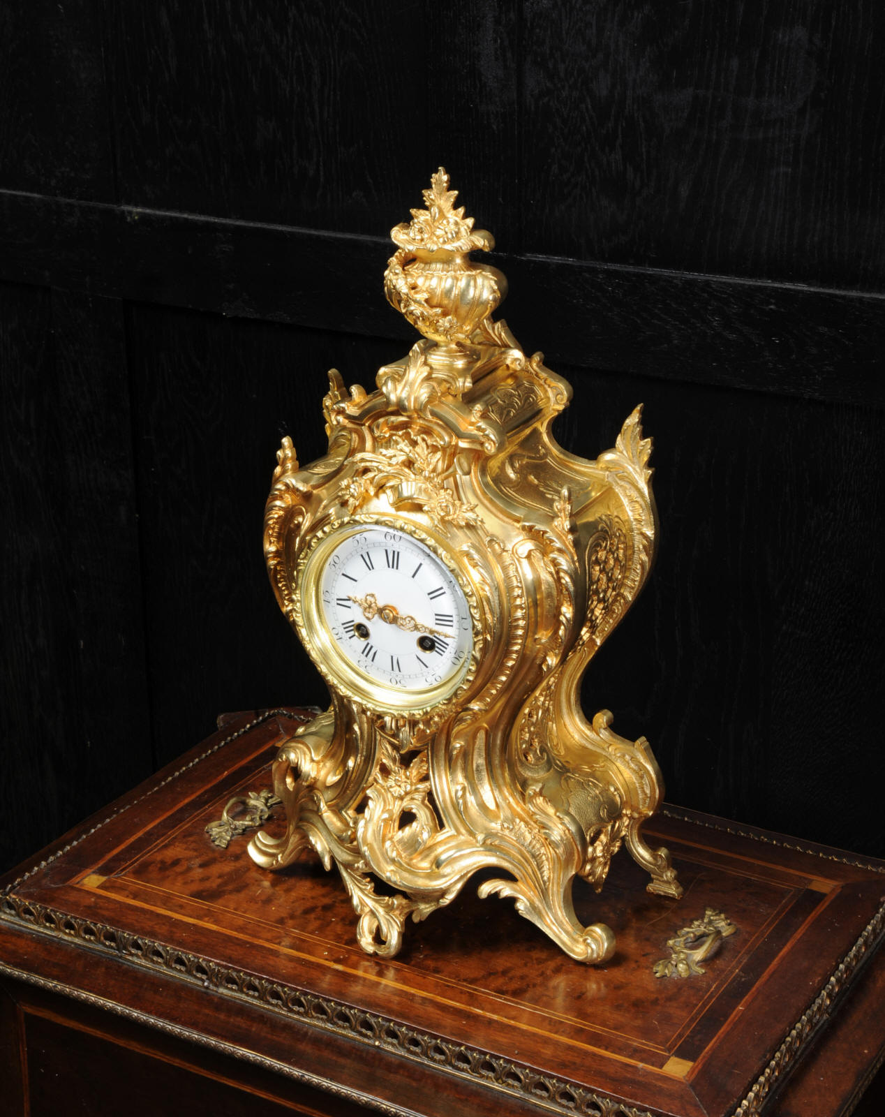 The dial is porcelain enamel on copper with delicately cut gilt hands and separate minute ring. The rear door is glazed with frosted glass. The French movement is of high quality and has the Vincenti mark on the backplate. It is in excellent clean and running condition having been fully overhauled by our clockmaker. Pendulum is a replacement. It runs for 8 days and strikes the hours and halves on a bell. Click the video clip below to hear the bell and watch the clock running! Condition of the case is excellent, the original gilding is beautifully clean and bright with hardly any wear or discolouration and there are no losses. The dial is also in excellent condition with no damage.