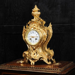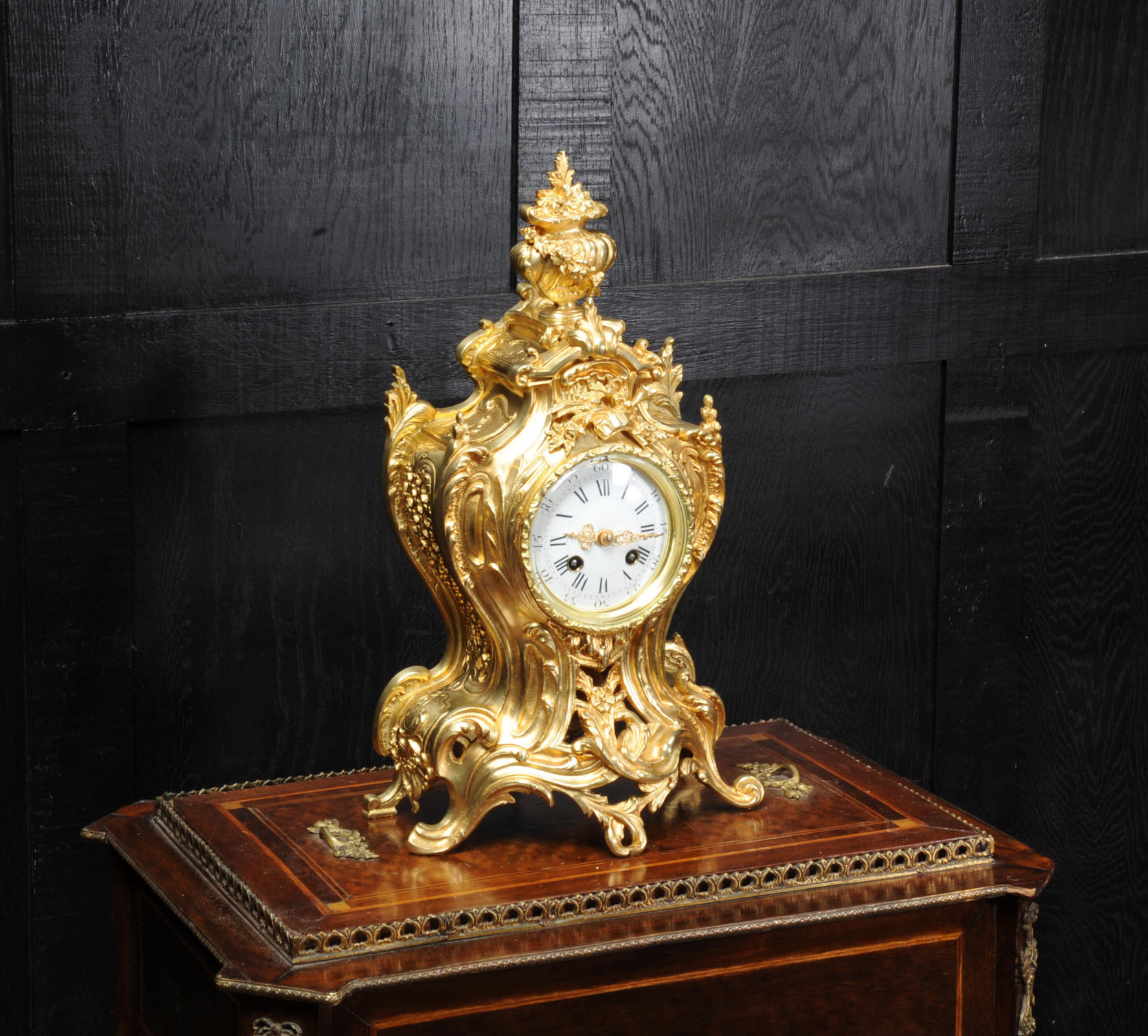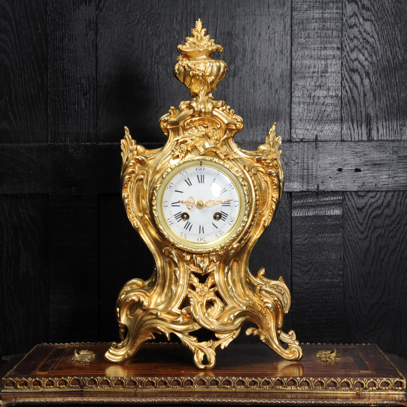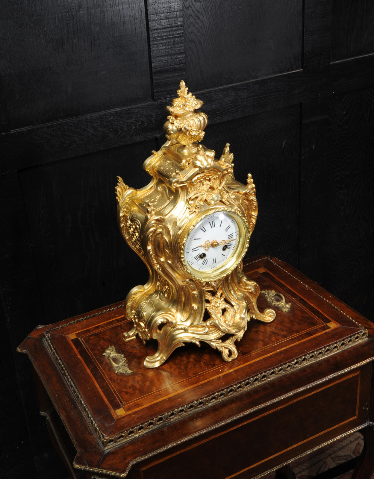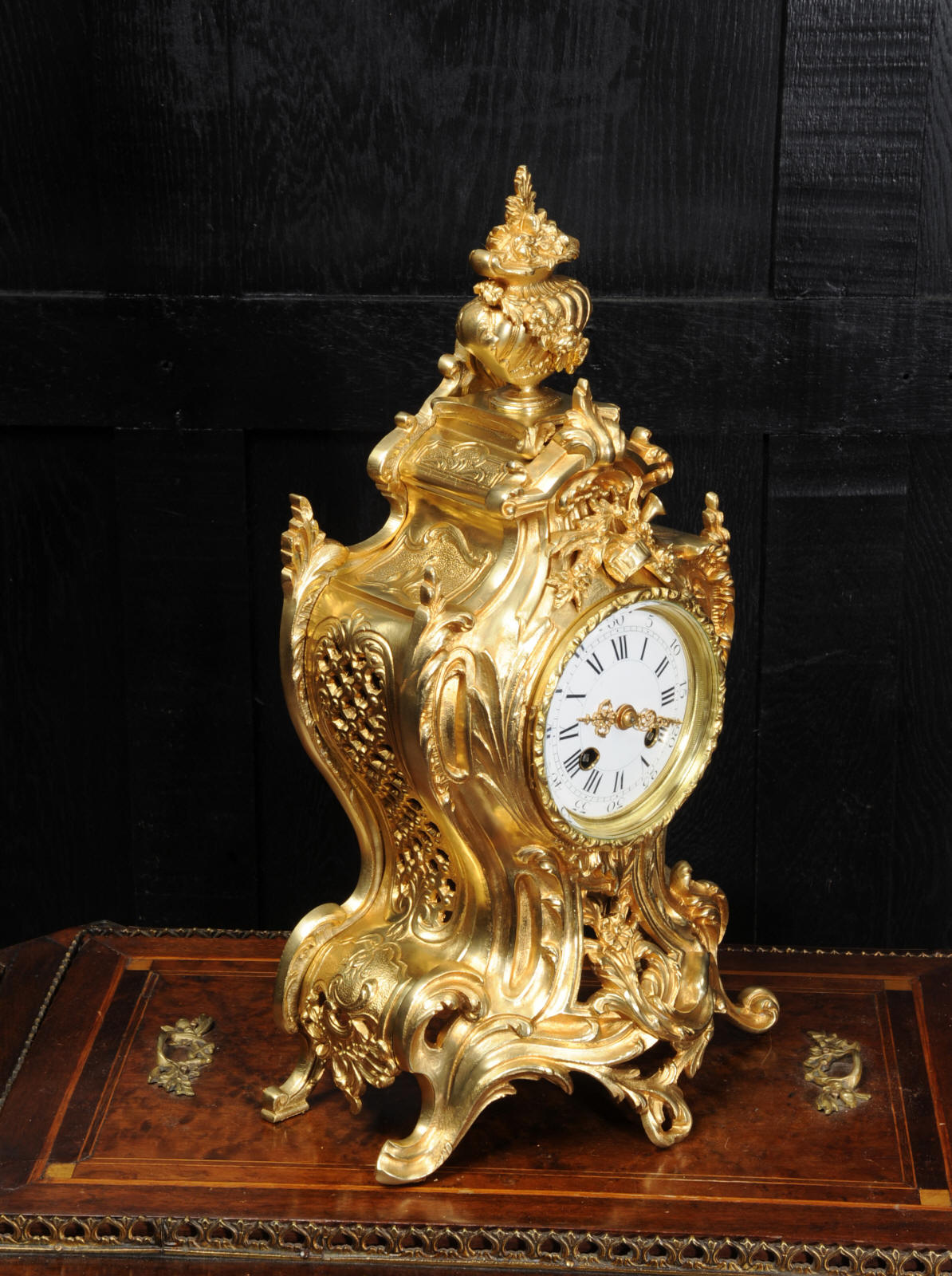 The dial is porcelain enamel on copper with delicately cut gilt hands and separate minute ring. The rear door is glazed with frosted glass. The French movement is of high quality and has the Vincenti mark on the backplate. It is in excellent clean and running condition having been fully overhauled by our clockmaker. Pendulum is a replacement. It runs for 8 days and strikes the hours and halves on a bell. Click the video clip below to hear the bell and watch the clock running! Condition of the case is excellent, the original gilding is beautifully clean and bright with hardly any wear or discolouration and there are no losses. The dial is also in excellent condition with no damage.