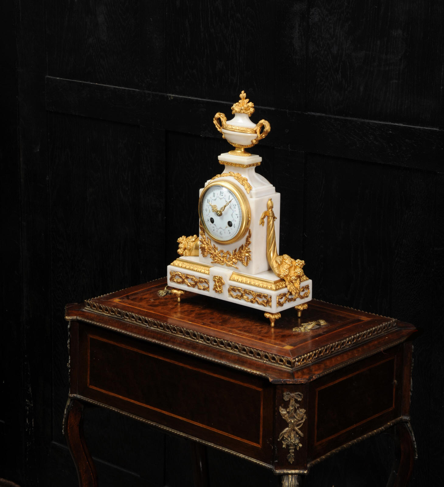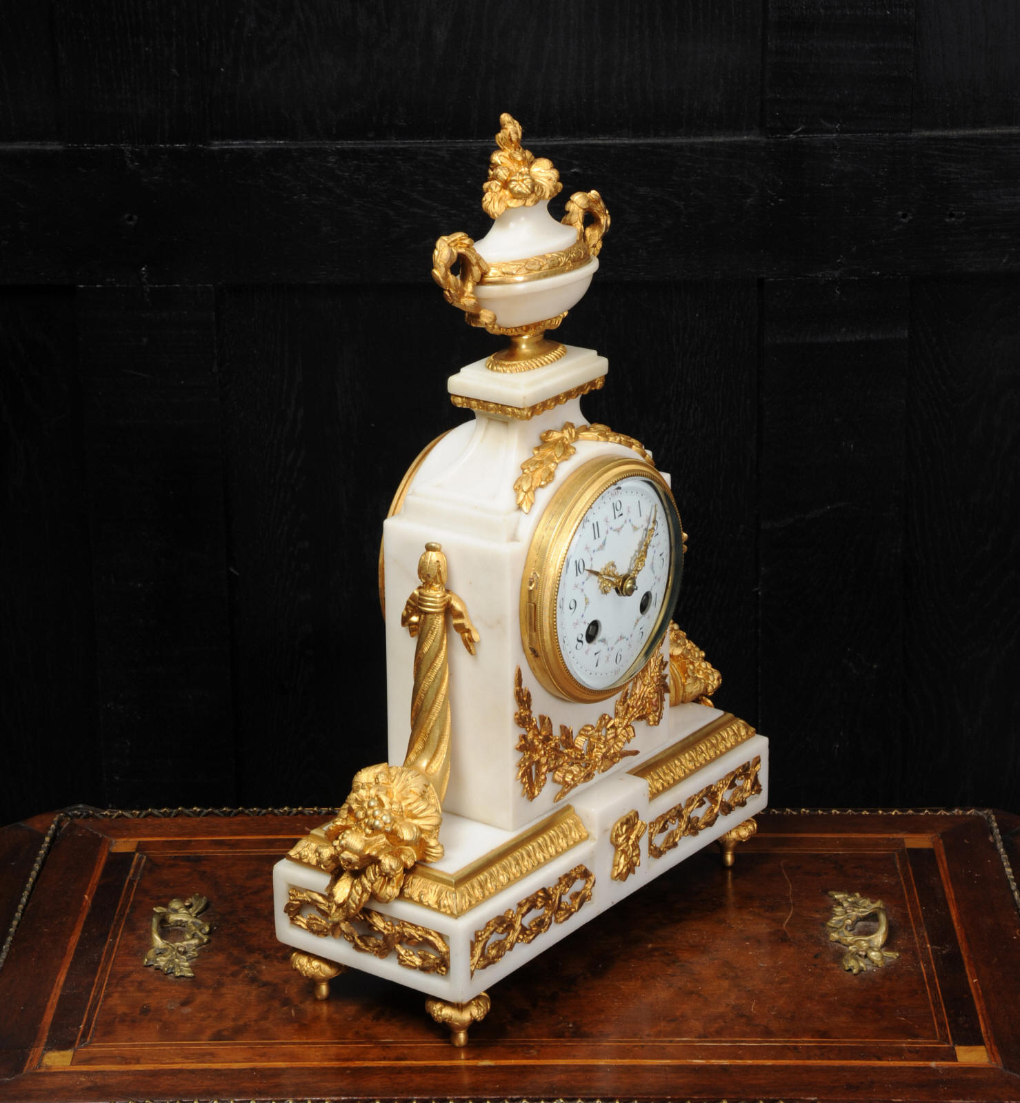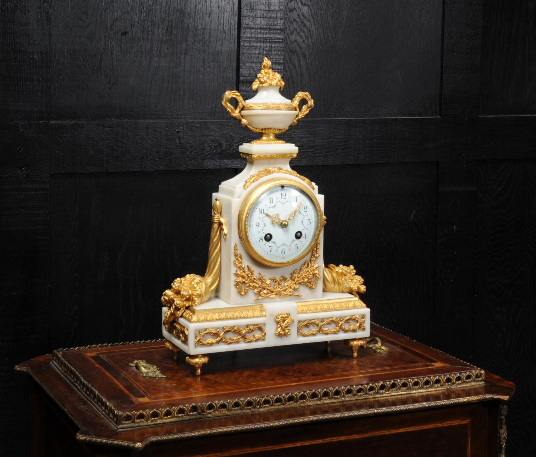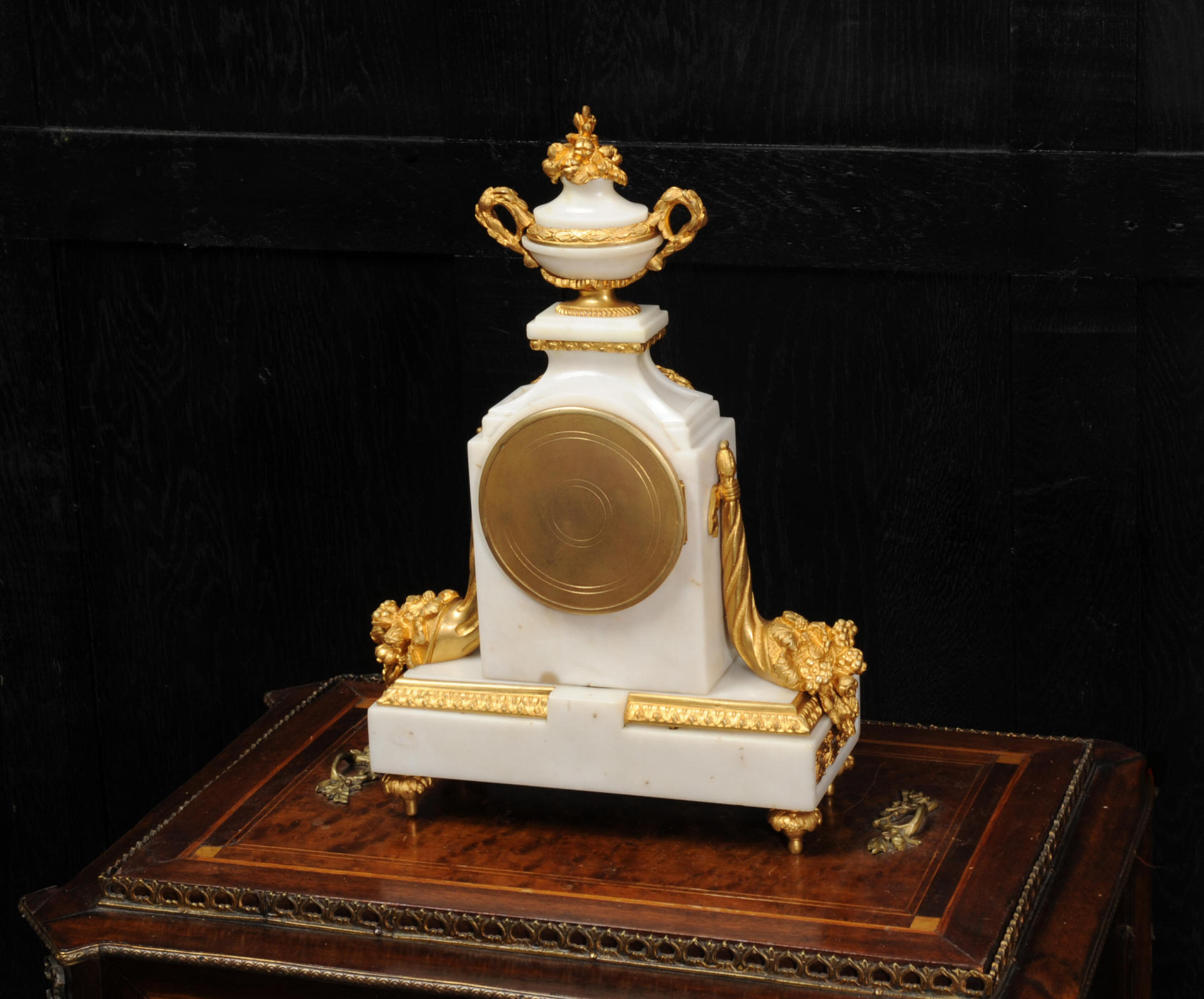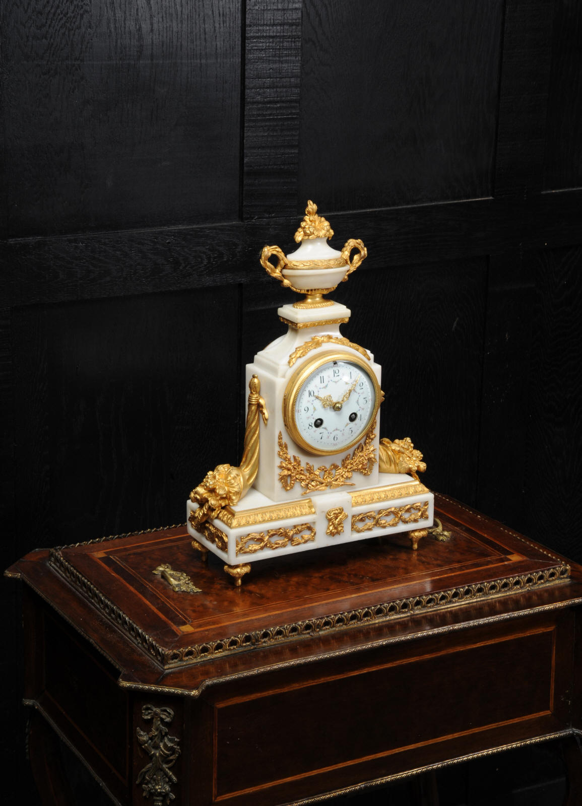 The dial is porcelain enamel on copper with delicate floral swags between the numbers and the original finely fretted gilt brass hands. The French movement is of high quality and has the Samuel Marti mark on the backplate. It is in excellent clean and running condition having been fully overhauled by our clockmaker. Pendulum is a old replacement. It runs for 8 days and strikes the hours and halves on a bell. Click the video clip below to hear the bell and watch the clock running! Condition of the case is excellent, the original gilding is beautifully clean and bright with hardly any wear or discolouration. The dial is also in excellent condition just some tiny nibbles to the winding holes. The marble has a good polish and has mellowed to an off-white over time with some staining and discolouration. There is an occasional small nibble to the edges particularly to the rear.