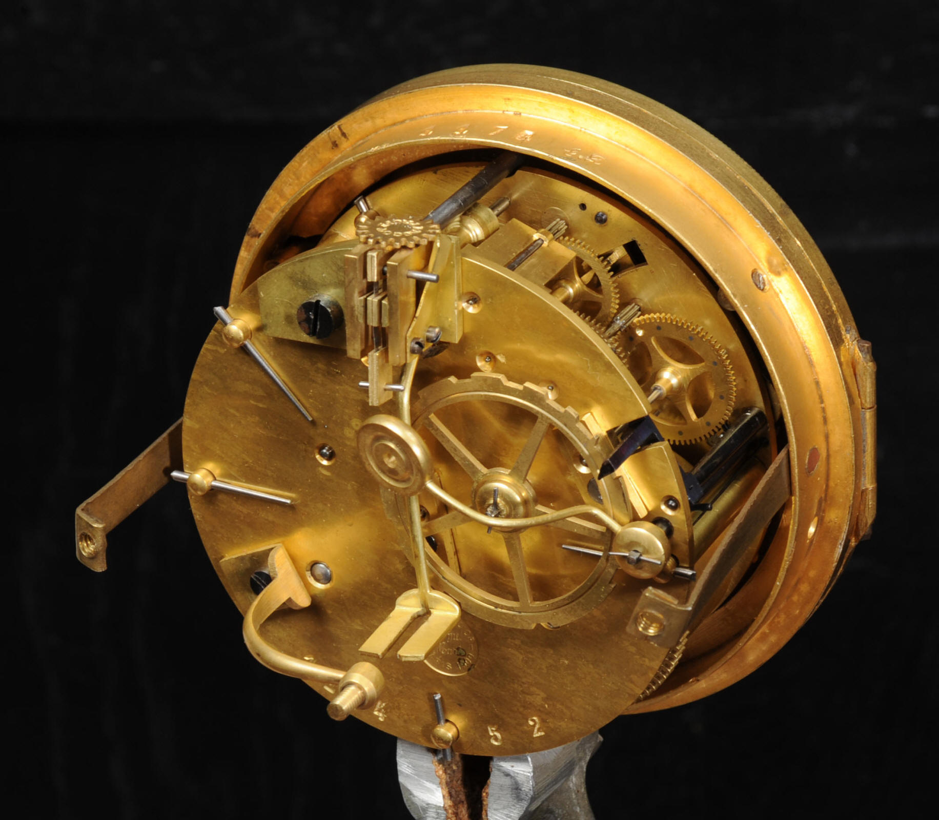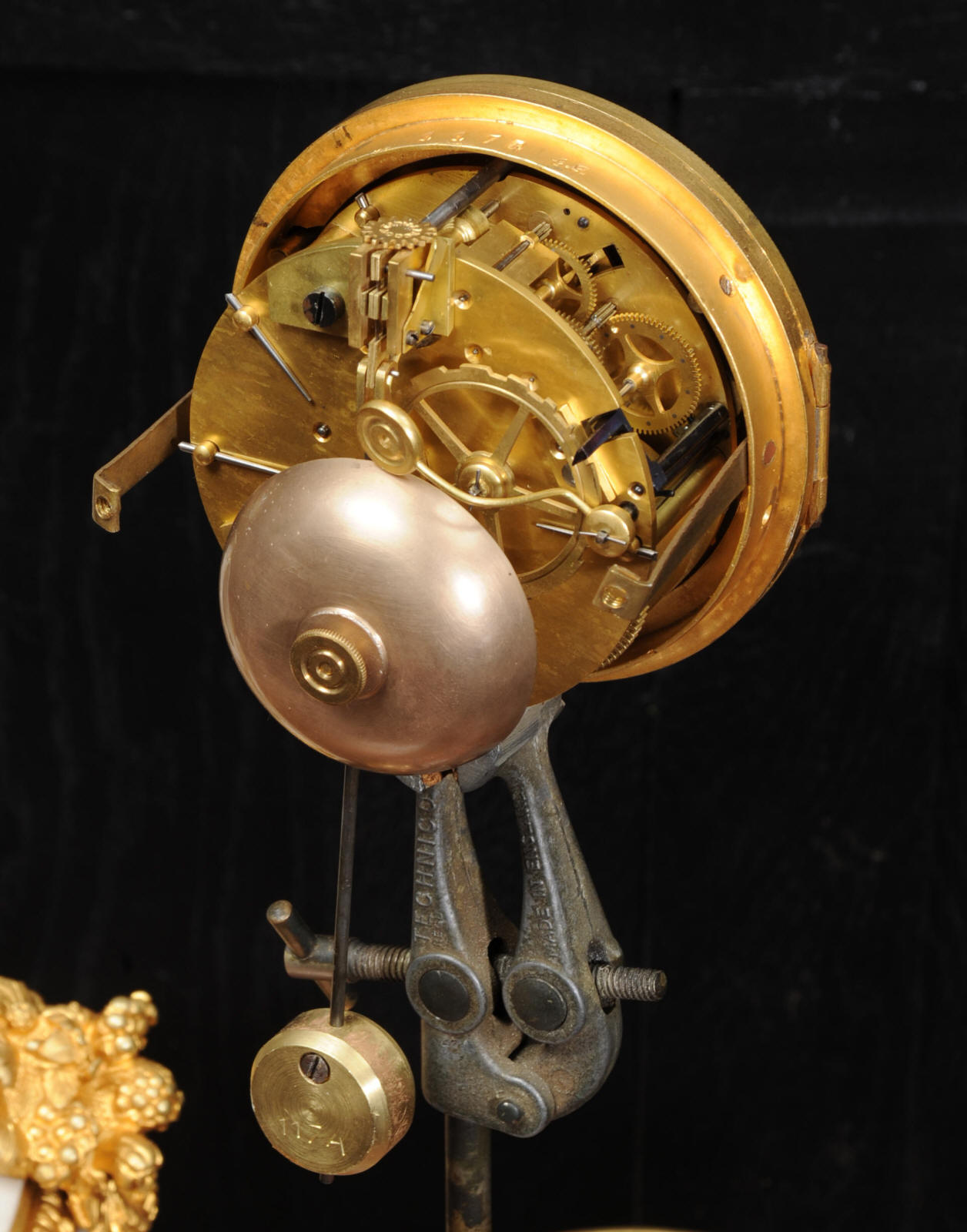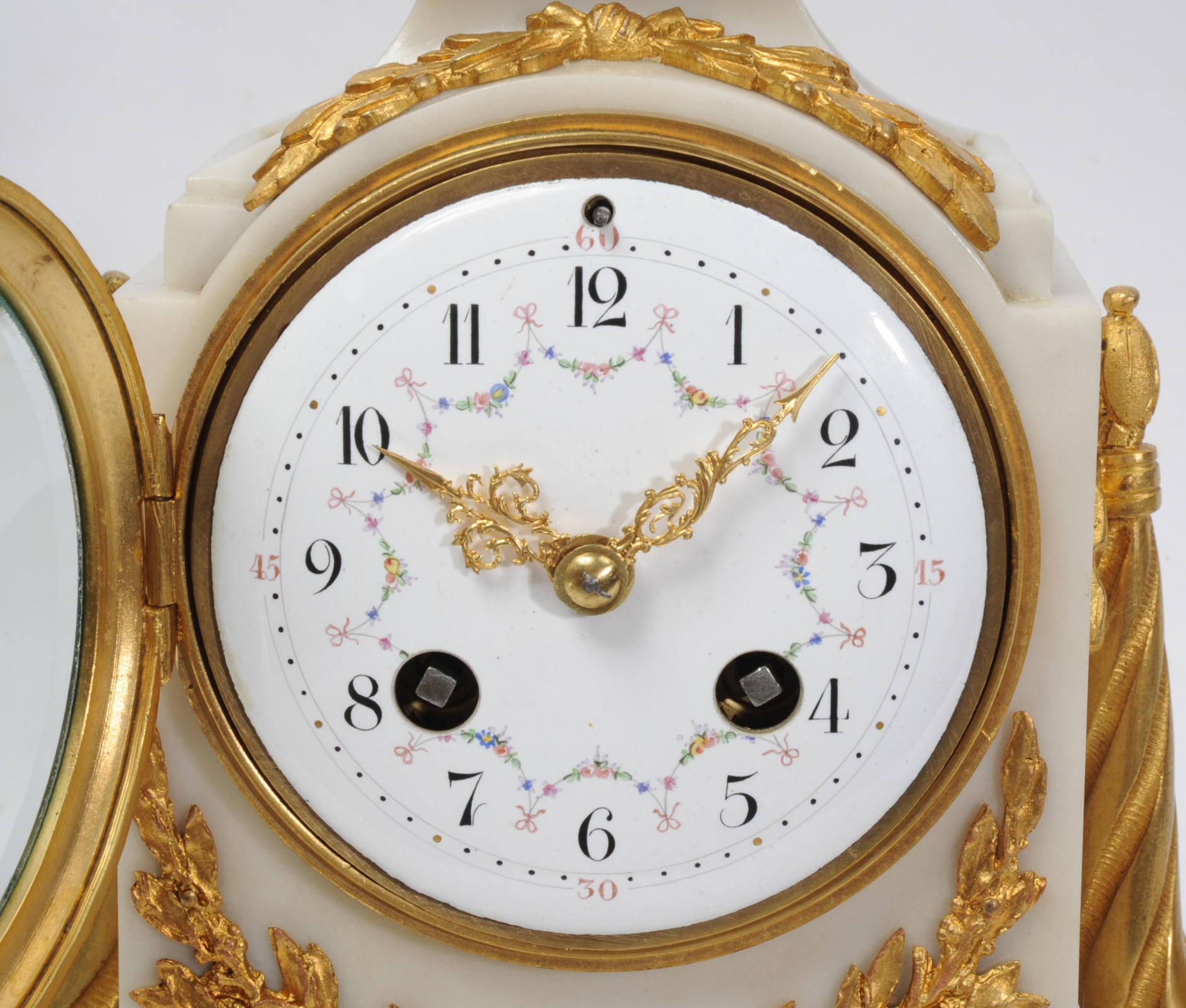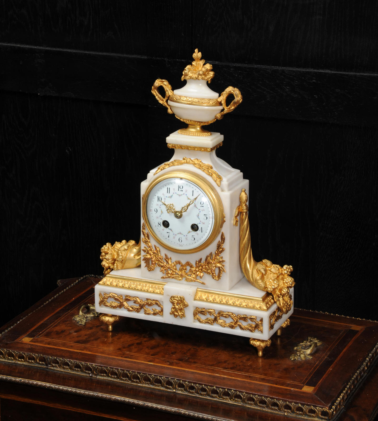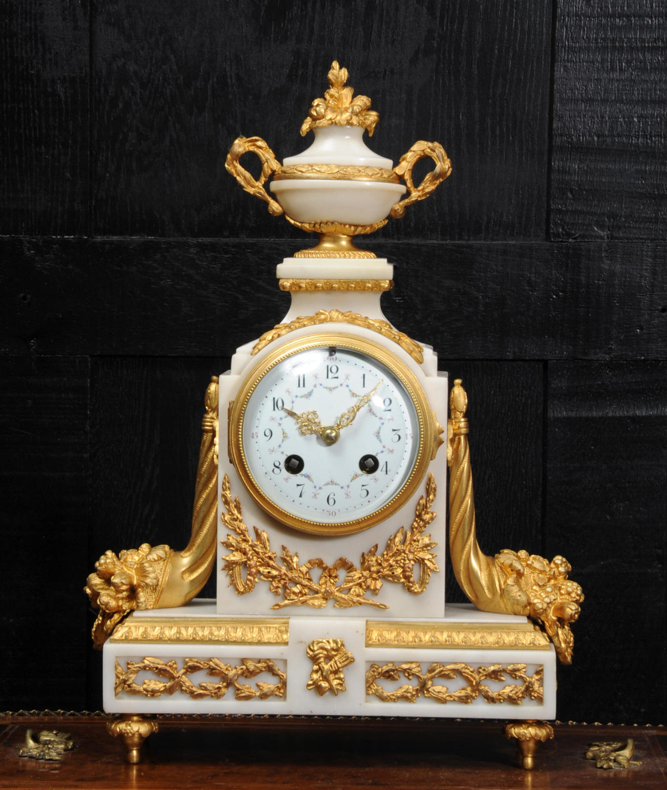 The dial is porcelain enamel on copper with delicate floral swags between the numbers and the original finely fretted gilt brass hands. The French movement is of high quality and has the Samuel Marti mark on the backplate. It is in excellent clean and running condition having been fully overhauled by our clockmaker. Pendulum is a old replacement. It runs for 8 days and strikes the hours and halves on a bell. Click the video clip below to hear the bell and watch the clock running! Condition of the case is excellent, the original gilding is beautifully clean and bright with hardly any wear or discolouration. The dial is also in excellent condition just some tiny nibbles to the winding holes. The marble has a good polish and has mellowed to an off-white over time with some staining and discolouration. There is an occasional small nibble to the edges particularly to the rear.