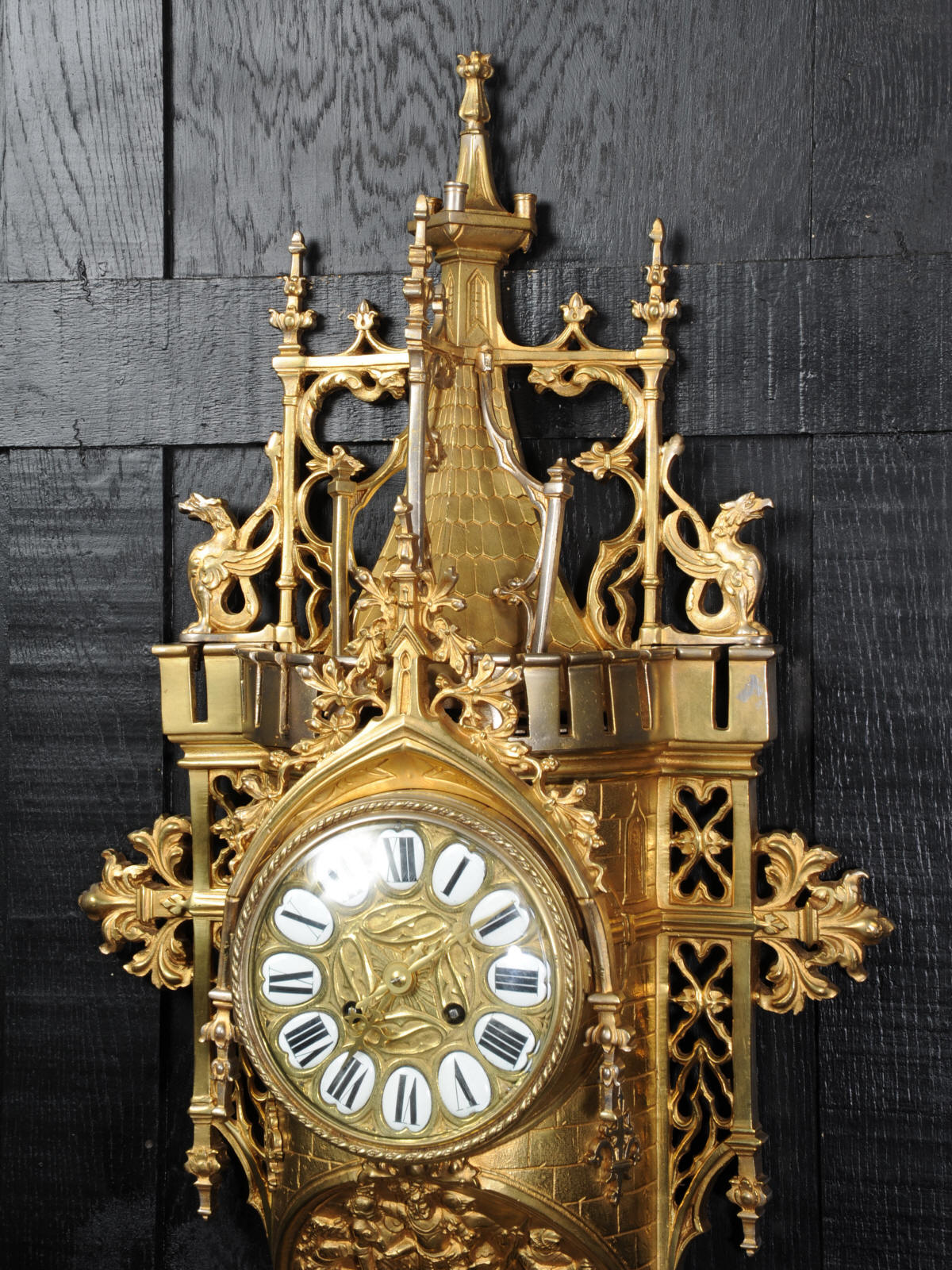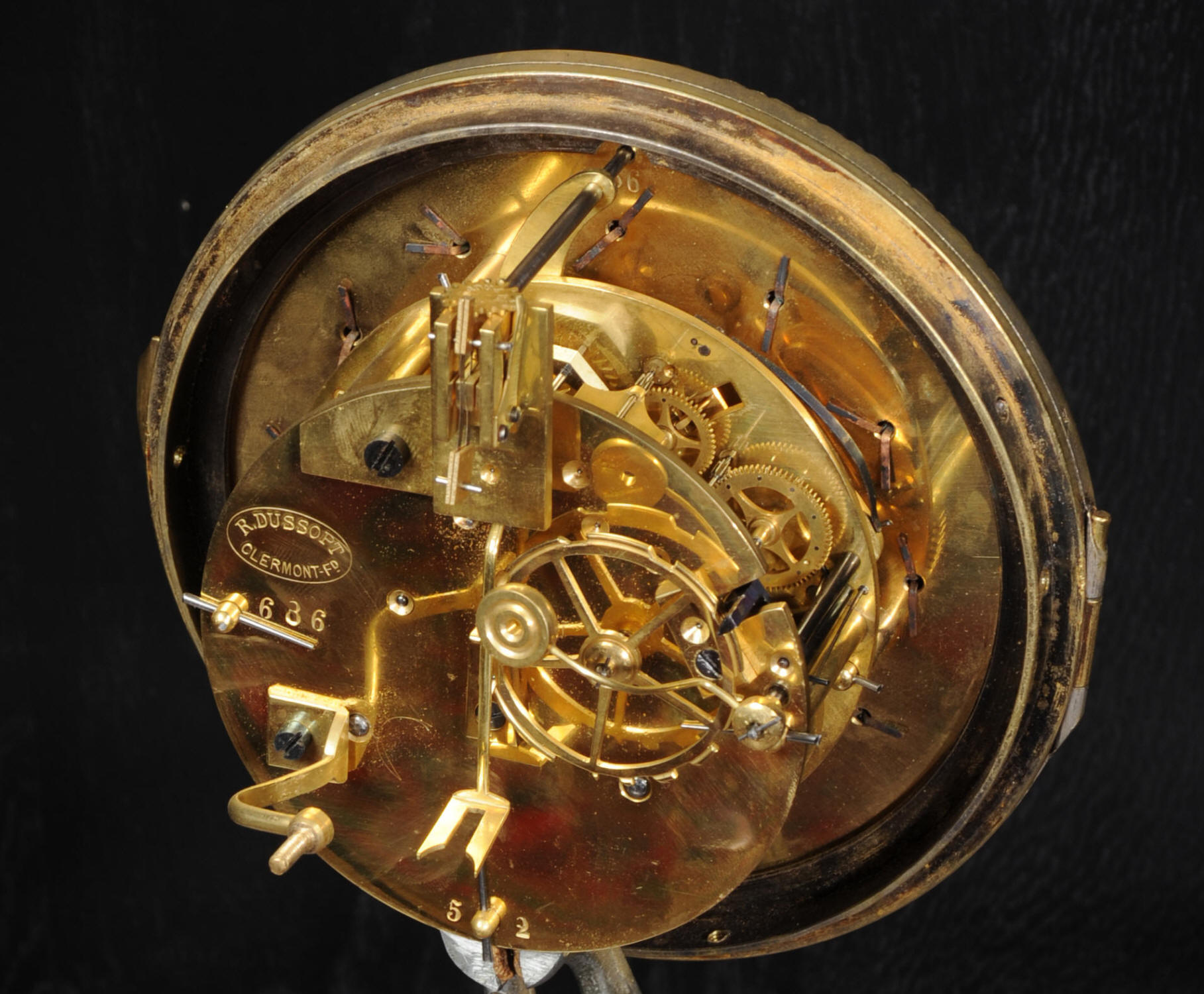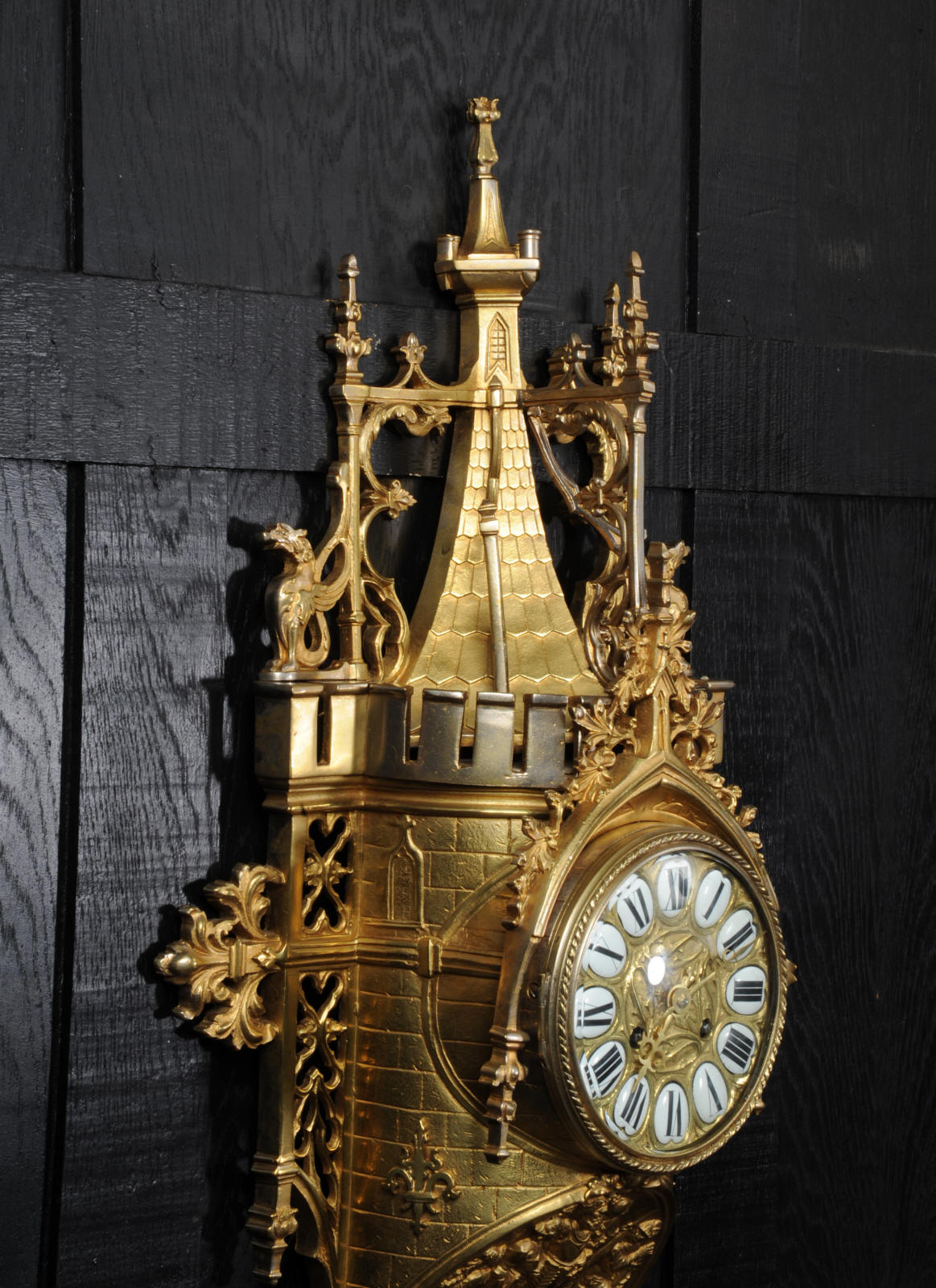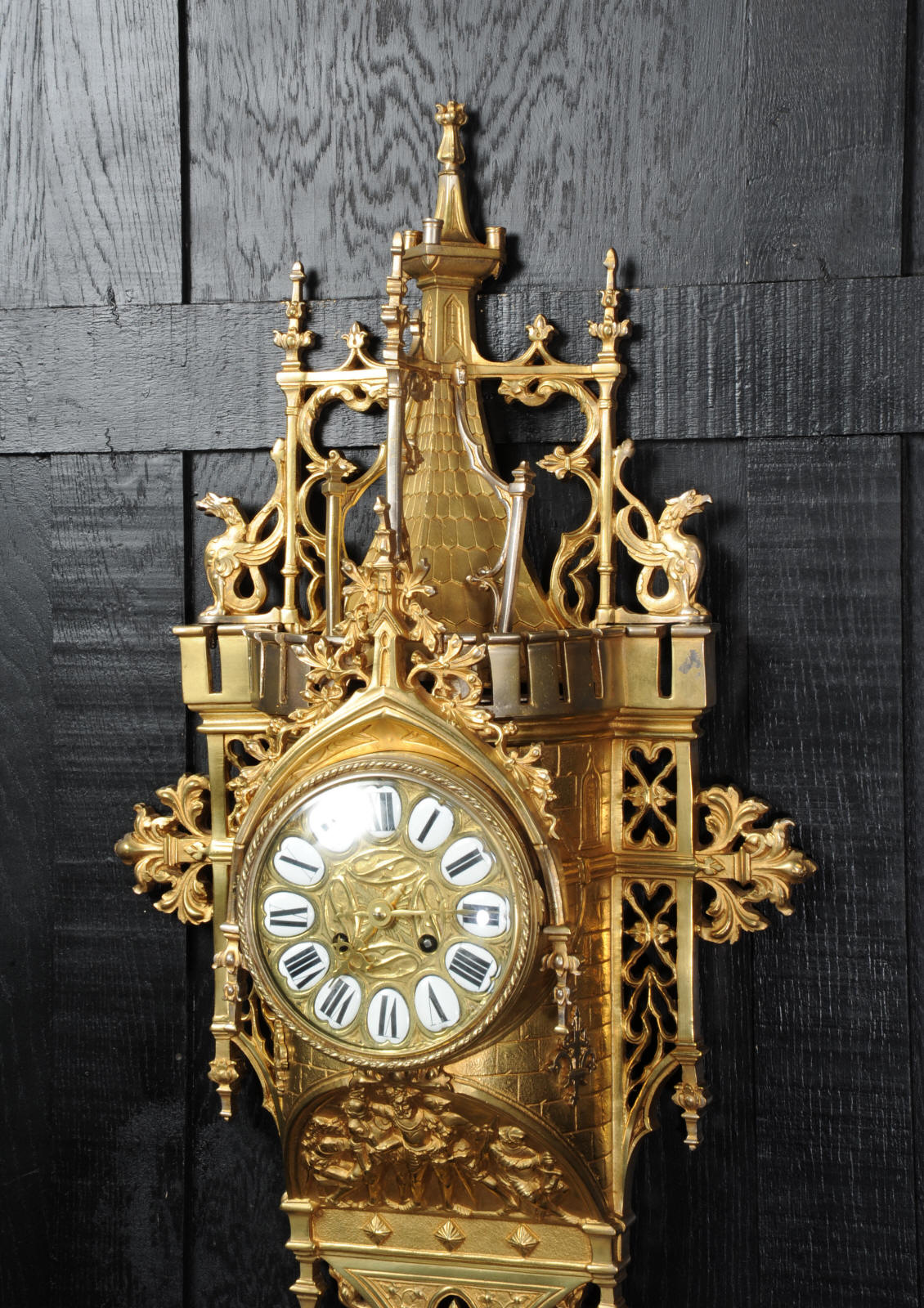 The dial is gilded bronze mounted with 12 individual porcelain enamel cartouches in the traditional French practice. Hands are finely cut brass. The French movement is of high quality and is in excellent clean and running condition having been fully overhauled by our clockmaker. Pendulum is a replacement. It runs for 8 days and strikes the hours and halves on a bell. Click the video clip below to hear the bell and watch the clock running! Condition of the case is excellent, the original gilding is clean and bright, the silver highlighting has worn and mellowed over the years and gives a pleasing contrast and age to the piece. There are some slight distortions to finials. Dial is excellent with no damage.