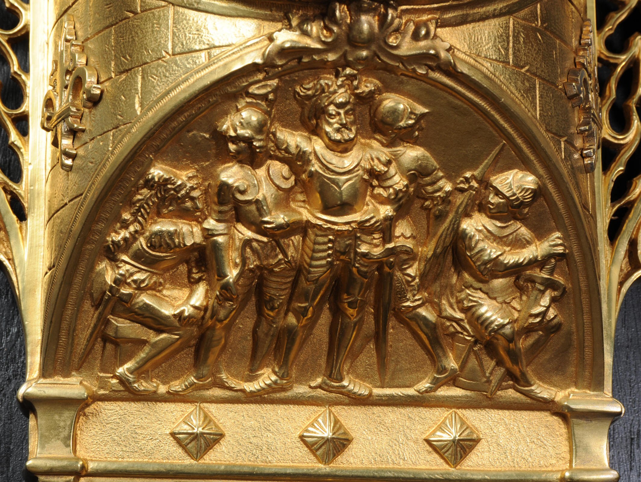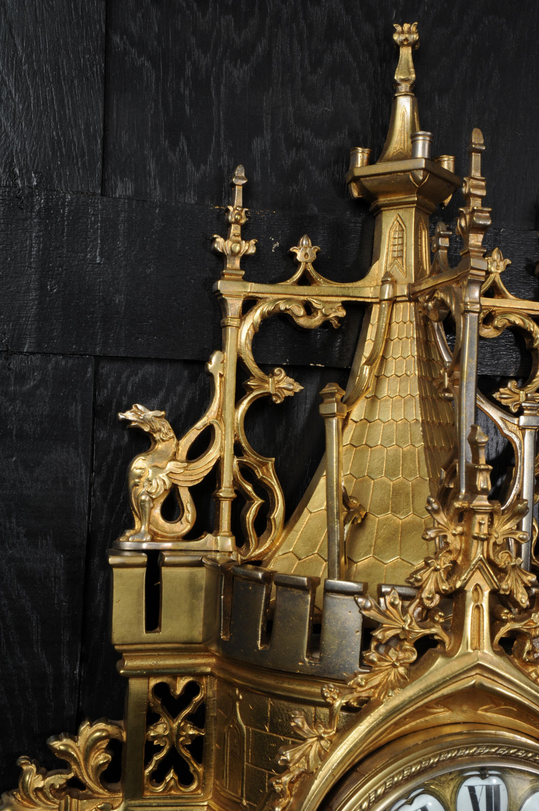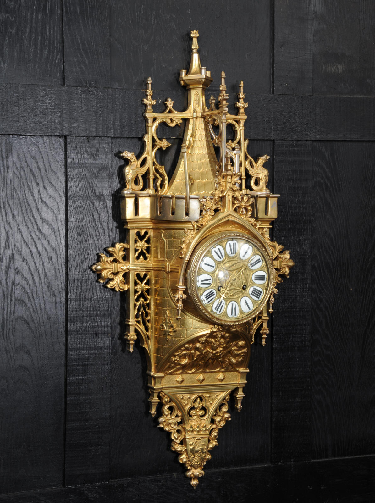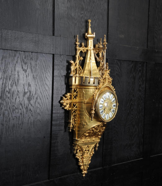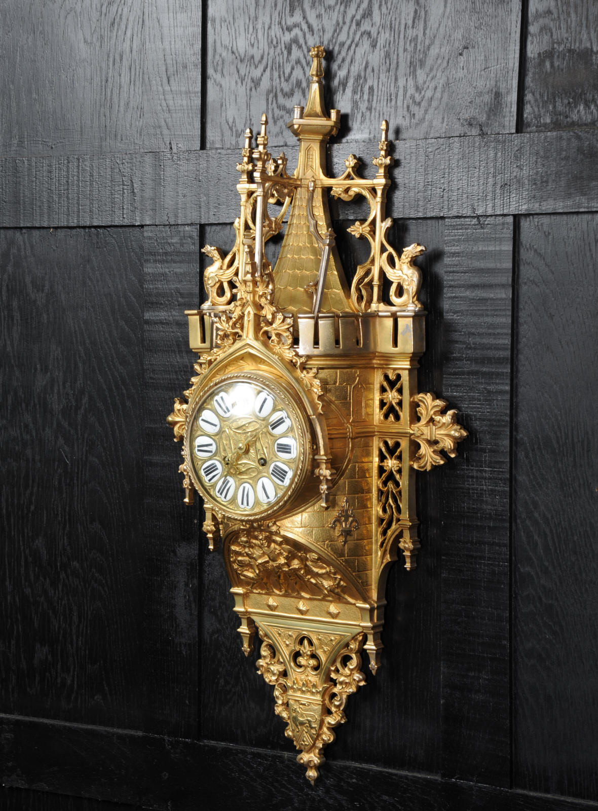 The dial is gilded bronze mounted with 12 individual porcelain enamel cartouches in the traditional French practice. Hands are finely cut brass. The French movement is of high quality and is in excellent clean and running condition having been fully overhauled by our clockmaker. Pendulum is a replacement. It runs for 8 days and strikes the hours and halves on a bell. Click the video clip below to hear the bell and watch the clock running! Condition of the case is excellent, the original gilding is clean and bright, the silver highlighting has worn and mellowed over the years and gives a pleasing contrast and age to the piece. There are some slight distortions to finials. Dial is excellent with no damage.