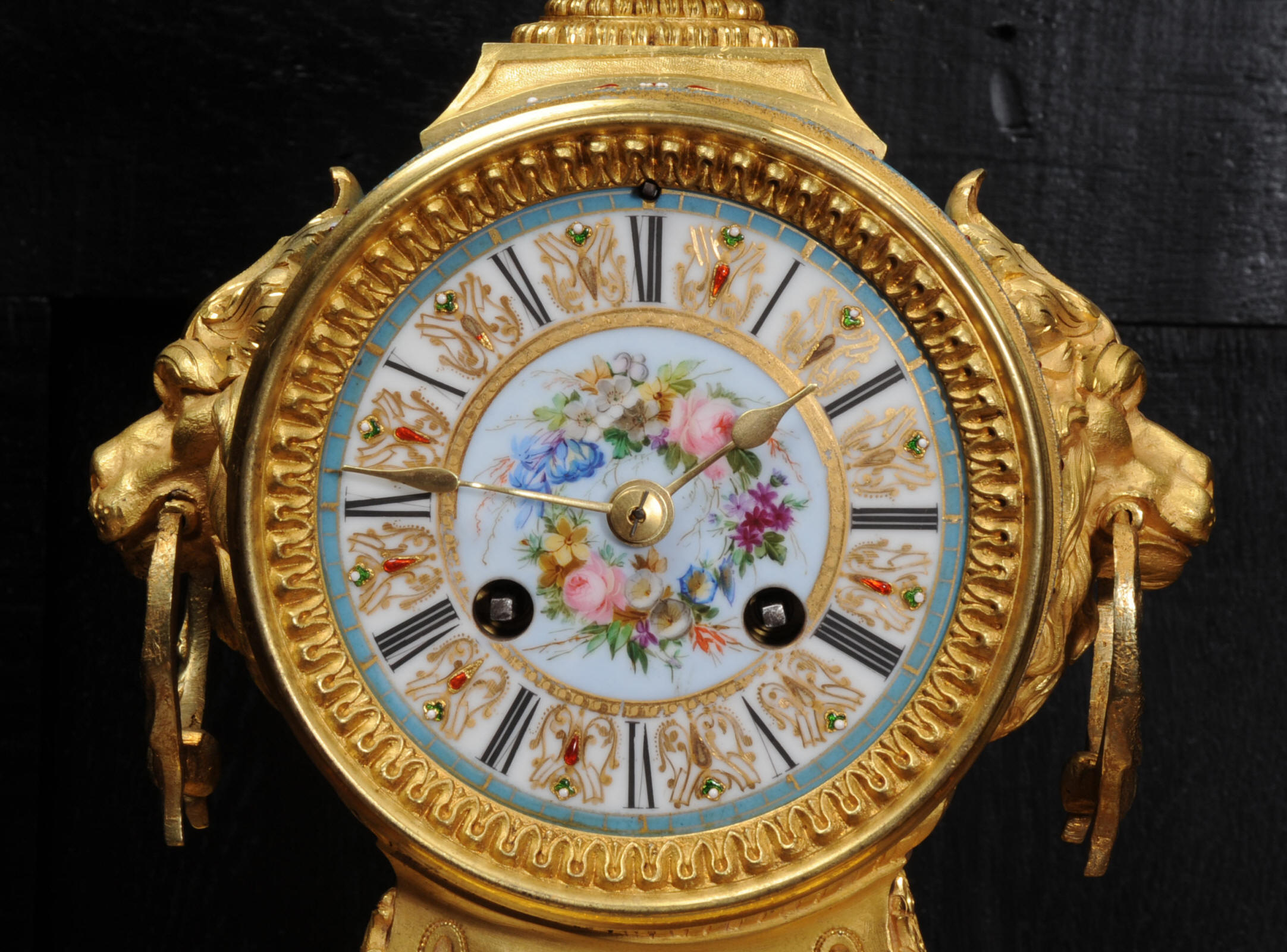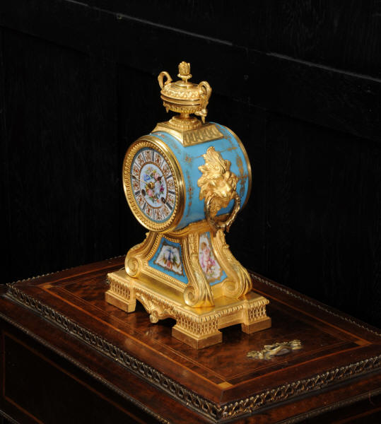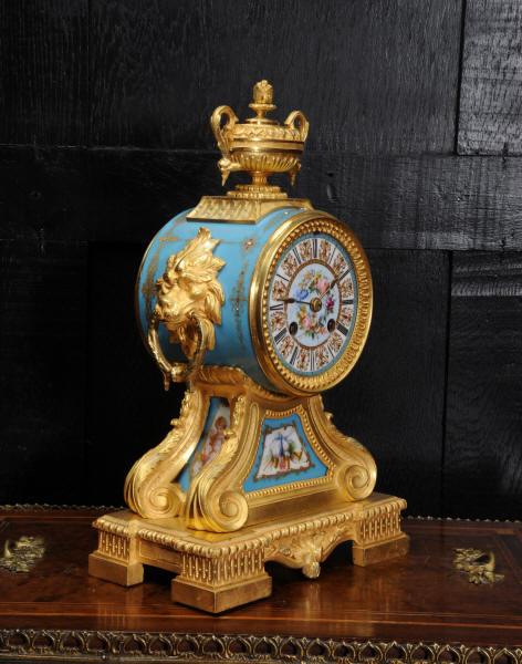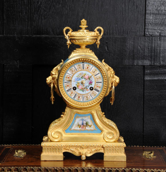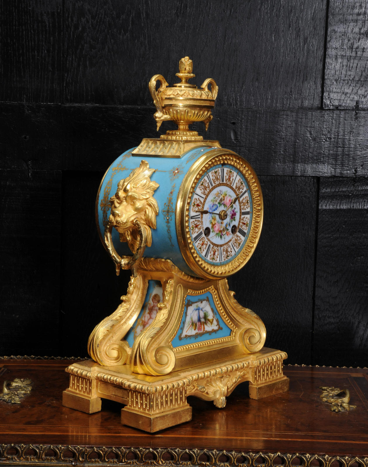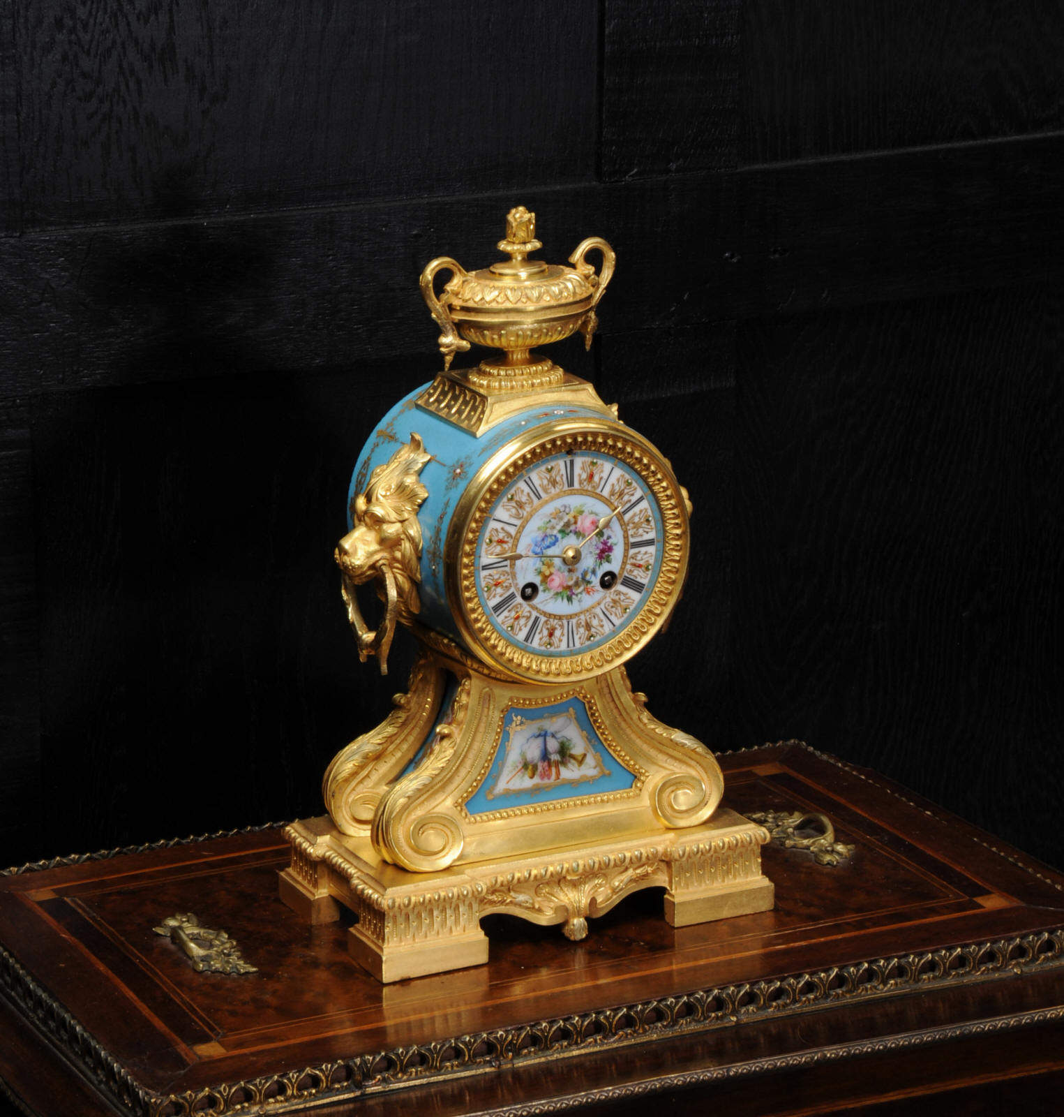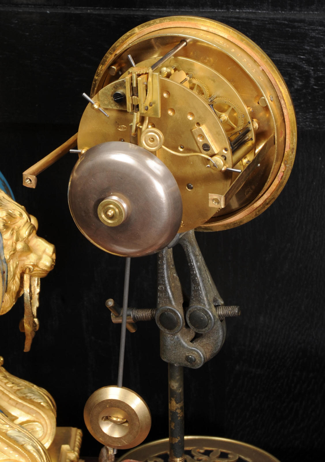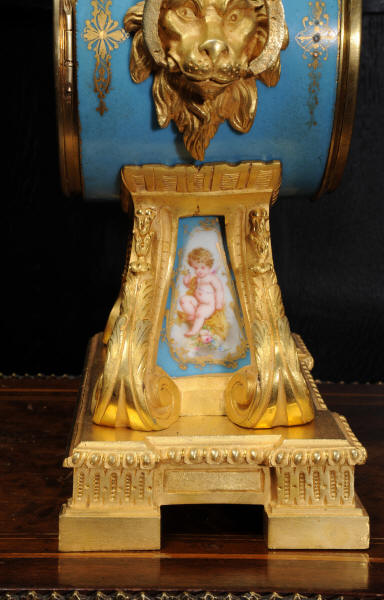 The movement is mounted in a porcelain drum with a porcelain dial, finely painted with floral swags, gilded work and applied porcelain jewels. It stands on an elaborate and heavily modelled base with laurel leaves and large scrolls. To the sides are lions mask handles and to the top an elaborate urn. The French movement is of high quality and is by Japy Freres, supplying the partially completed movement for finishing by Jean-Baptiste Delettrez. The JBD mark is also on the bezel. It is in excellent clean and running condition having been fully overhauled by our clockmaker. Pendulum is a replacement. It runs for 8 days and strikes the hours and halves on a bell. Click the video clip below to hear the bell and watch the clock running. Renown clockmaker Jean-Baptiste Delettrez (1816-1887) is listed as working in Tardy Dictionnaire des Horlogers as working at Rue de Berry au Marais in 1850. He formed a partnership after this with great Achille Brocot. Condition of the case is excellent, the original gilding is clean and bright, some wear and discolouration particularly to the back door and rear panel. There is a casting fault to the case on the right hand side. Porcelain is also in good condition, some wear to the over glaze gilt decoration and some loss of porcelain jewels and the occasional mark. There is a light hairline to the porcelain drum but it is mounted on a brass liner and so is strong. We have replaced the fabric inside the rear door.