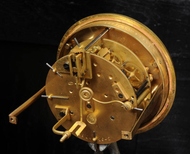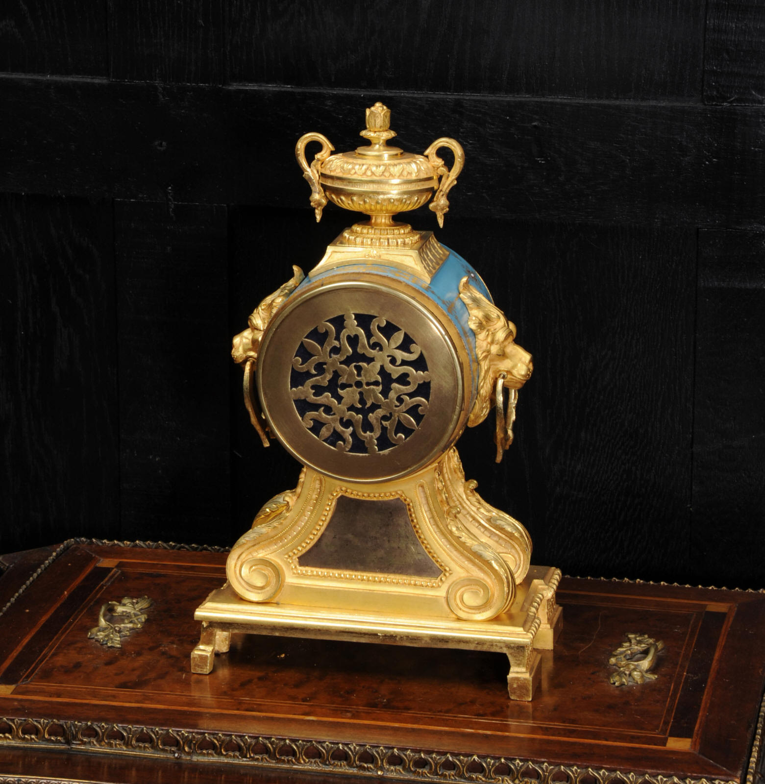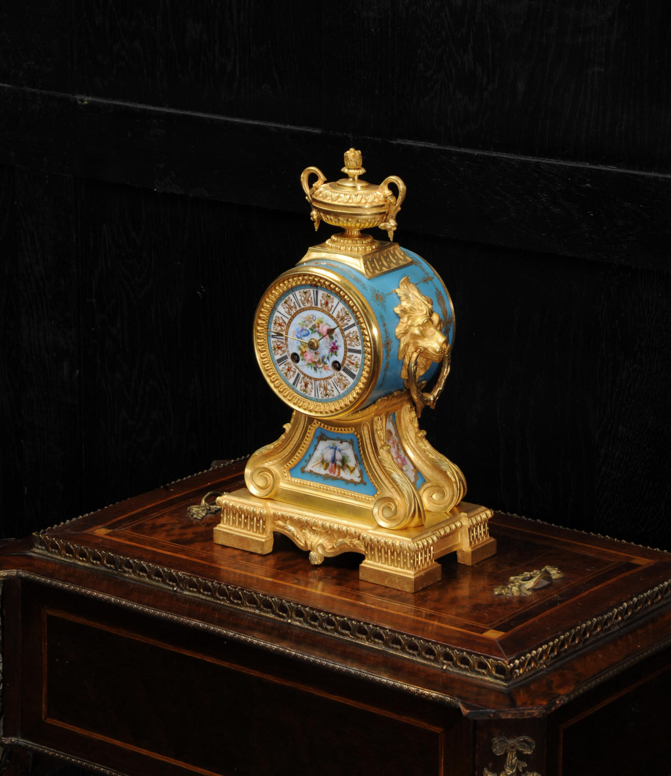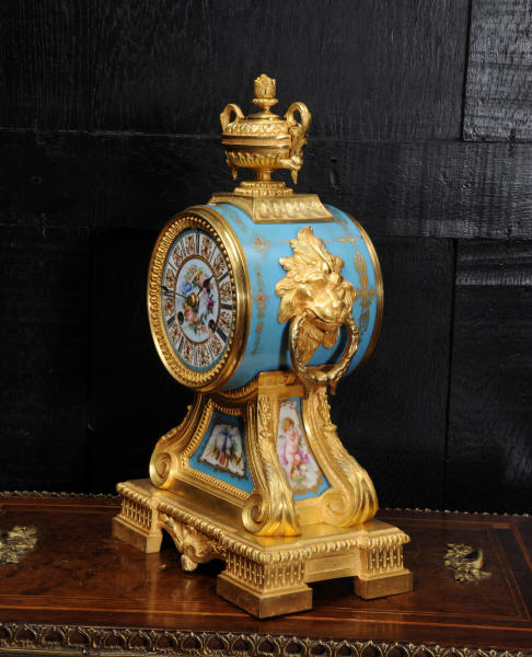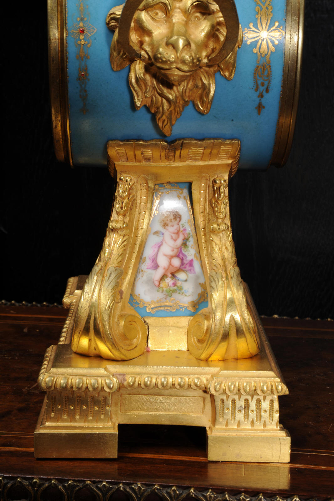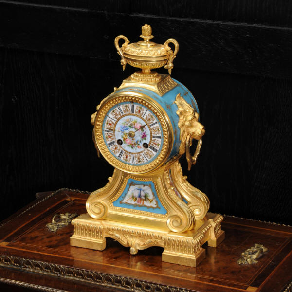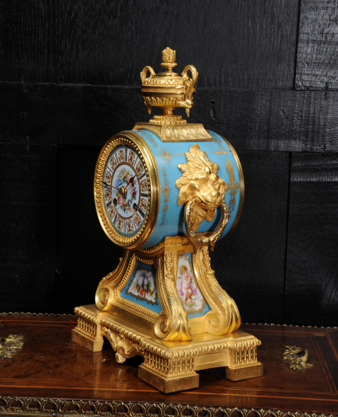 The movement is mounted in a porcelain drum with a porcelain dial, finely painted with floral swags, gilded work and applied porcelain jewels. It stands on an elaborate and heavily modelled base with laurel leaves and large scrolls. To the sides are lions mask handles and to the top an elaborate urn. The French movement is of high quality and is by Japy Freres, supplying the partially completed movement for finishing by Jean-Baptiste Delettrez. The JBD mark is also on the bezel. It is in excellent clean and running condition having been fully overhauled by our clockmaker. Pendulum is a replacement. It runs for 8 days and strikes the hours and halves on a bell. Click the video clip below to hear the bell and watch the clock running. Renown clockmaker Jean-Baptiste Delettrez (1816-1887) is listed as working in Tardy Dictionnaire des Horlogers as working at Rue de Berry au Marais in 1850. He formed a partnership after this with great Achille Brocot. Condition of the case is excellent, the original gilding is clean and bright, some wear and discolouration particularly to the back door and rear panel. There is a casting fault to the case on the right hand side. Porcelain is also in good condition, some wear to the over glaze gilt decoration and some loss of porcelain jewels and the occasional mark. There is a light hairline to the porcelain drum but it is mounted on a brass liner and so is strong. We have replaced the fabric inside the rear door.
