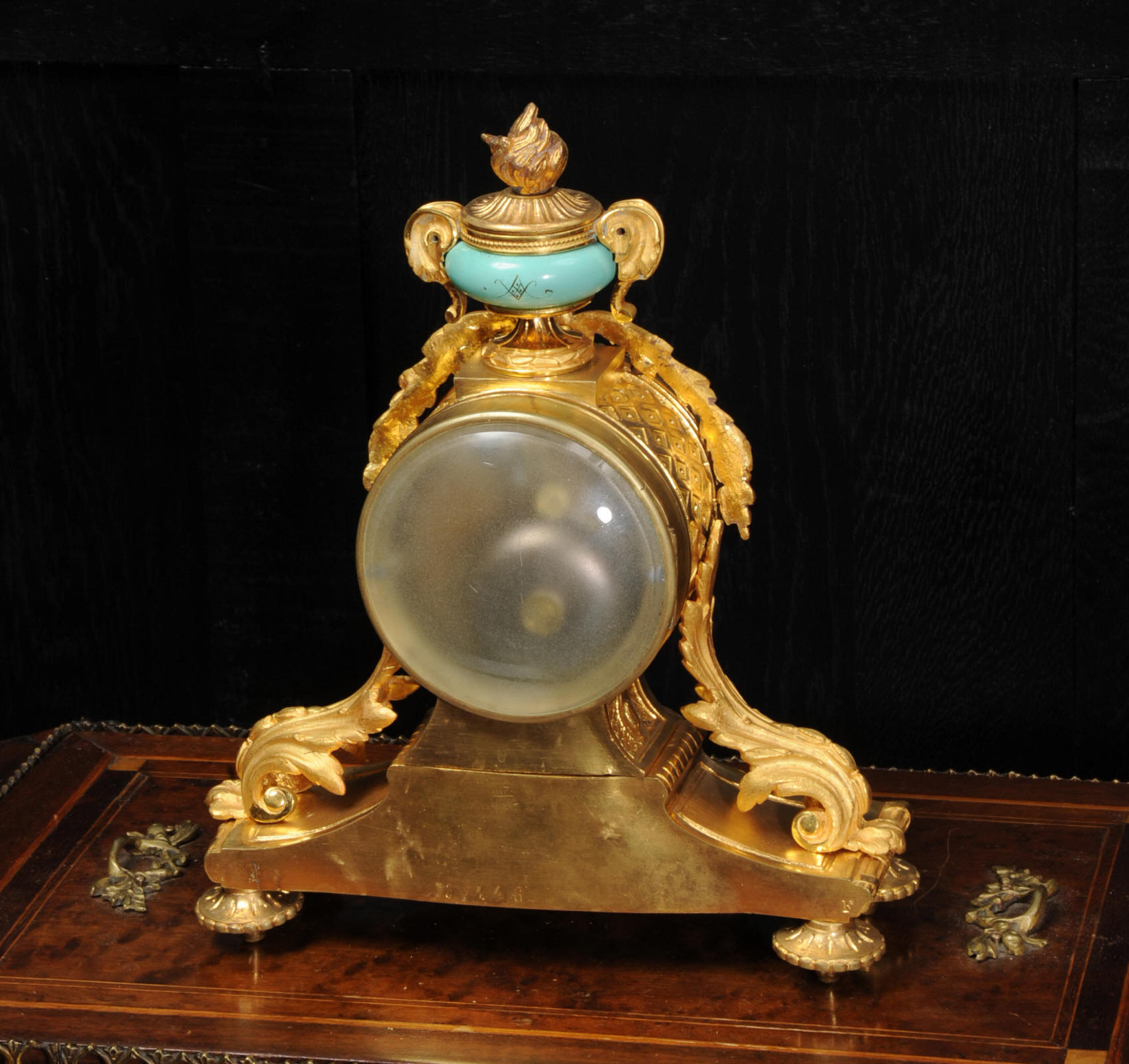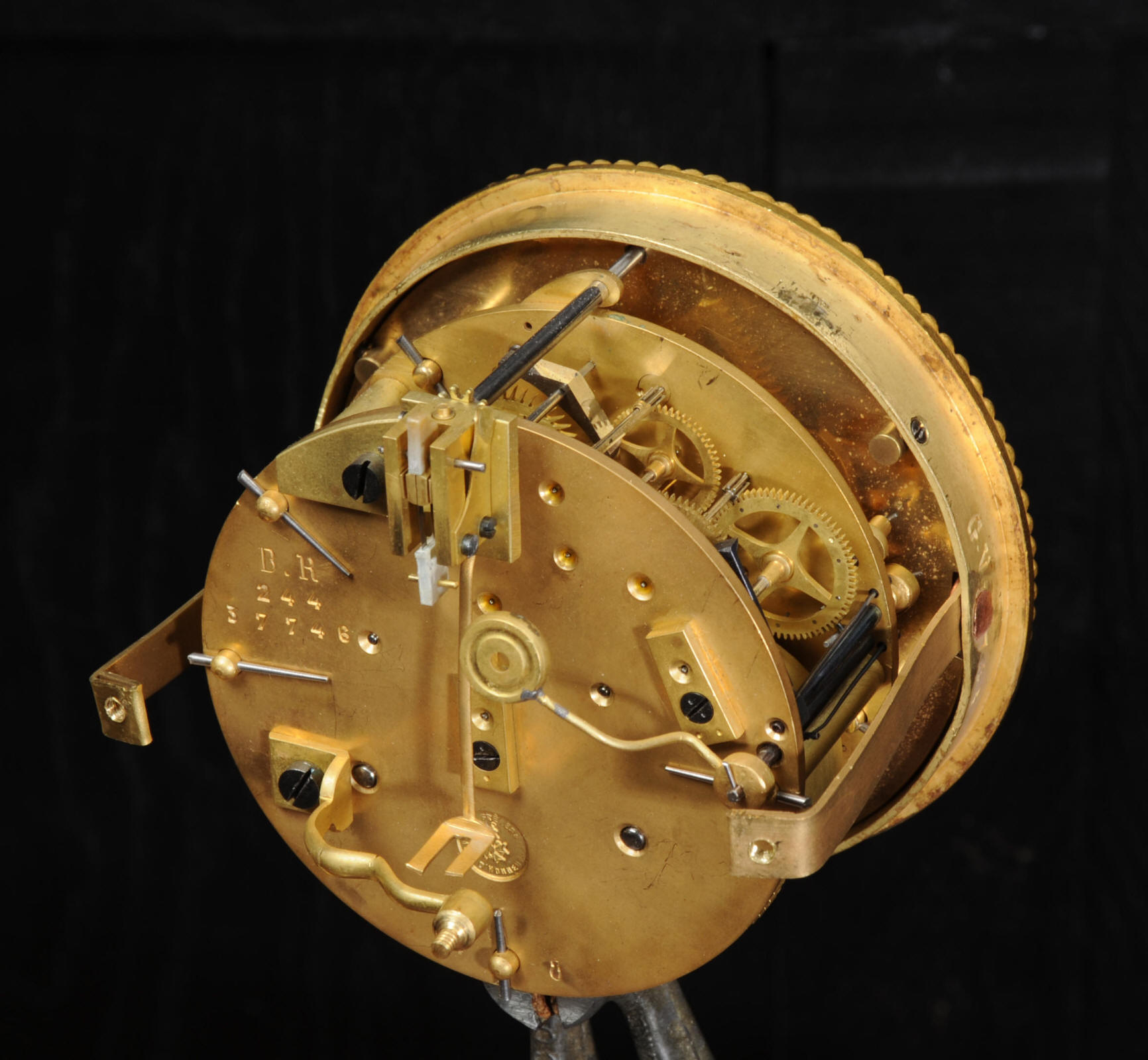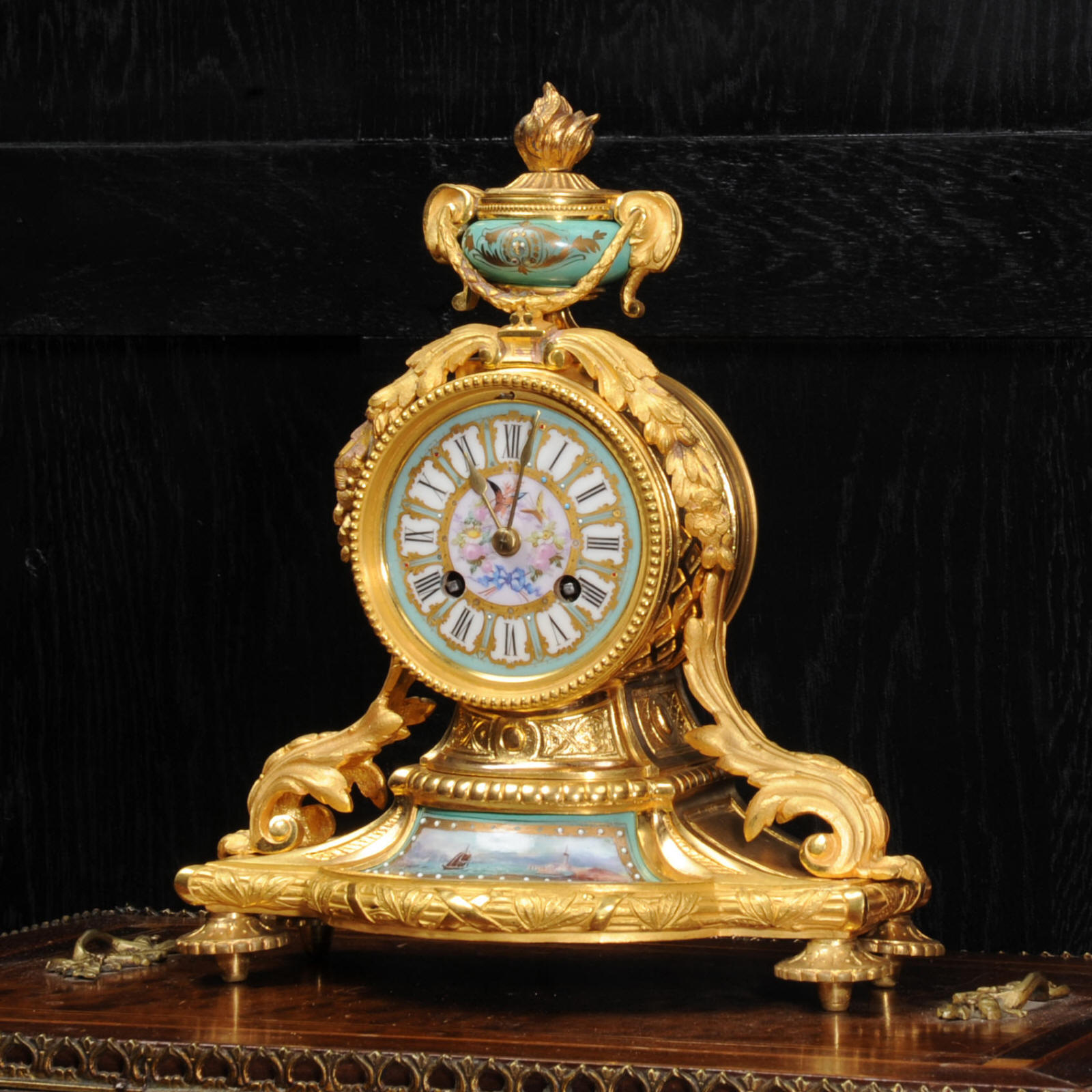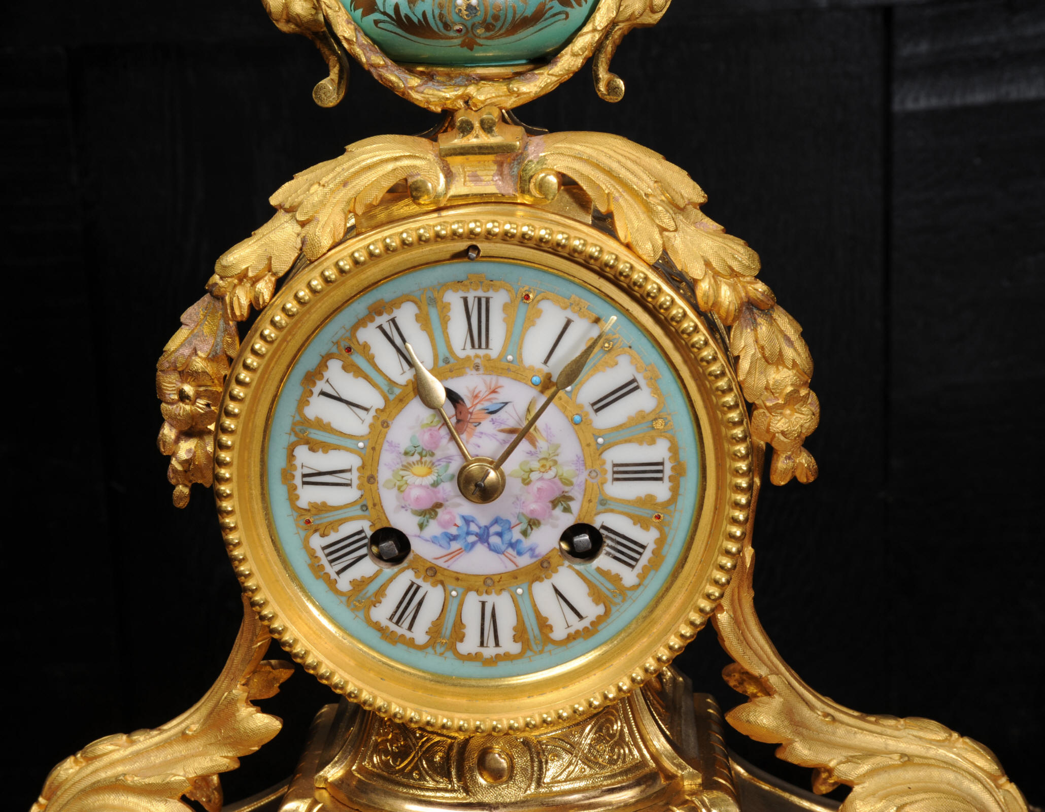 The dial is porcelain, delicately painted with flowers, butterflies and a bow. The rear door is glazed with convex frosted glass. Please note that this type of clock does not have a glazed front bezel. The French movement is of high quality and has the Japy Frères mark on the backplate. It is in excellent clean and running condition having been fully overhauled by our clockmaker. Pendulum is an old replacement. It runs for 8 days and strikes the hours and halves on a bell. Click the video clip below to hear the bell and watch the clock running! Condition of the case is very good, the original gilding is beautifully clean and bright with some occasional tarnish or discolouration. The porcelain is also in excellent condition with some loss to the over-glaze gilt decoration and applied porcelain jewels.