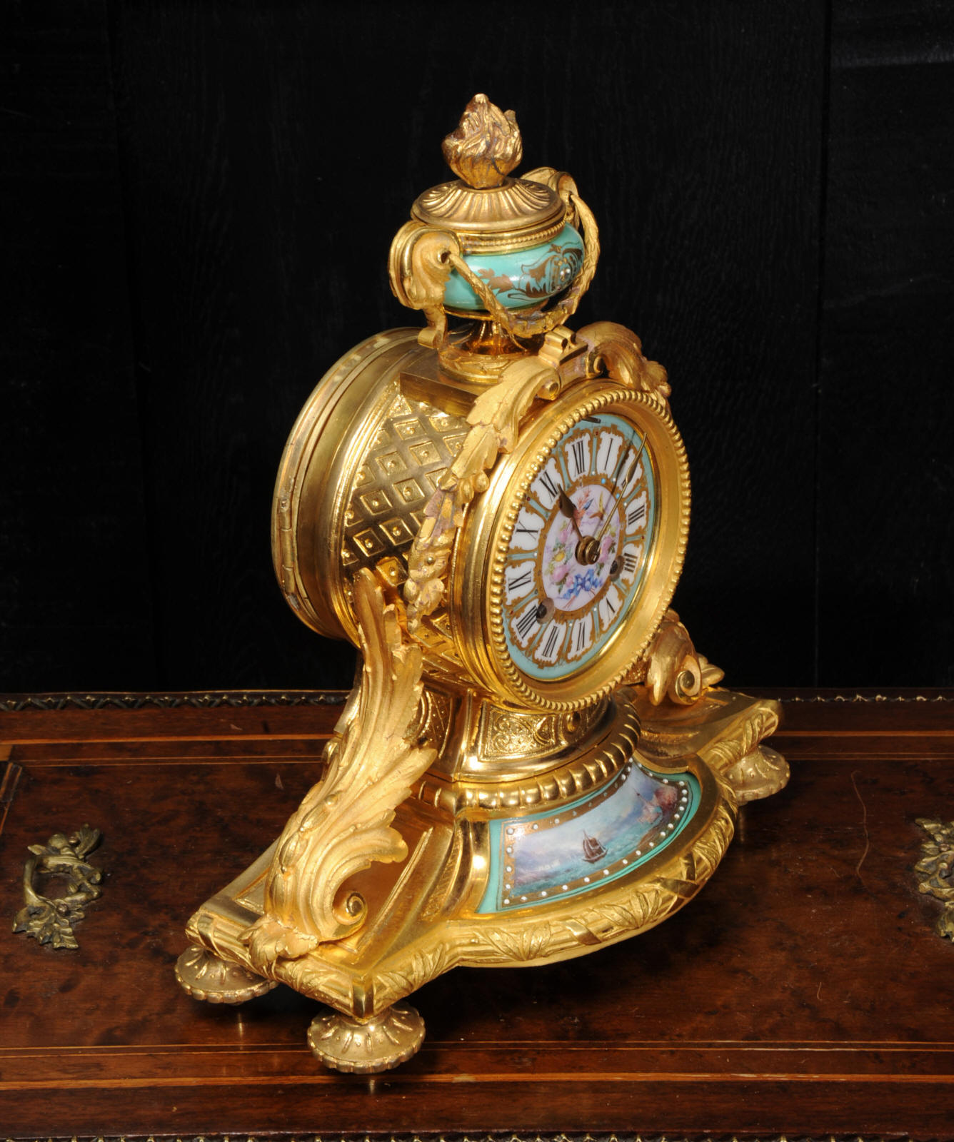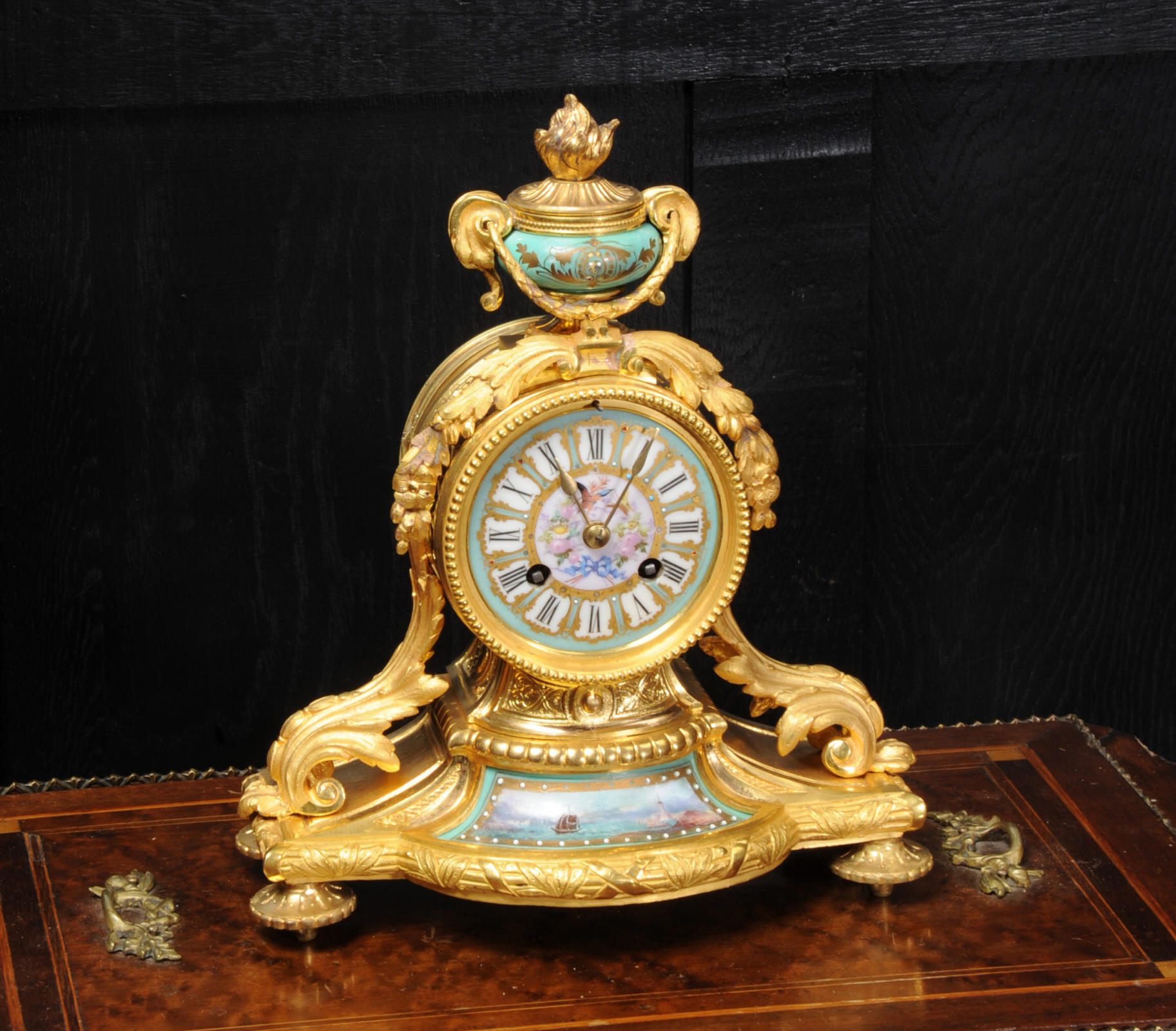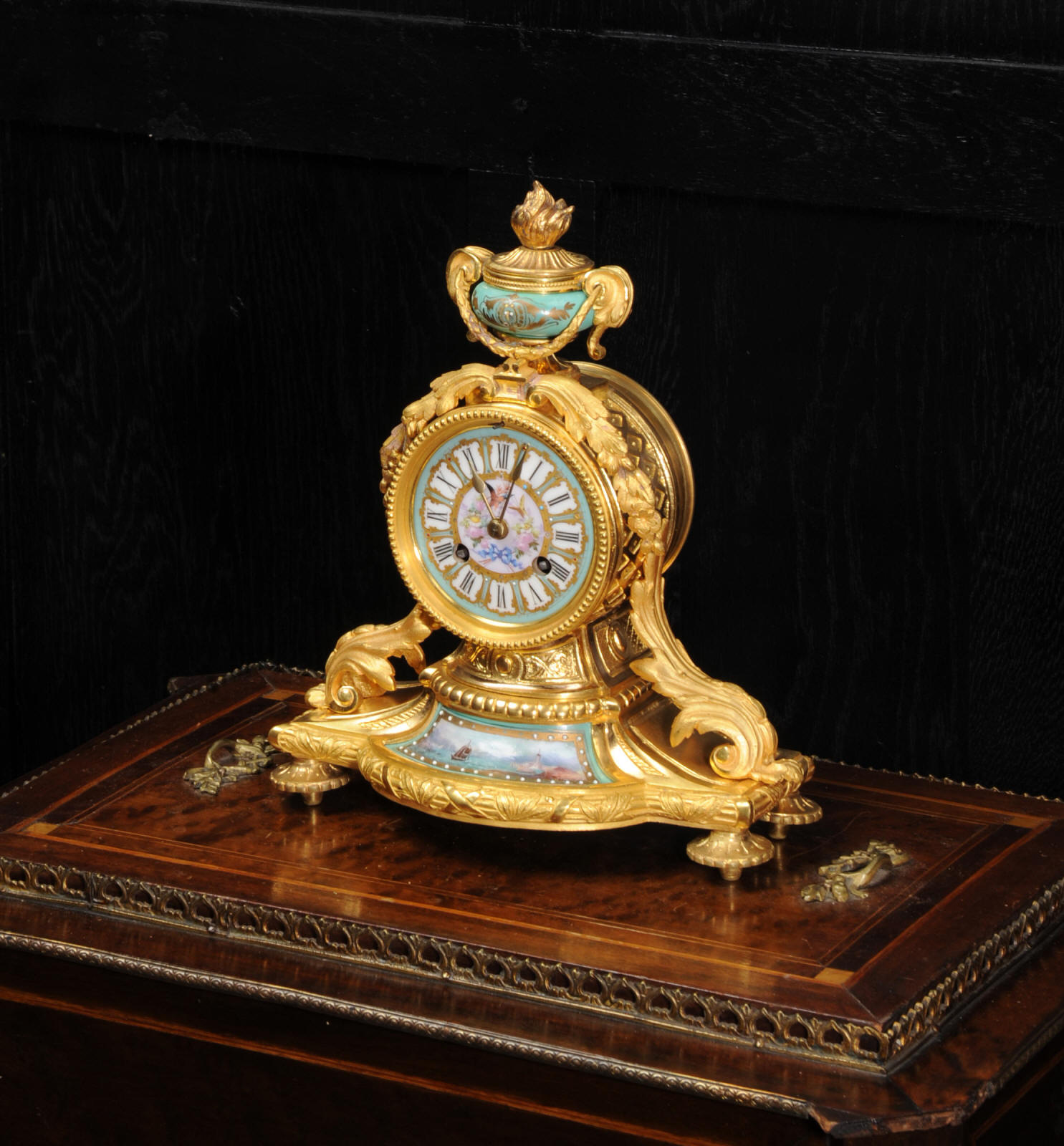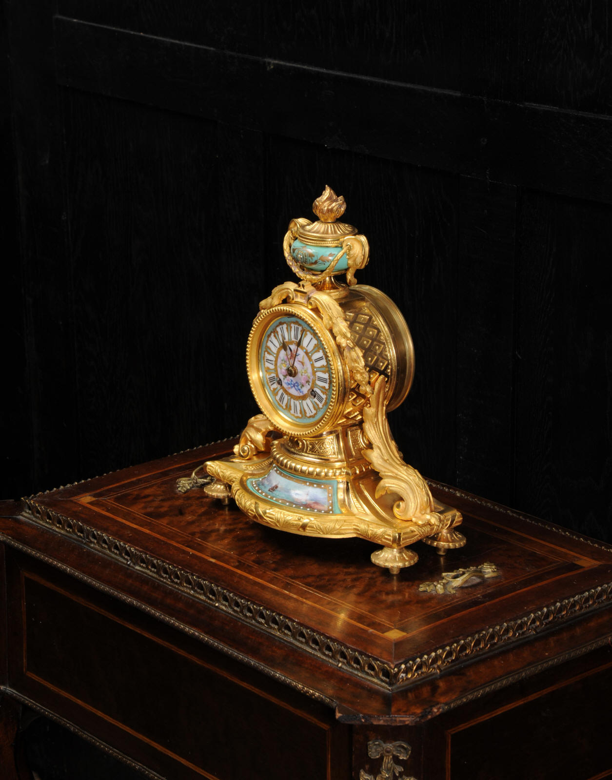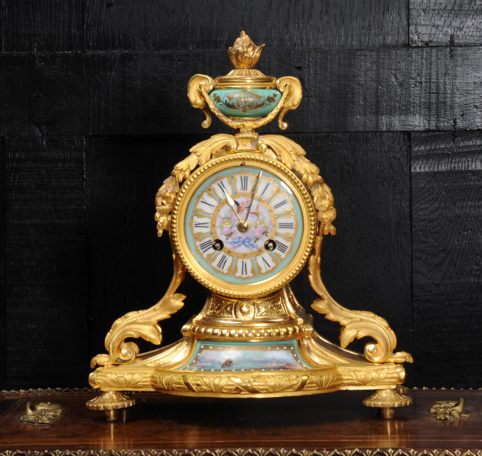 The dial is porcelain, delicately painted with flowers, butterflies and a bow. The rear door is glazed with convex frosted glass. Please note that this type of clock does not have a glazed front bezel. The French movement is of high quality and has the Japy Frères mark on the backplate. It is in excellent clean and running condition having been fully overhauled by our clockmaker. Pendulum is an old replacement. It runs for 8 days and strikes the hours and halves on a bell. Click the video clip below to hear the bell and watch the clock running! Condition of the case is very good, the original gilding is beautifully clean and bright with some occasional tarnish or discolouration. The porcelain is also in excellent condition with some loss to the over-glaze gilt decoration and applied porcelain jewels.