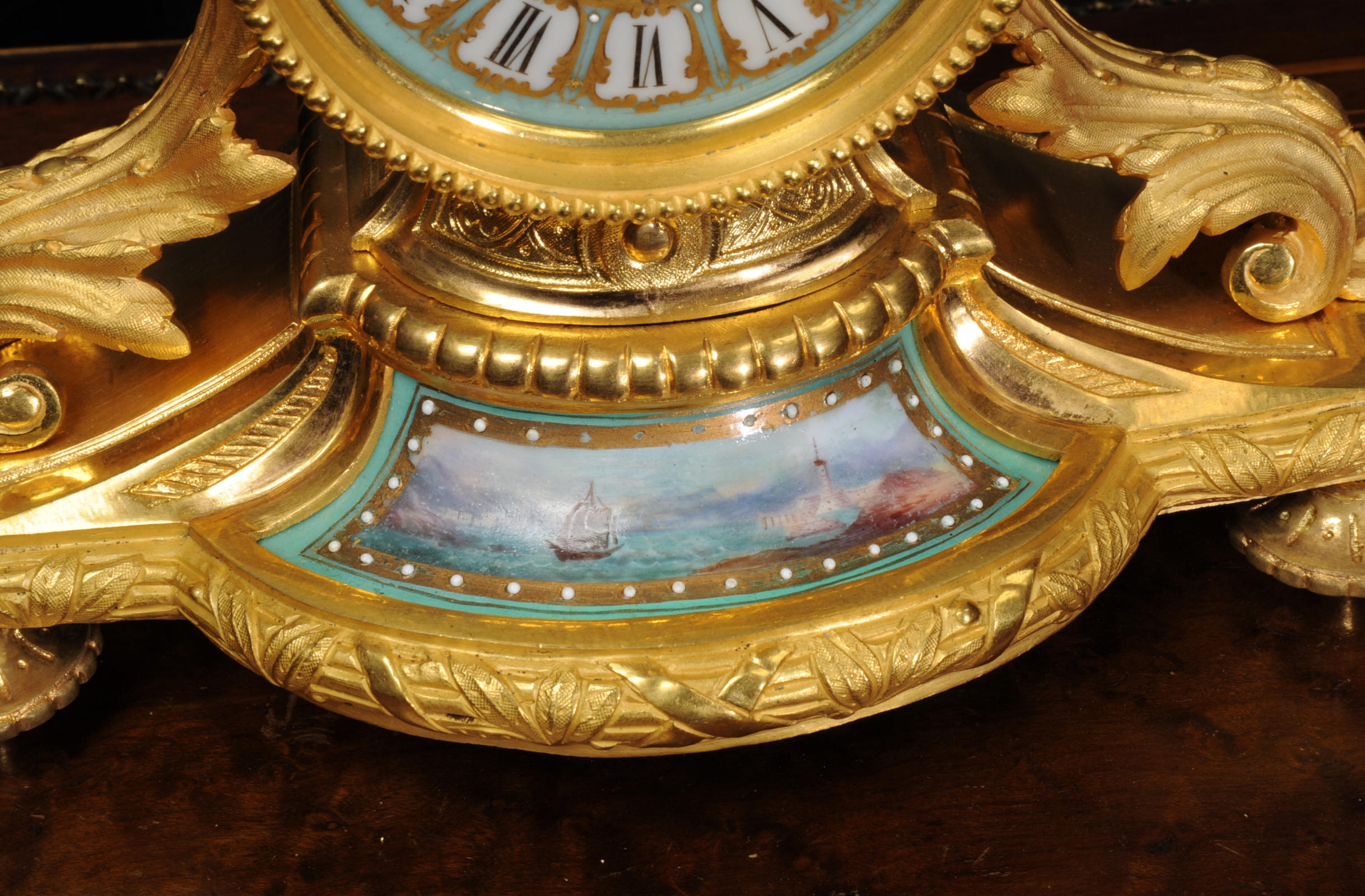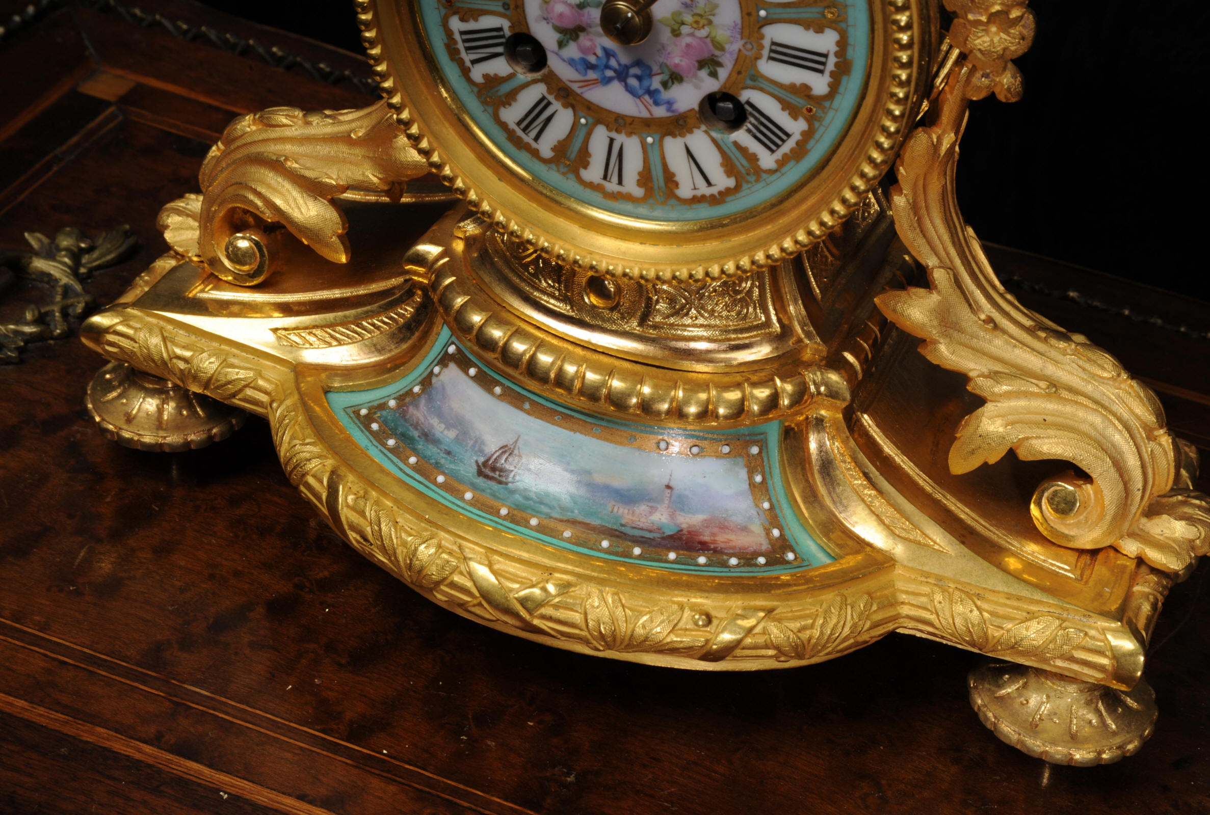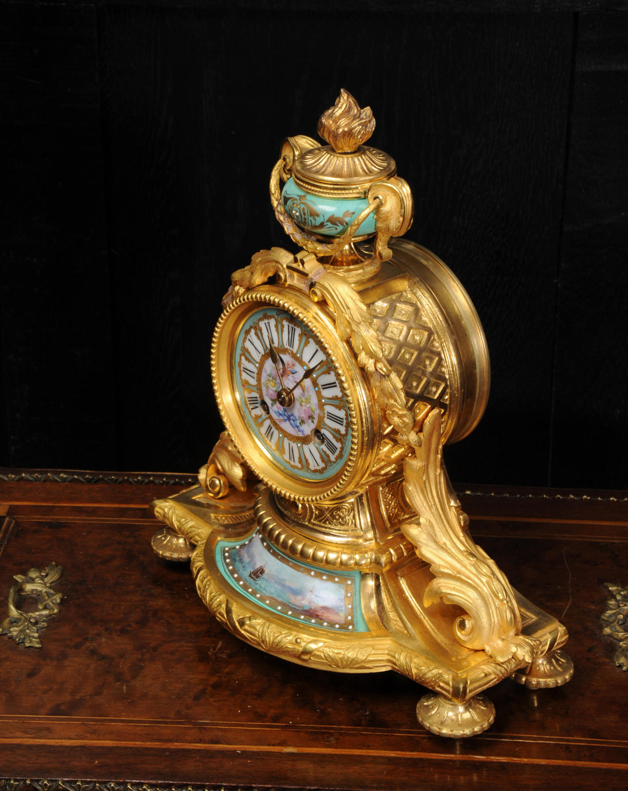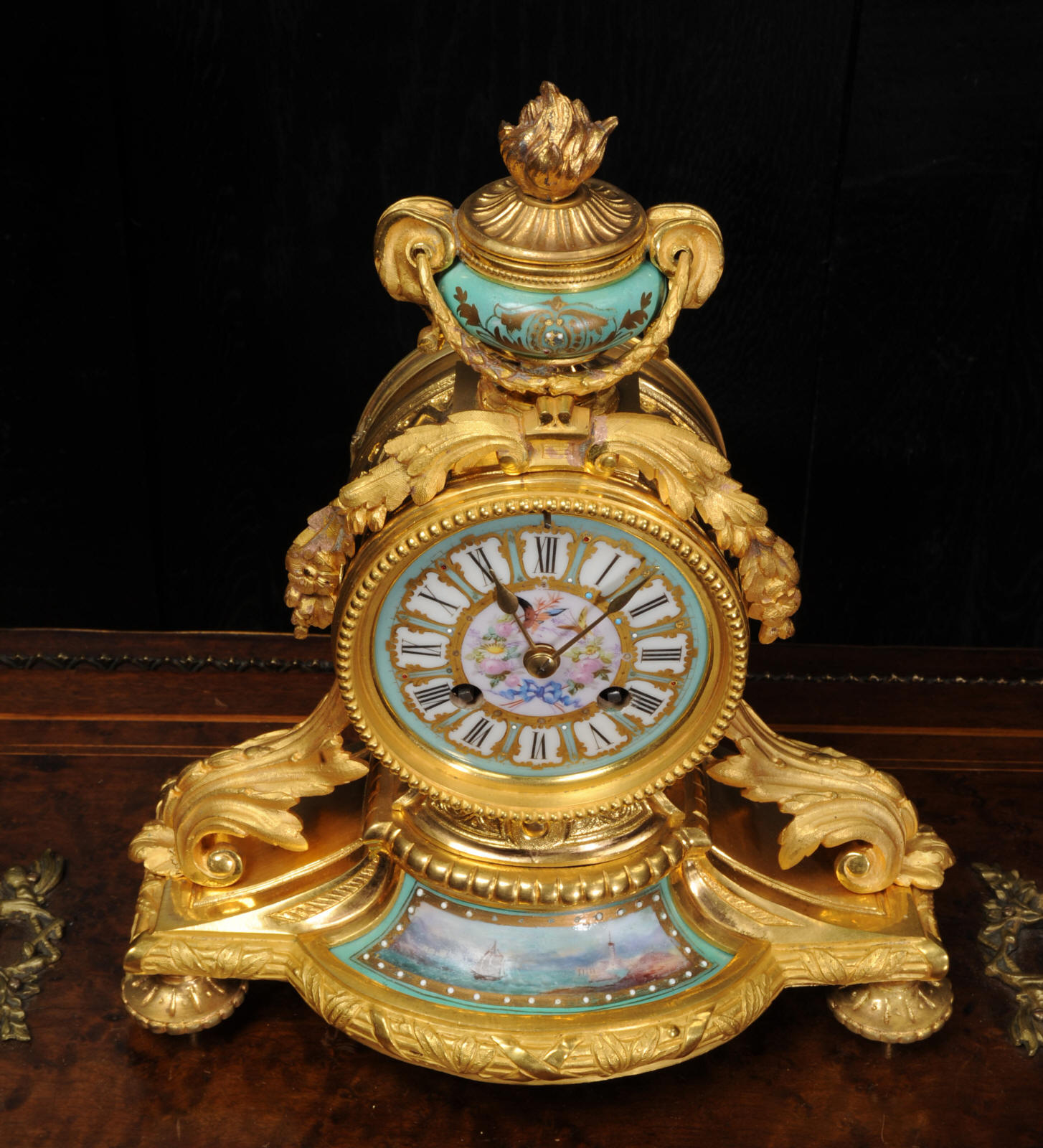 The dial is porcelain, delicately painted with flowers, butterflies and a bow. The rear door is glazed with convex frosted glass. Please note that this type of clock does not have a glazed front bezel. The French movement is of high quality and has the Japy Frères mark on the backplate. It is in excellent clean and running condition having been fully overhauled by our clockmaker. Pendulum is an old replacement. It runs for 8 days and strikes the hours and halves on a bell. Click the video clip below to hear the bell and watch the clock running! Condition of the case is very good, the original gilding is beautifully clean and bright with some occasional tarnish or discolouration. The porcelain is also in excellent condition with some loss to the over-glaze gilt decoration and applied porcelain jewels.