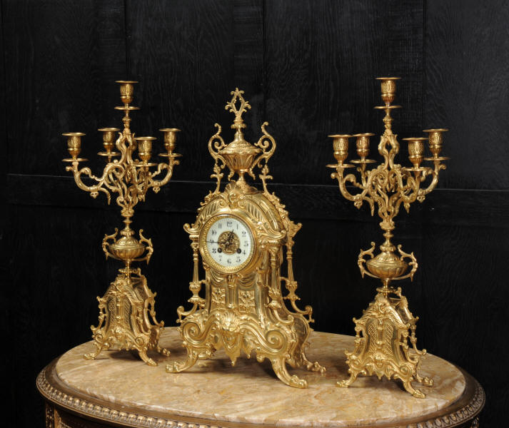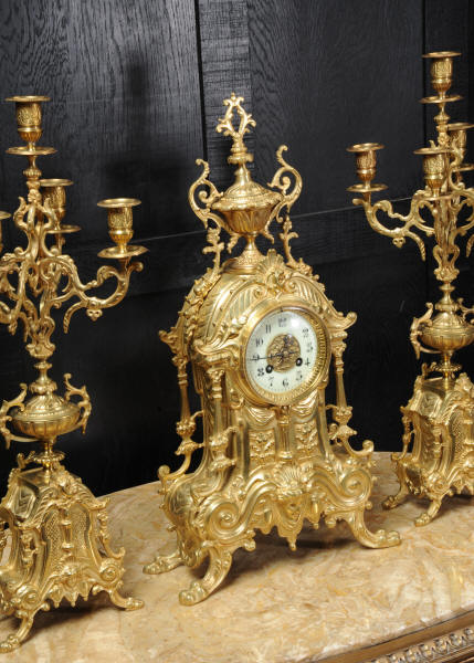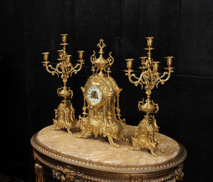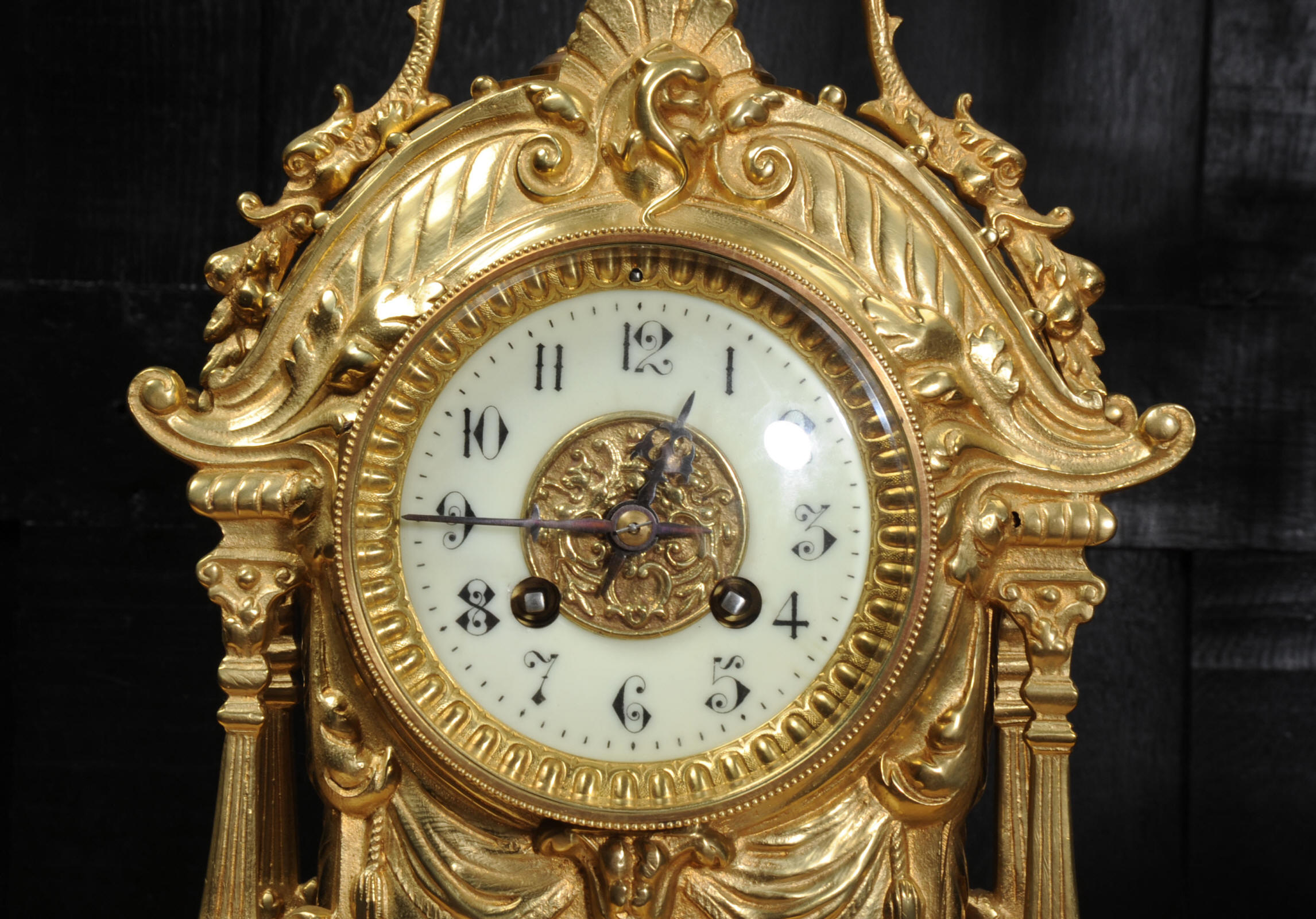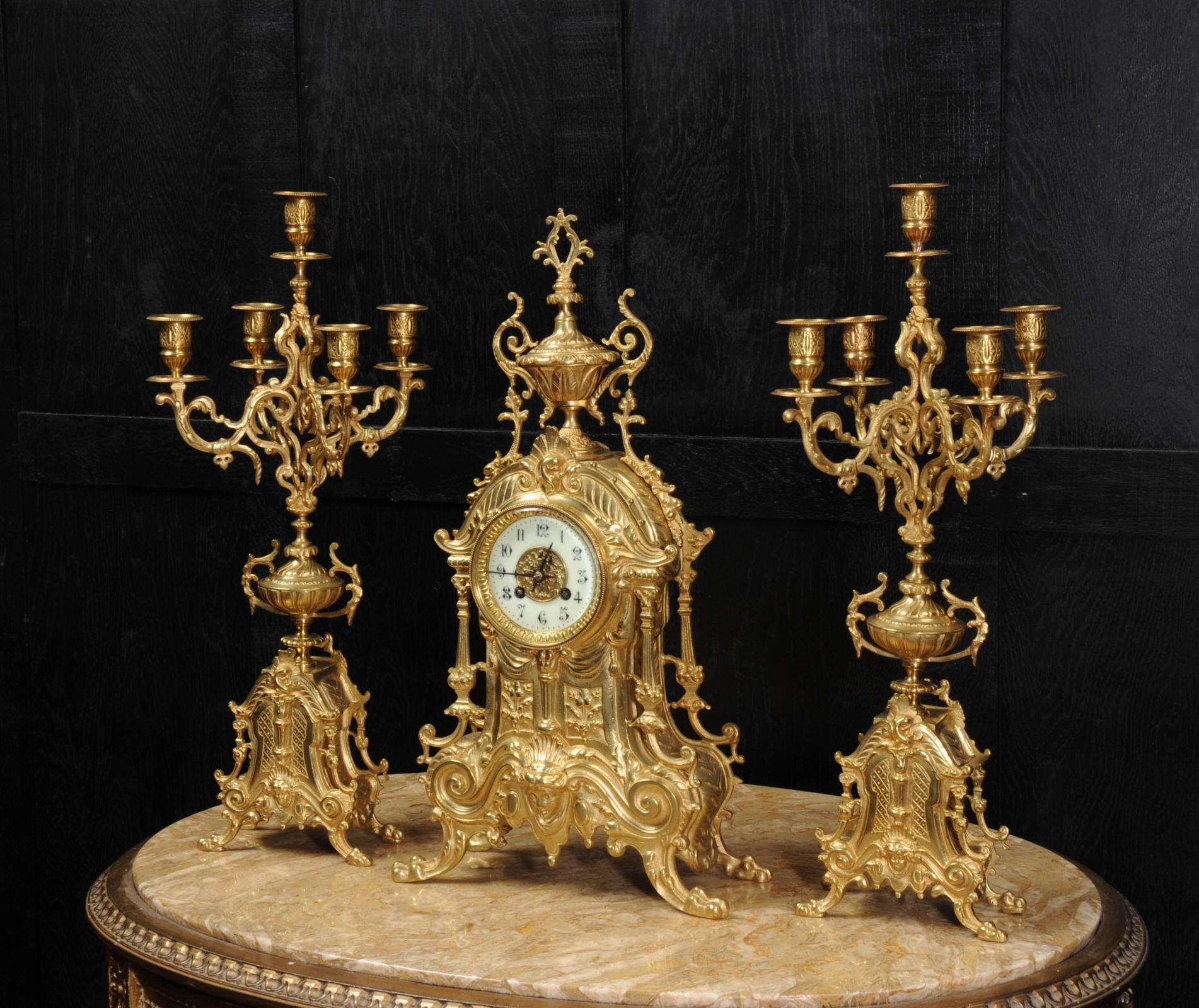 The dial is porcelain enamel on copper with original blued steel hands, bronze centre and convex glass. The French movement is of high quality and is by Louis Japy. It is in excellent clean and running condition having been fully overhauled by our clockmaker. Pendulum is a replacement. It runs for 8 days and strikes the hours and halves on a bell. Click the video clip below to hear the bell and watch the clock running! Condition of the case is excellent, the original gilding is beautifully clean and bright with just some slight discolouration and tarnish. The dial is also in excellent condition just some tiny nibbles to the winding holes. Candelabra arms are slightly distorted.
