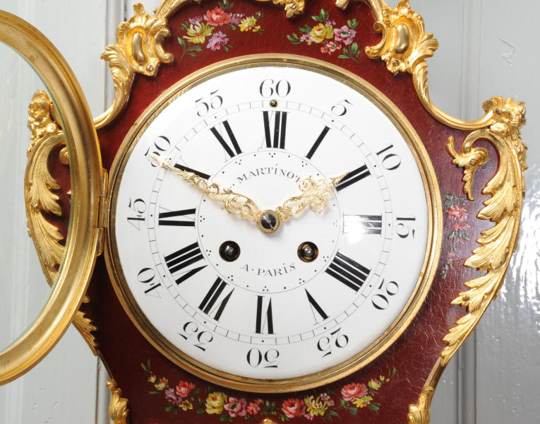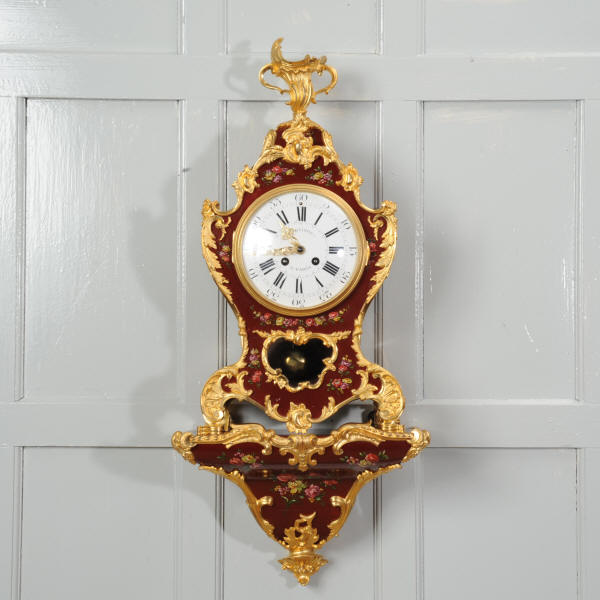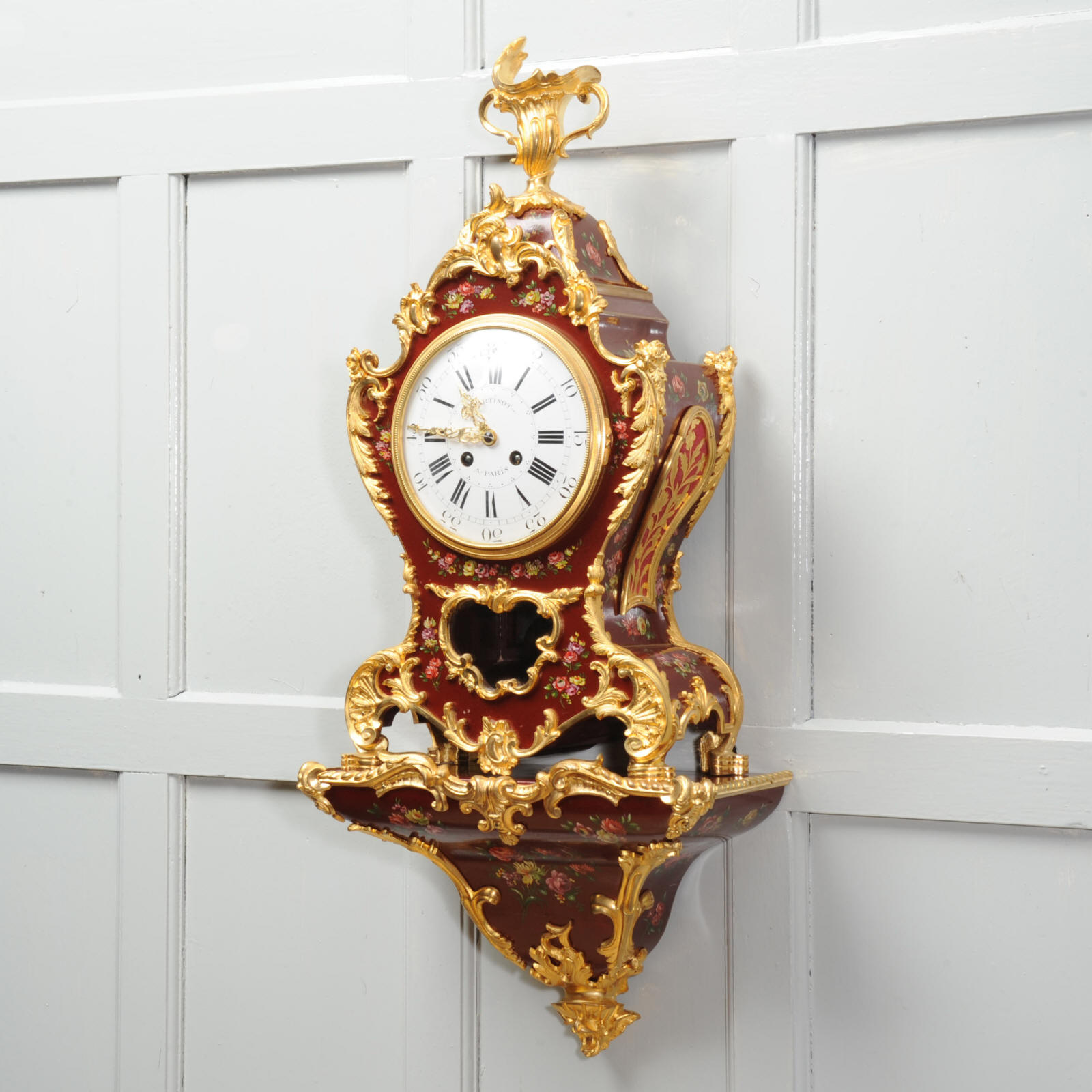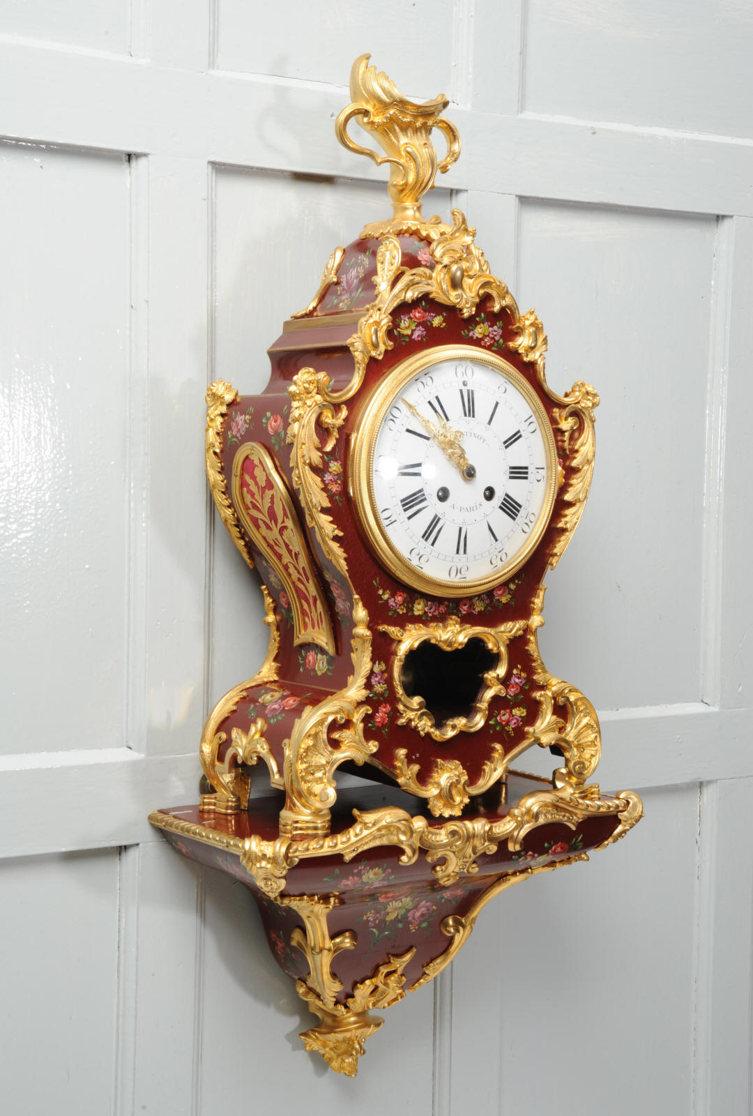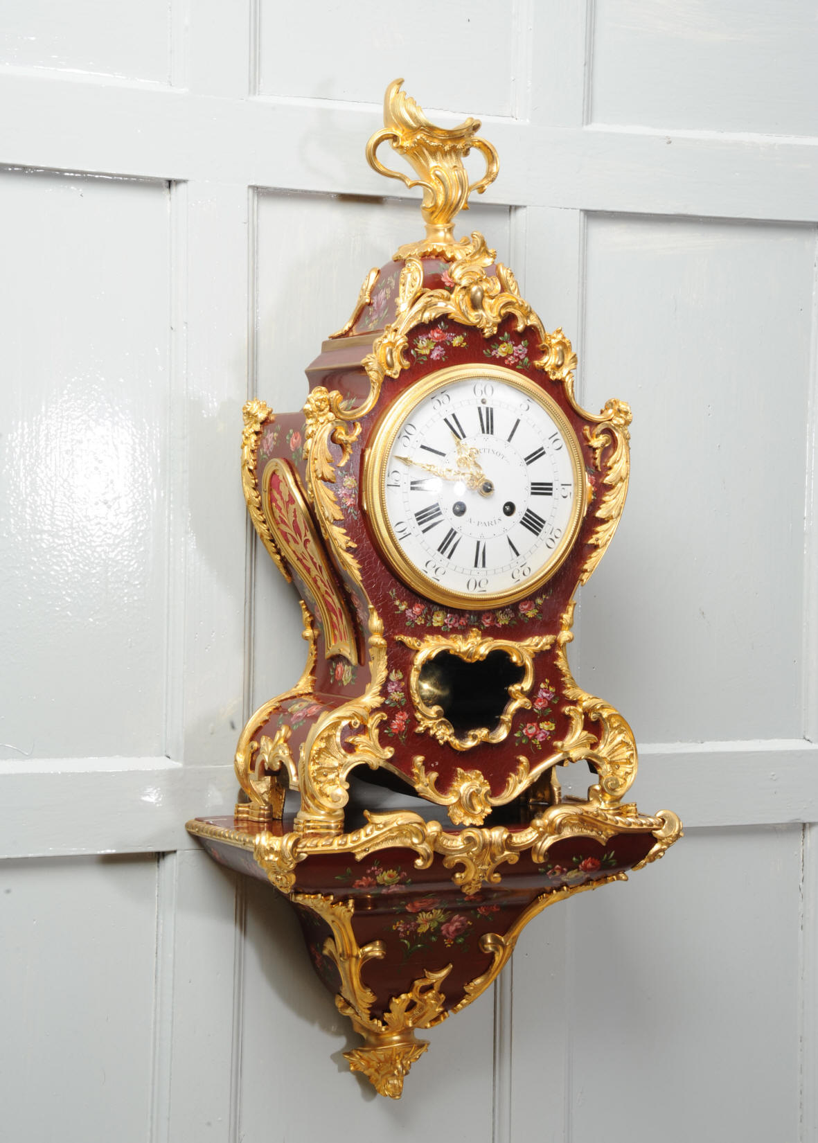 The large dial is porcelain enamel on copper with beautifully cut gilt hands. It is signed by the retailer Martinot à Paris. Martinot is an illustrious clockmaking name from the 17th and 18th centuries however by this age we think it was a trading name of Chartier & Marcus. The firm of Chariter and Marcus is listed in Tardy, Dictionnaire des Horlogers. The French movement is by Chartier & Marcus and is of high quality. It is in excellent clean and running condition. Pendulum is original. It runs for 8 days and strikes the hours and halves on a bell. Click the video clip below to hear the bell and watch the clock running. Condition of the case is excellent, The lacquer is in very good condition, there are a few very minor losses, mostly to the top of the bracket. The finish of the lacquer is very good, bright and clean with a lovely antique crackelure. The Ormolu is bright and clean with no losses. Dial is also excellent with no chips or scratches.