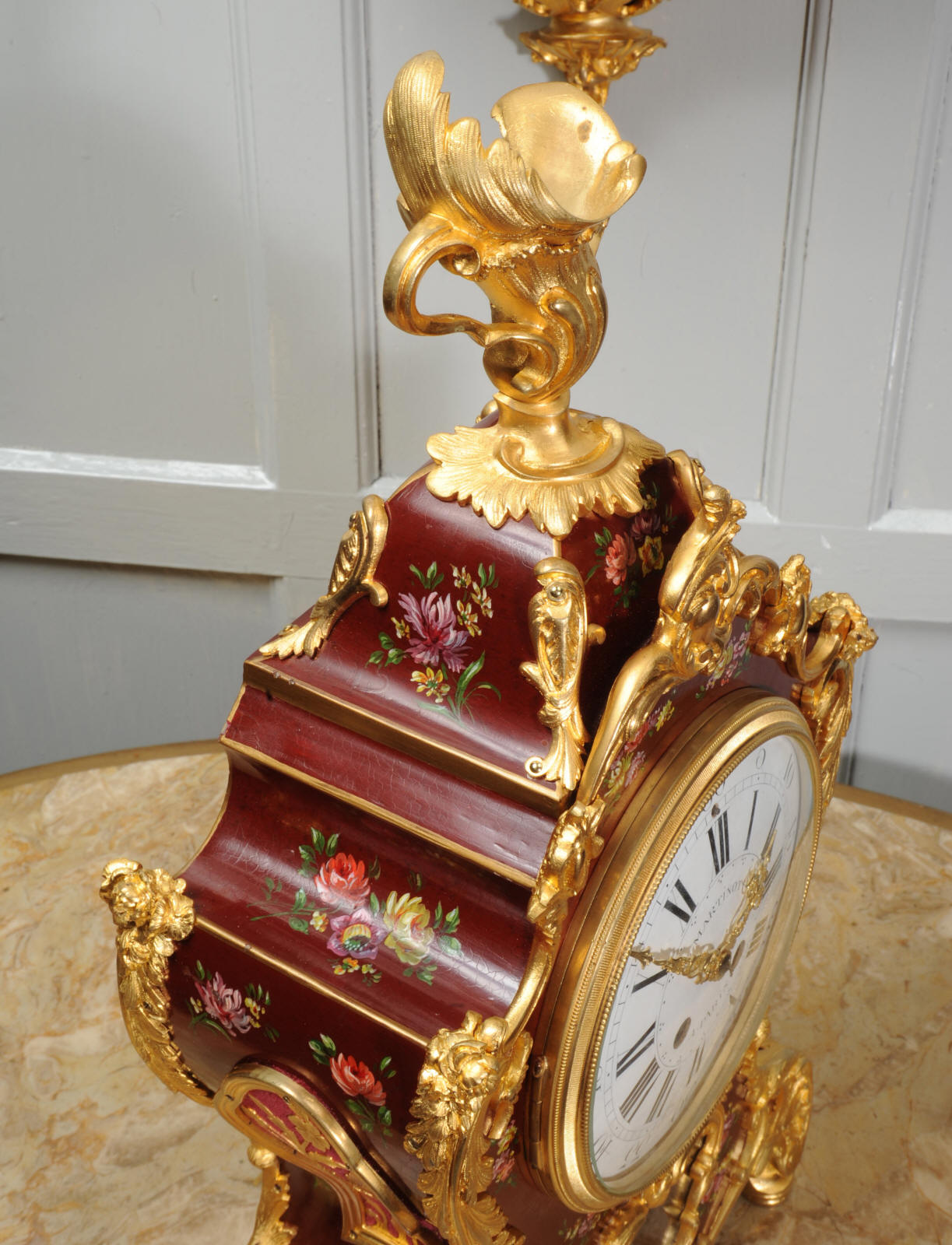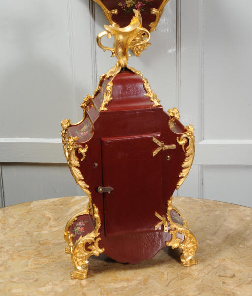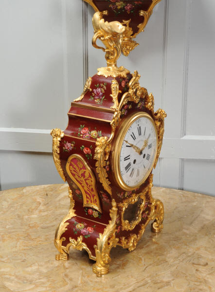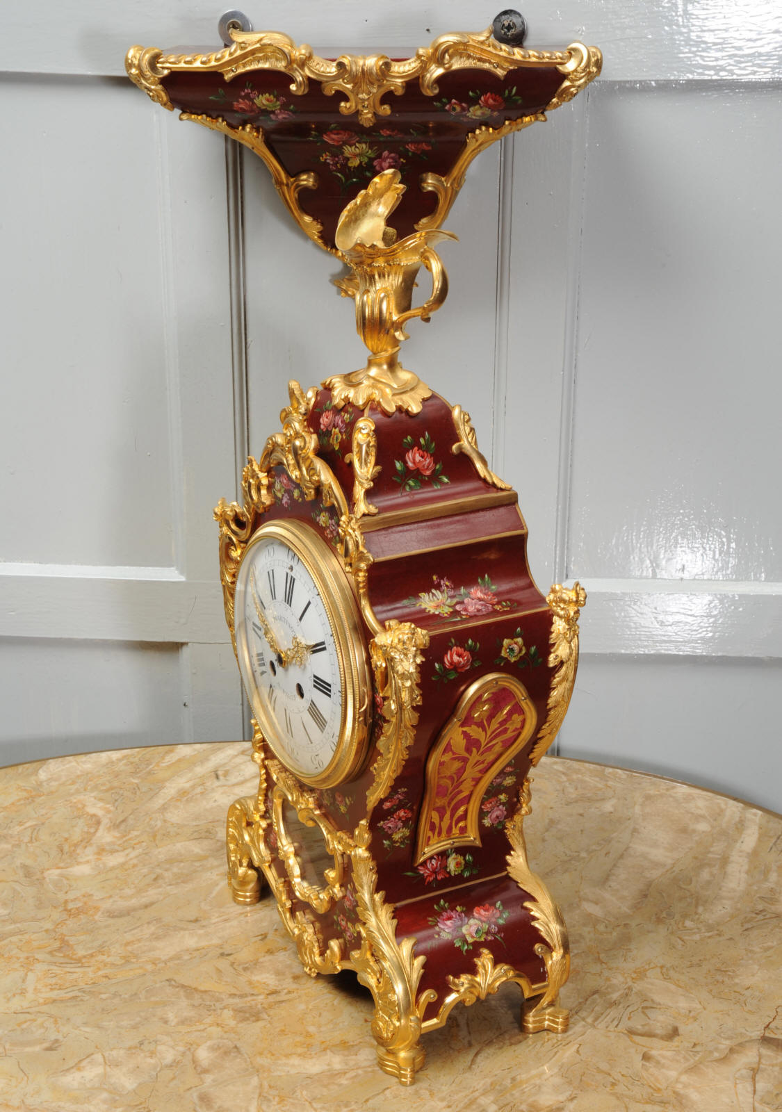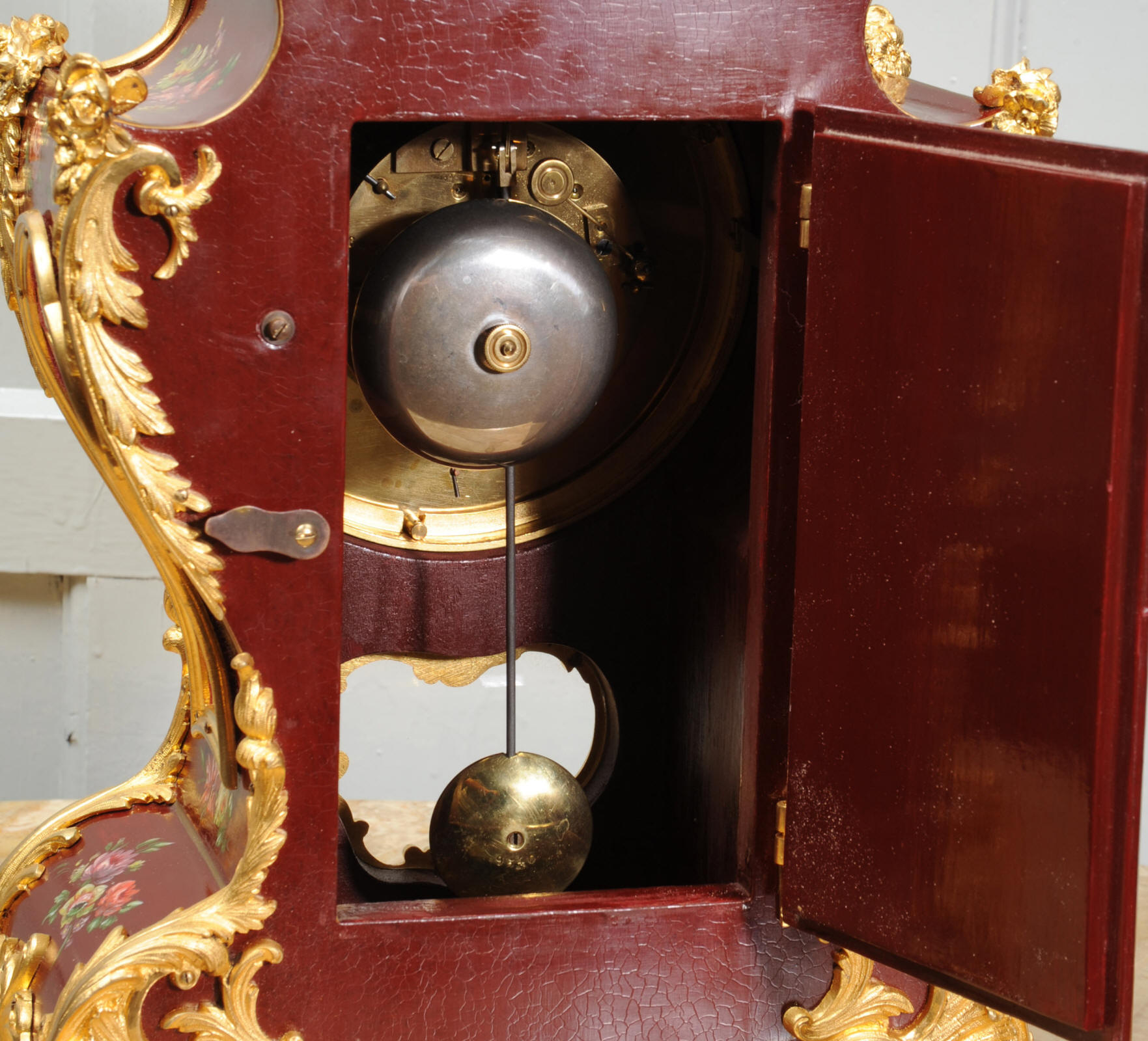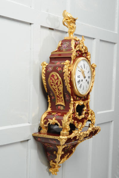 The large dial is porcelain enamel on copper with beautifully cut gilt hands. It is signed by the retailer Martinot à Paris. Martinot is an illustrious clockmaking name from the 17th and 18th centuries however by this age we think it was a trading name of Chartier & Marcus. The firm of Chariter and Marcus is listed in Tardy, Dictionnaire des Horlogers. The French movement is by Chartier & Marcus and is of high quality. It is in excellent clean and running condition. Pendulum is original. It runs for 8 days and strikes the hours and halves on a bell. Click the video clip below to hear the bell and watch the clock running. Condition of the case is excellent, The lacquer is in very good condition, there are a few very minor losses, mostly to the top of the bracket. The finish of the lacquer is very good, bright and clean with a lovely antique crackelure. The Ormolu is bright and clean with no losses. Dial is also excellent with no chips or scratches.
