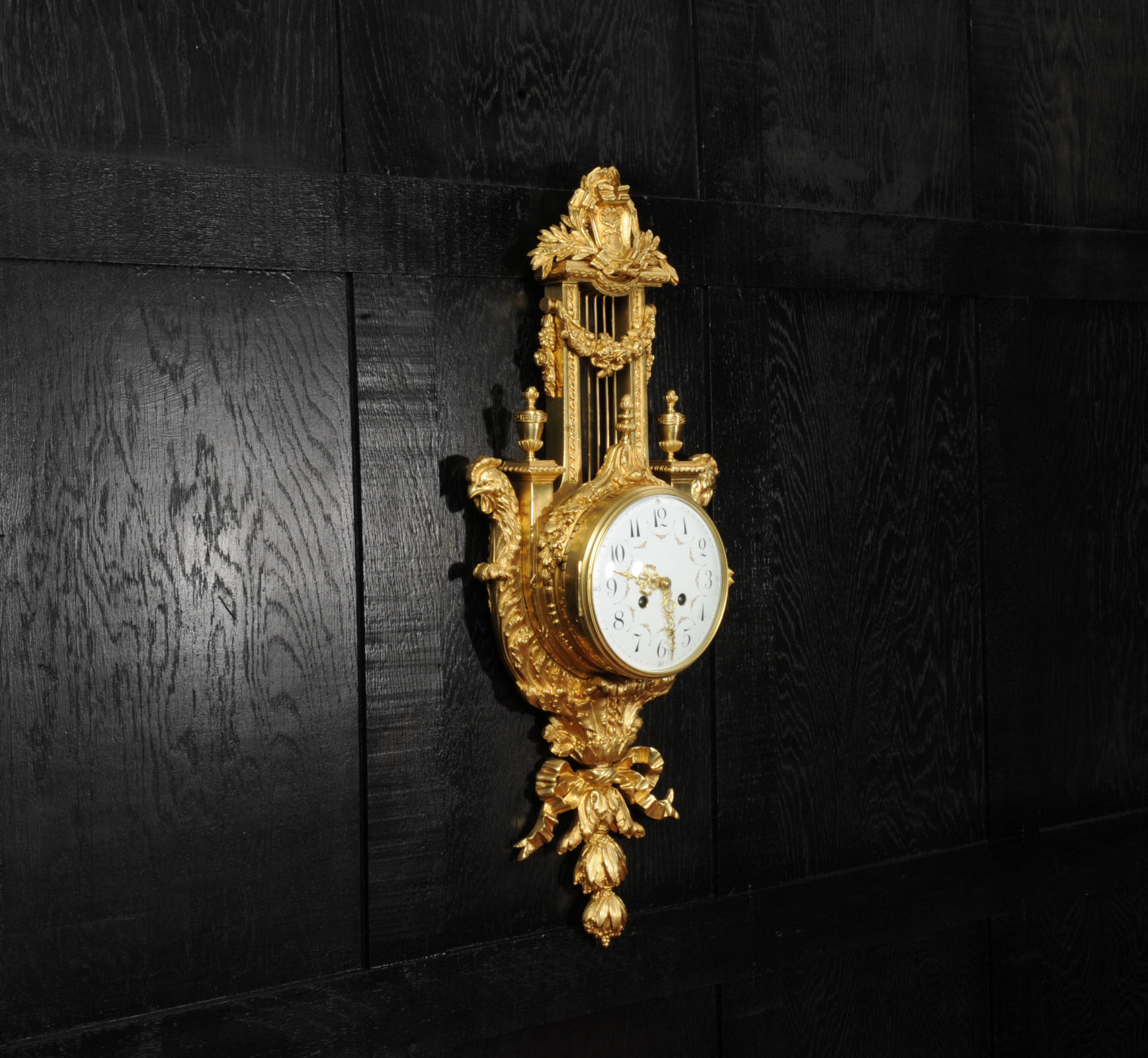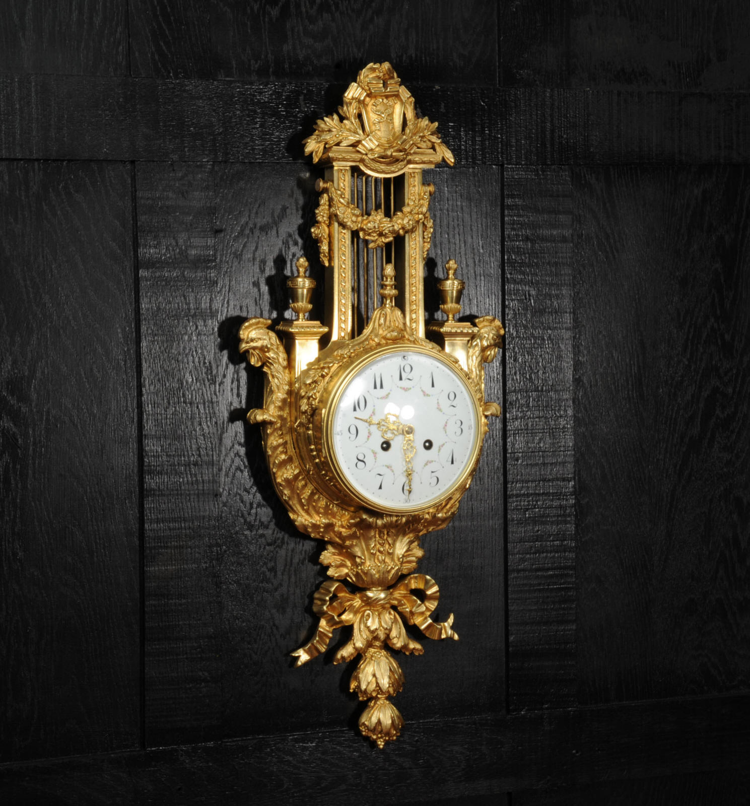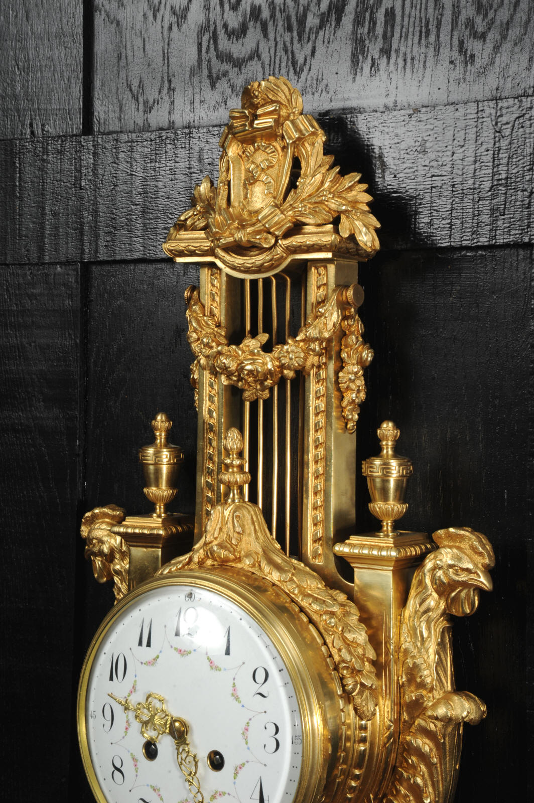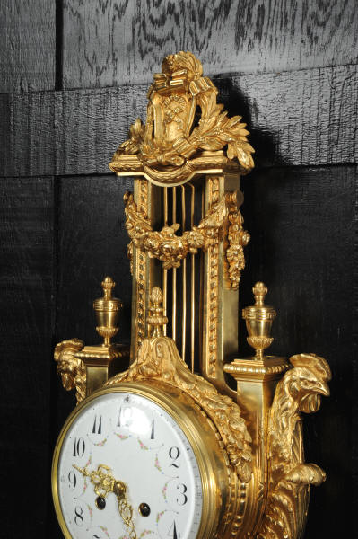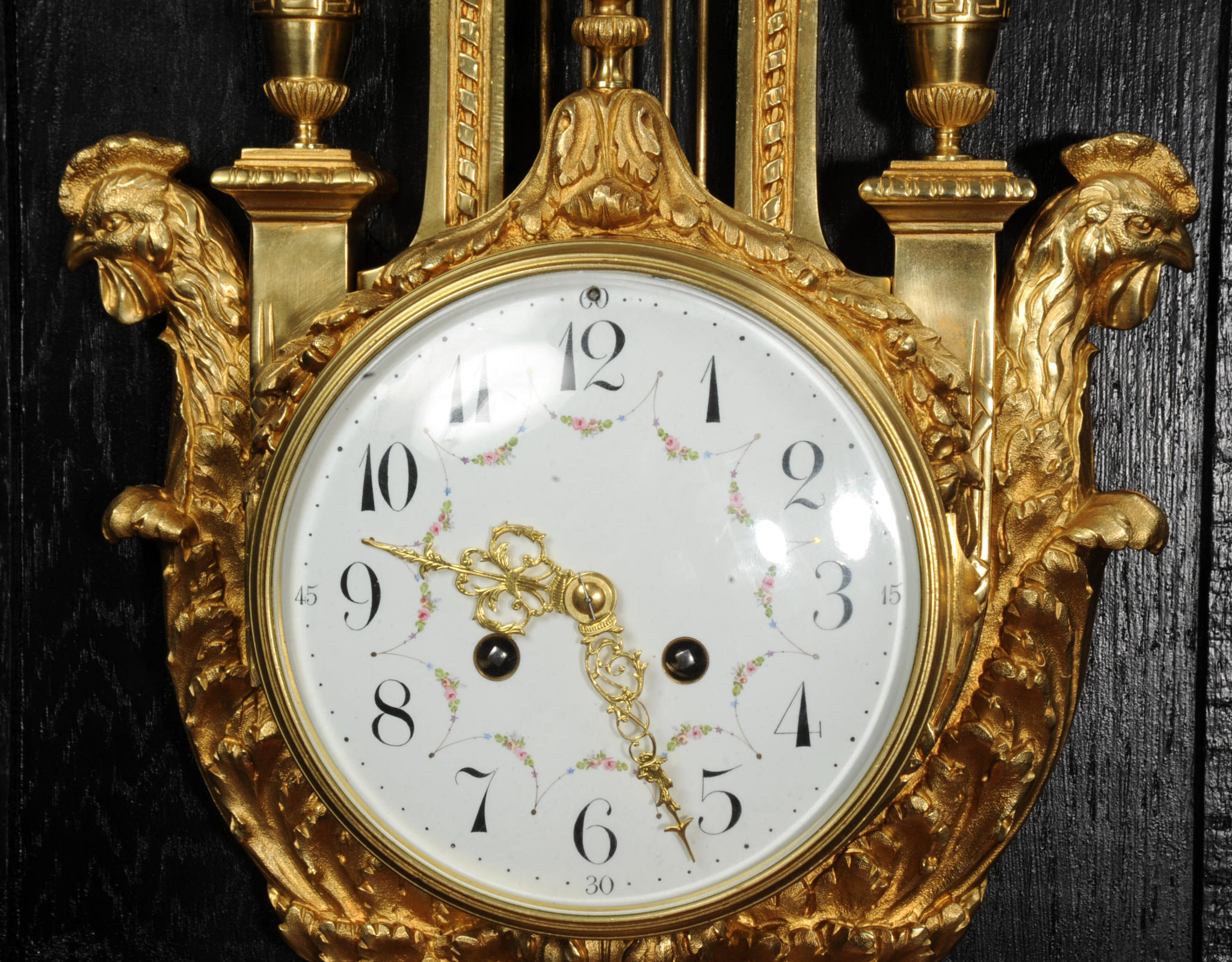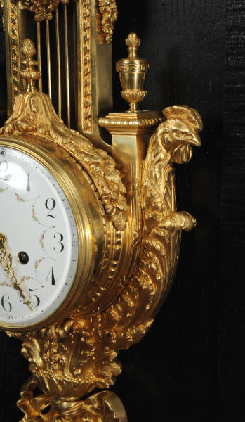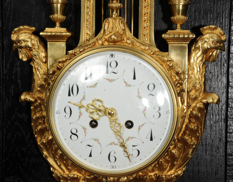 Below the dial, the body of the lyre is hung with extending plumes of acanthus leaves tied with bows. The dial is porcelain enamel on copper with floral swags and beautifully cut and pieced gilt brass hands. The French movement is of high quality and is by Vincenti. It is in excellent clean and running condition having been fully overhauled by our clockmaker. Pendulum is a replacement. It runs for 8 days and strikes the hours and halves on a bell. Click the video to hear the bell and watch the clock running. One notable feature of this clock is the cockerel or rooster heads forming the termination of the acanthus decoration. The origin of this emblem dates back to Ancient history but is believed to have been used most widely after the revolution in 1789. Symbolizing the National Emblem of France, the Gallic Rooster adorned French flags during that time. The significance of this symbol lies in its play on words, with "gallus" meaning both Gaul and rooster in Latin, making it a meaningful representation of the French people. Condition of the case is excellent, the original gilding is beautifully clean and bright with hardly any wear or discolouration. The dial is also in excellent condition with no damage.
