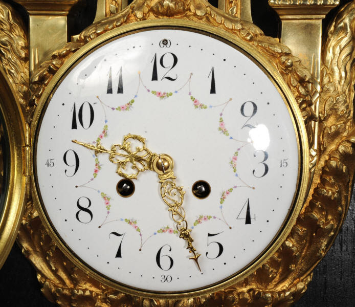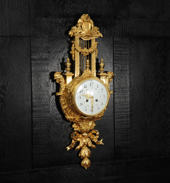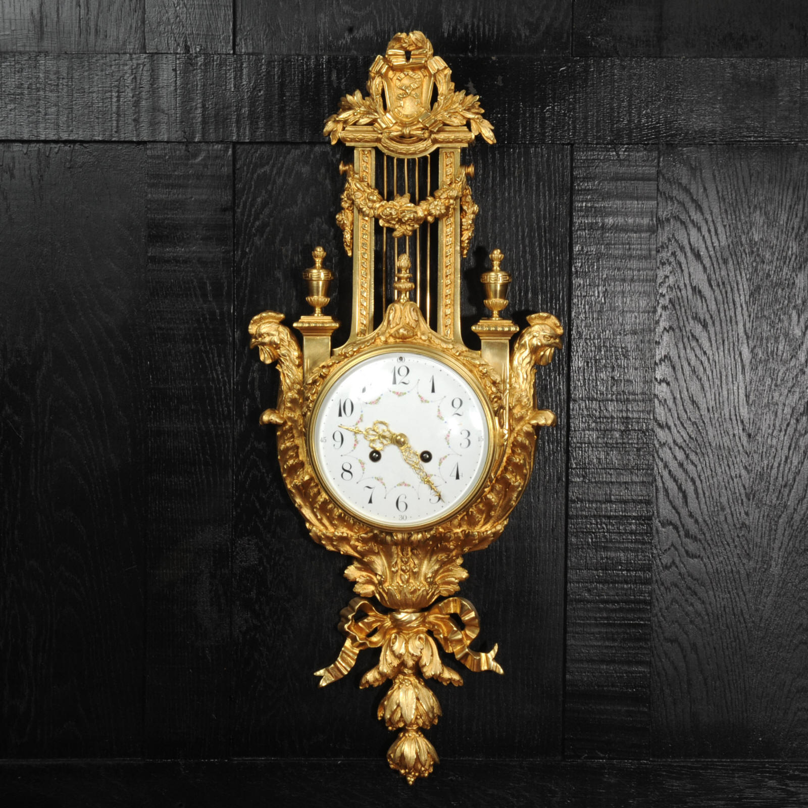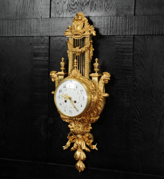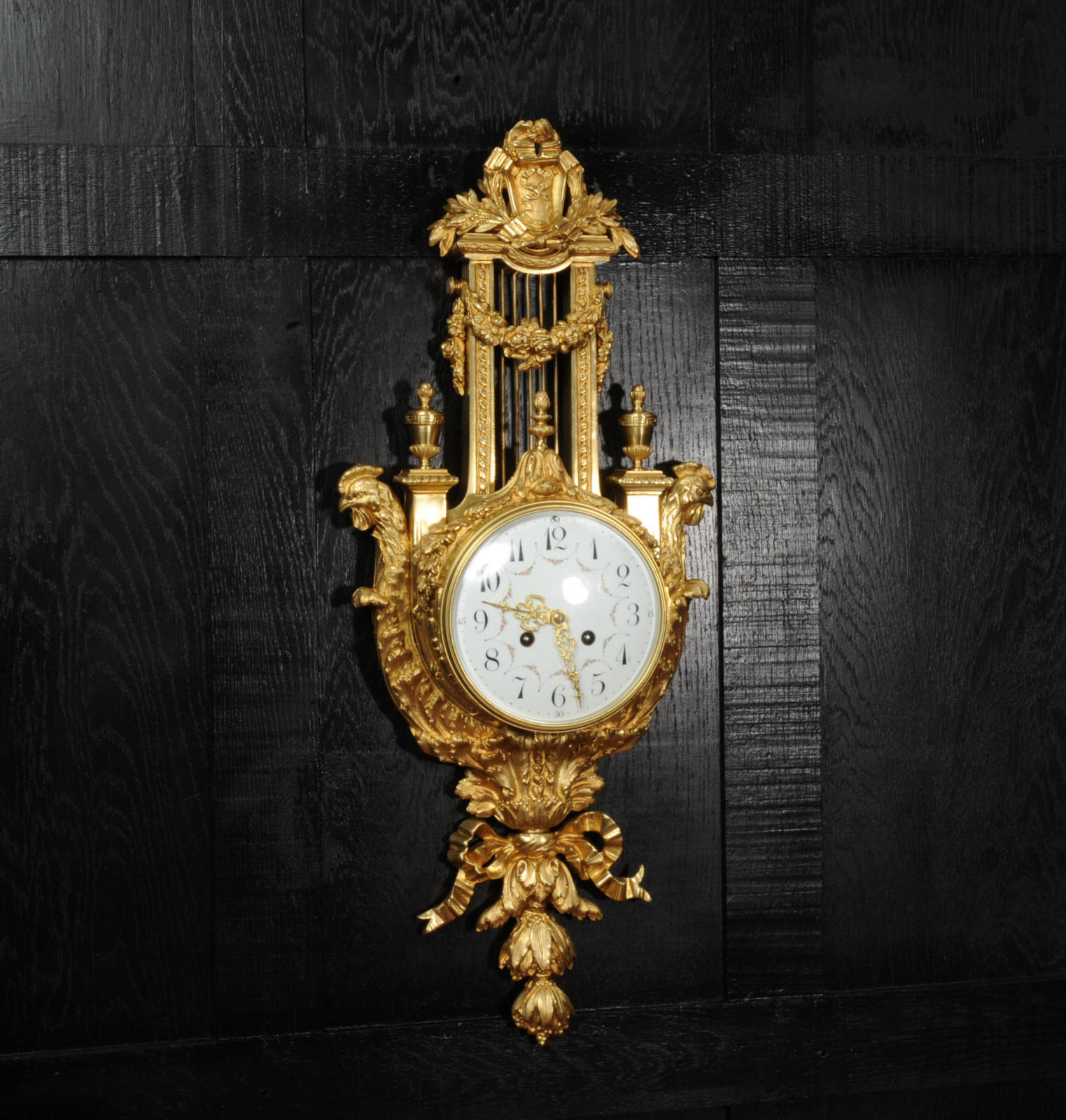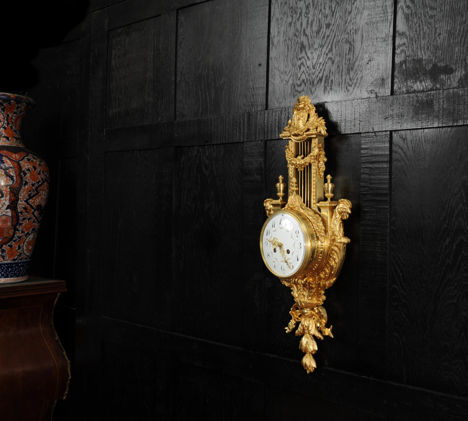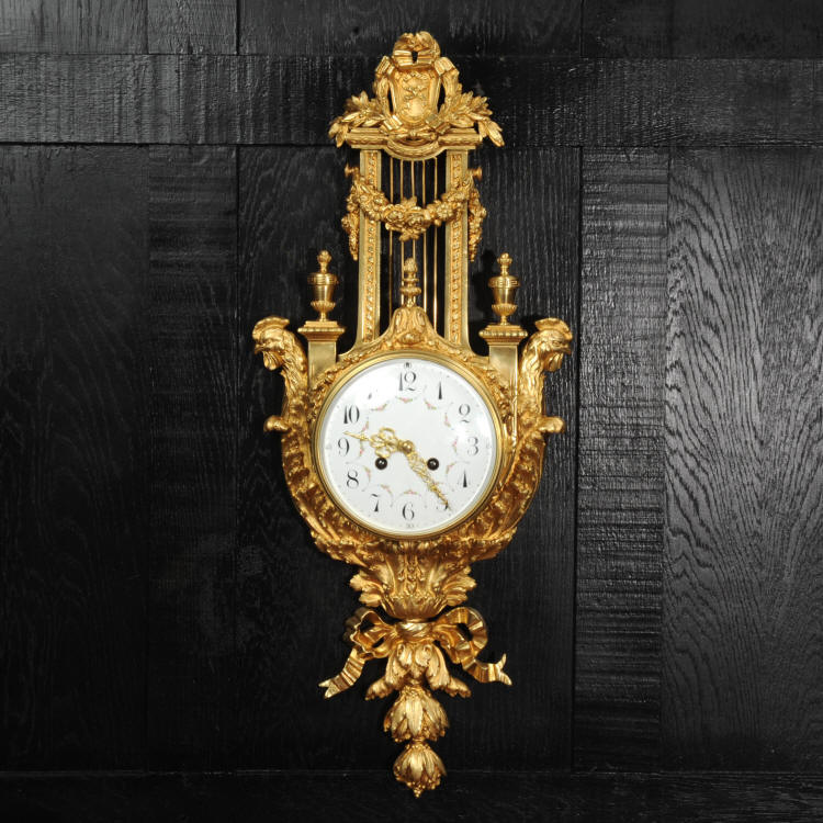 Below the dial, the body of the lyre is hung with extending plumes of acanthus leaves tied with bows. The dial is porcelain enamel on copper with floral swags and beautifully cut and pieced gilt brass hands. The French movement is of high quality and is by Vincenti. It is in excellent clean and running condition having been fully overhauled by our clockmaker. Pendulum is a replacement. It runs for 8 days and strikes the hours and halves on a bell. Click the video to hear the bell and watch the clock running. One notable feature of this clock is the cockerel or rooster heads forming the termination of the acanthus decoration. The origin of this emblem dates back to Ancient history but is believed to have been used most widely after the revolution in 1789. Symbolizing the National Emblem of France, the Gallic Rooster adorned French flags during that time. The significance of this symbol lies in its play on words, with "gallus" meaning both Gaul and rooster in Latin, making it a meaningful representation of the French people. Condition of the case is excellent, the original gilding is beautifully clean and bright with hardly any wear or discolouration. The dial is also in excellent condition with no damage.
