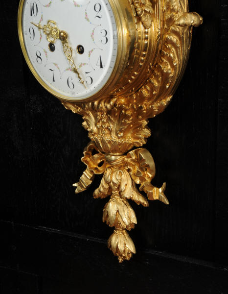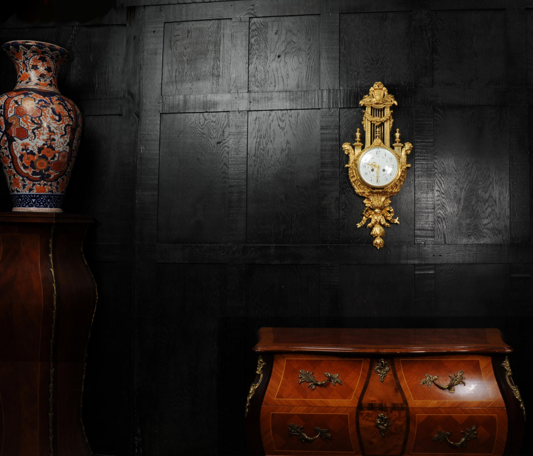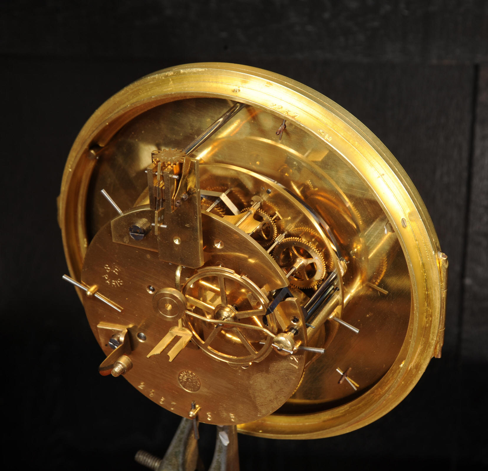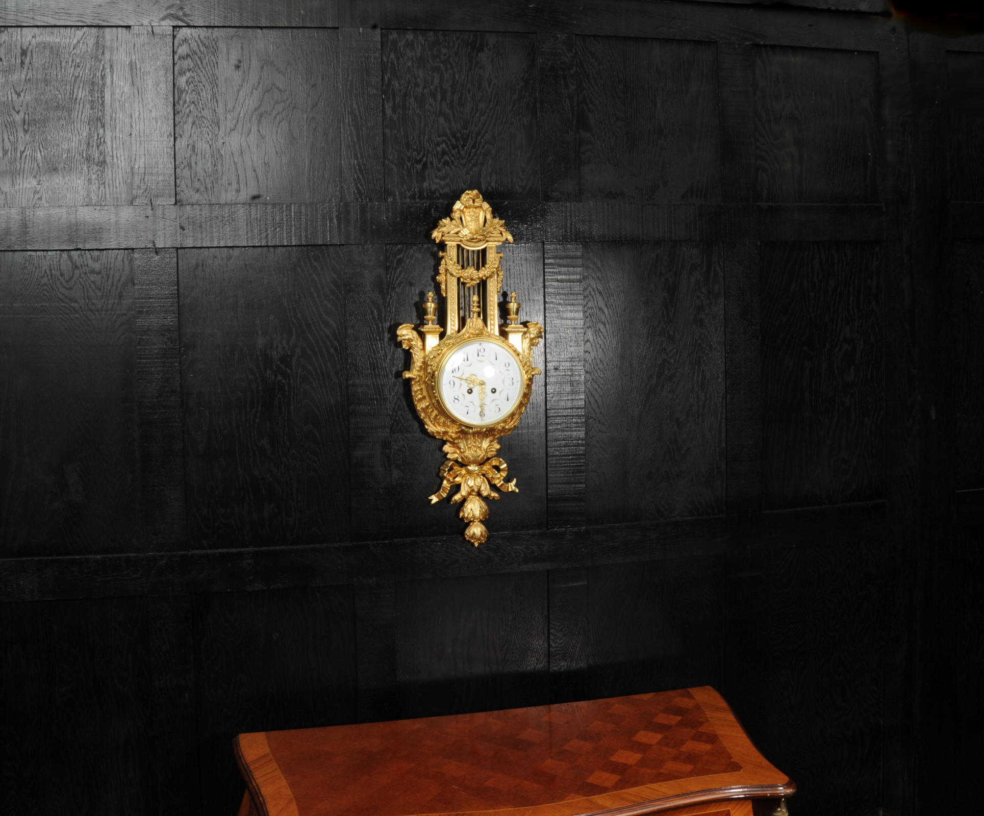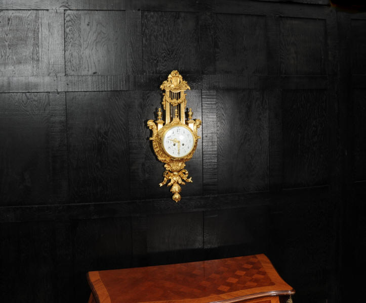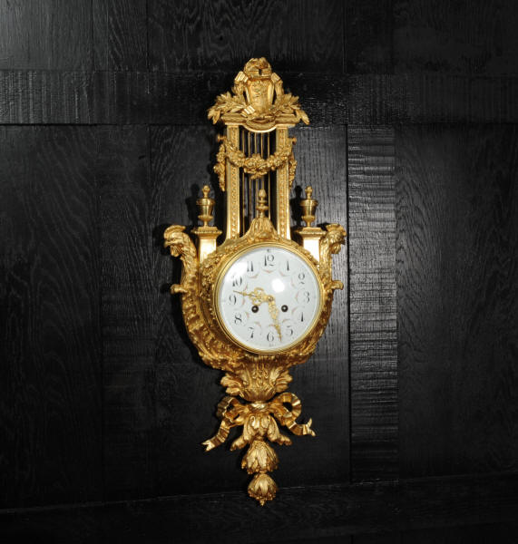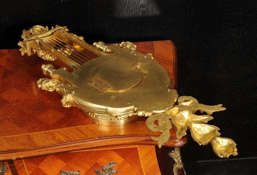 Below the dial, the body of the lyre is hung with extending plumes of acanthus leaves tied with bows. The dial is porcelain enamel on copper with floral swags and beautifully cut and pieced gilt brass hands. The French movement is of high quality and is by Vincenti. It is in excellent clean and running condition having been fully overhauled by our clockmaker. Pendulum is a replacement. It runs for 8 days and strikes the hours and halves on a bell. Click the video to hear the bell and watch the clock running. One notable feature of this clock is the cockerel or rooster heads forming the termination of the acanthus decoration. The origin of this emblem dates back to Ancient history but is believed to have been used most widely after the revolution in 1789. Symbolizing the National Emblem of France, the Gallic Rooster adorned French flags during that time. The significance of this symbol lies in its play on words, with "gallus" meaning both Gaul and rooster in Latin, making it a meaningful representation of the French people. Condition of the case is excellent, the original gilding is beautifully clean and bright with hardly any wear or discolouration. The dial is also in excellent condition with no damage.