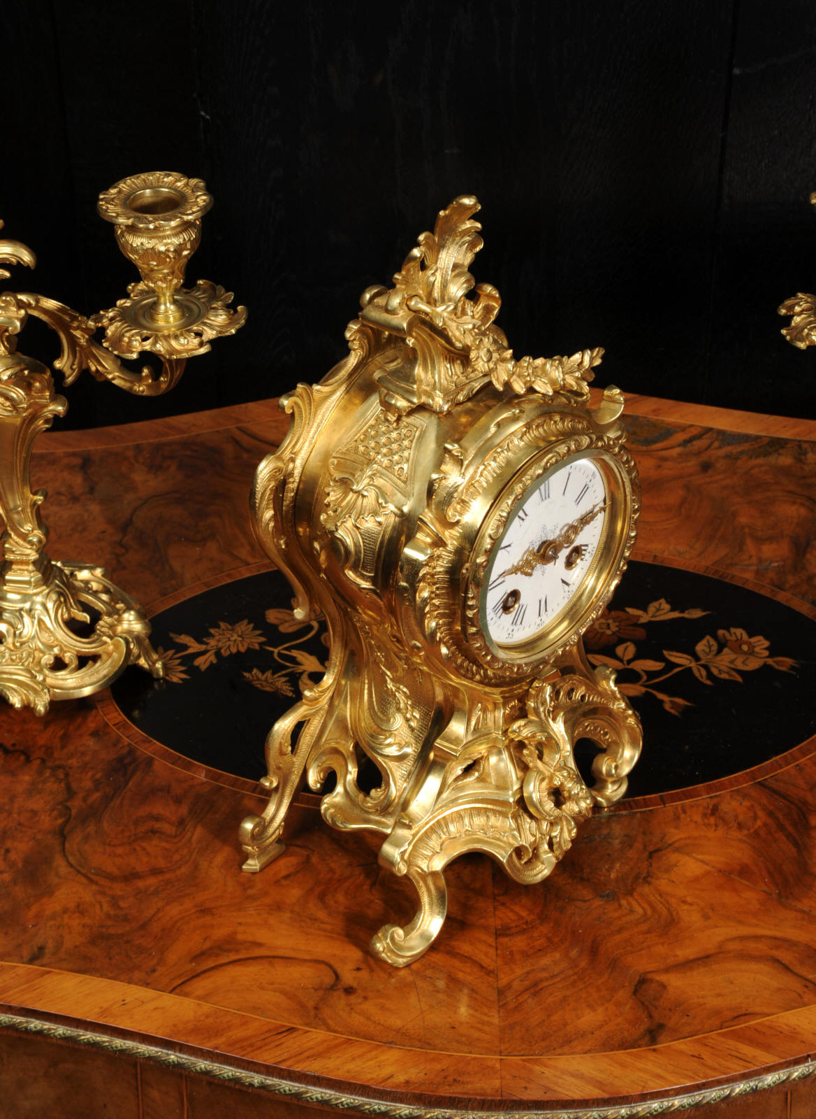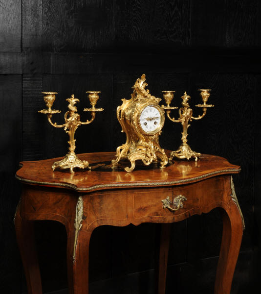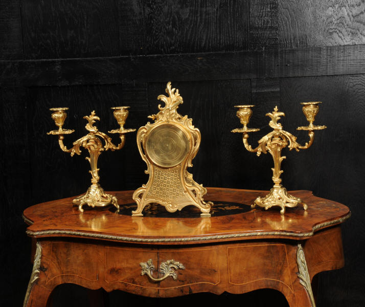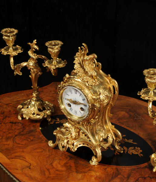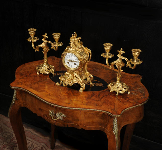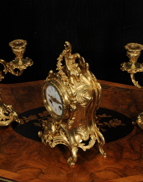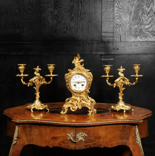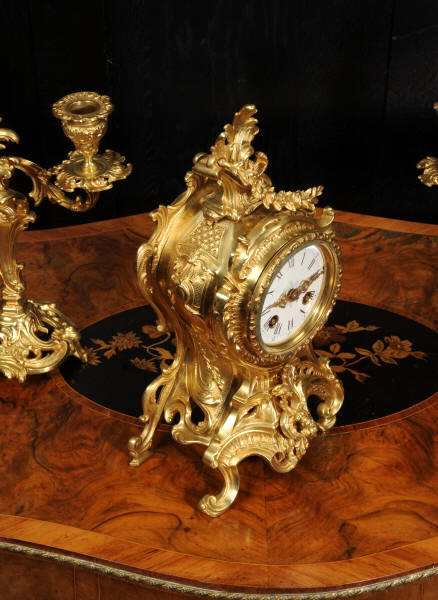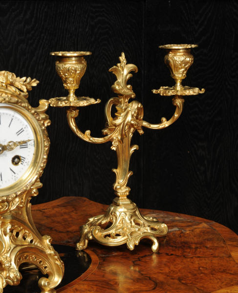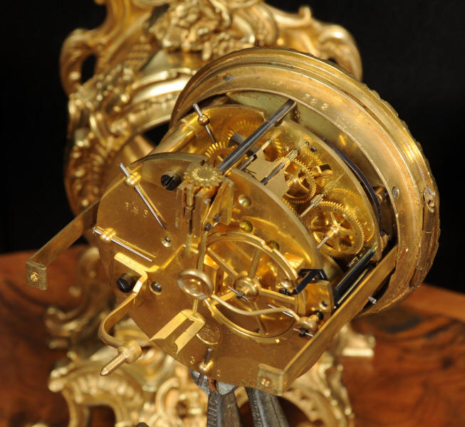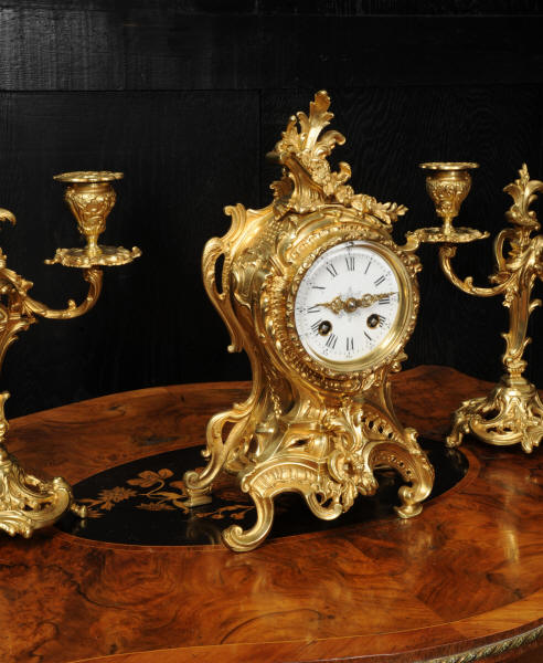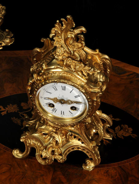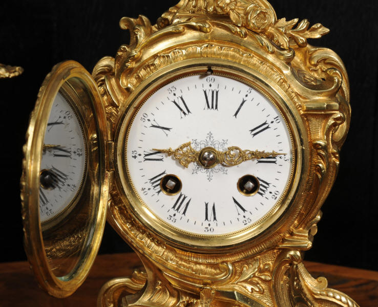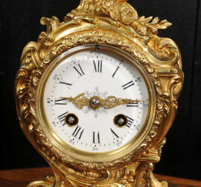 The dial is porcelain enamel on copper with finely cut and fretted gilt brass hands and a Rococo bezel. The French movement is of high quality and is by Louis Japy. It is in excellent clean and running condition having been fully overhauled by our clockmaker. Pendulum is a replacement. It runs for 8 days and strikes the hours and halves on a bell. Click the video to hear the bell and watch the clock running. Condition of the case is excellent, the original gilding is beautifully clean and bright with hardly any wear or discolouration. The dial is also in excellent condition, just a small chip to the edge at the fifteen minutes.