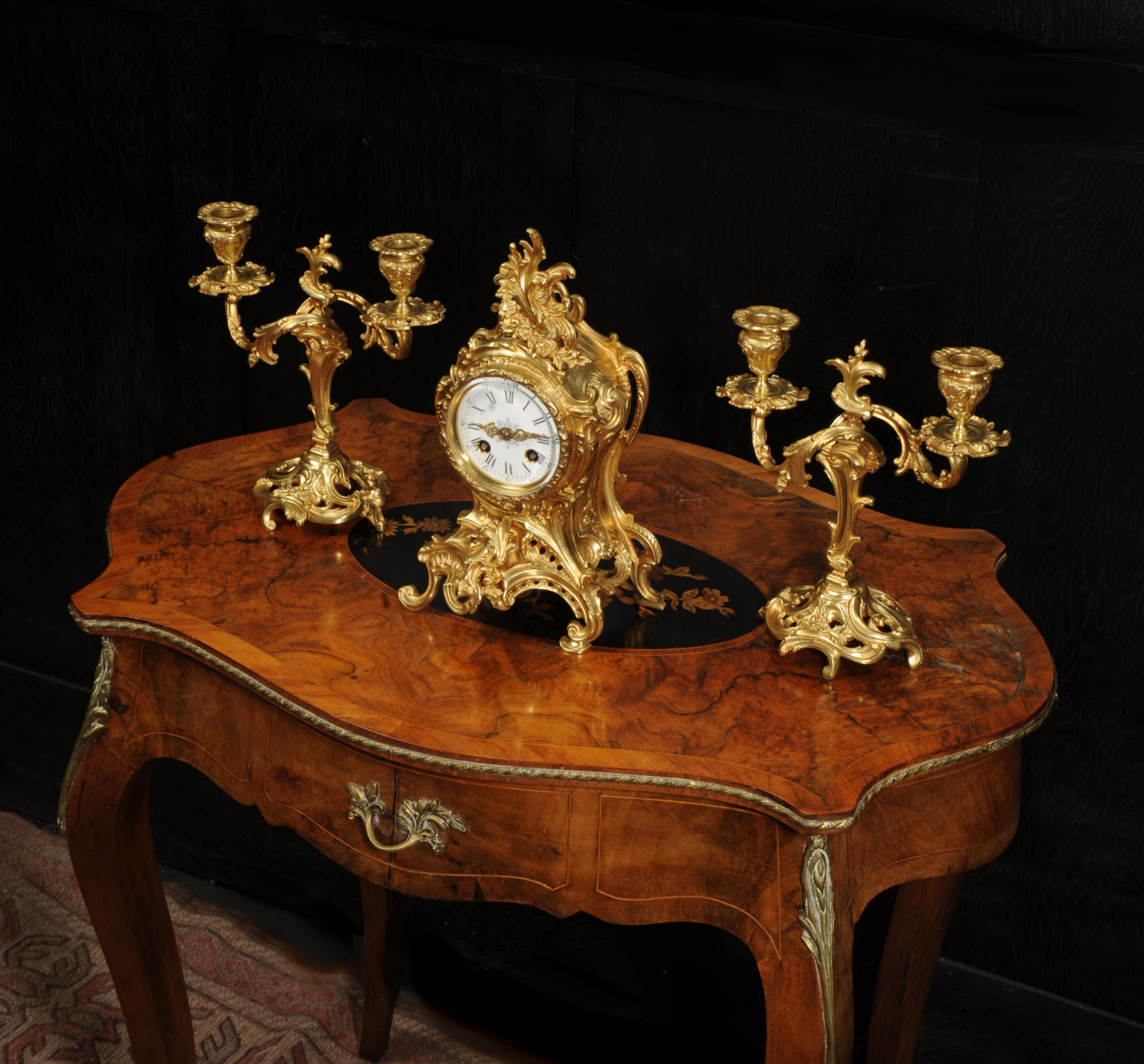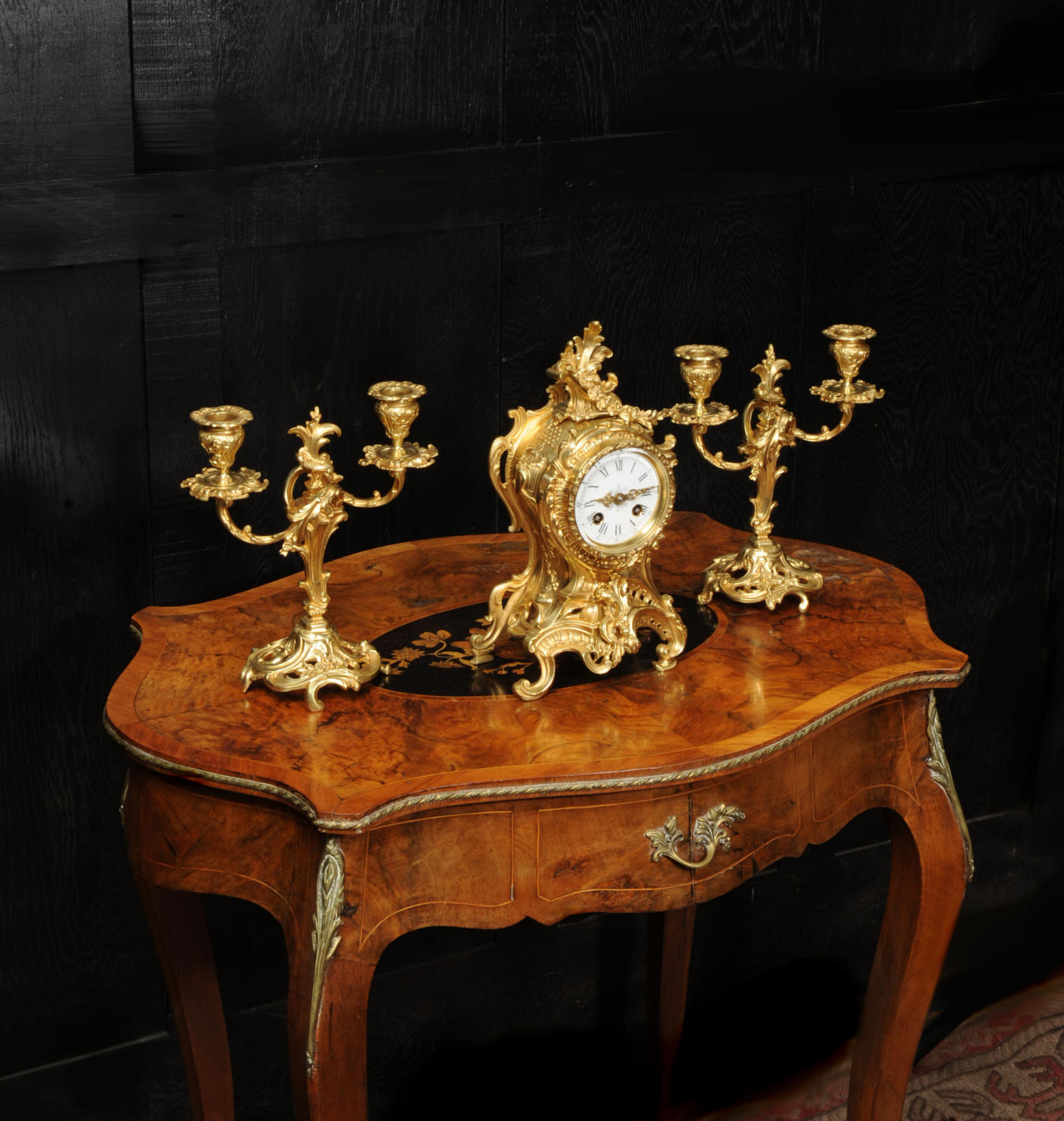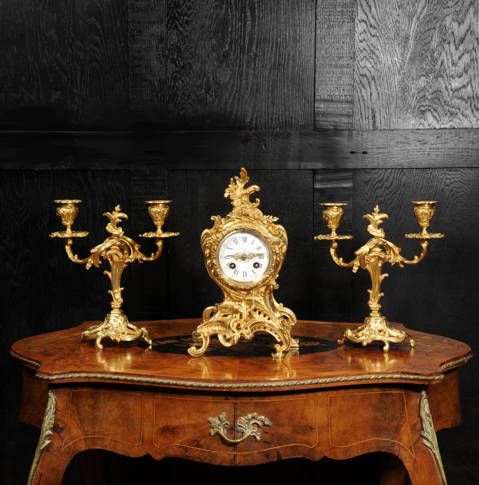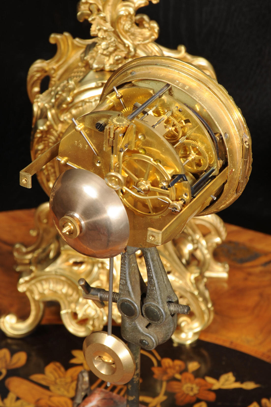 The dial is porcelain enamel on copper with finely cut and fretted gilt brass hands and a Rococo bezel. The French movement is of high quality and is by Louis Japy. It is in excellent clean and running condition having been fully overhauled by our clockmaker. Pendulum is a replacement. It runs for 8 days and strikes the hours and halves on a bell. Click the video to hear the bell and watch the clock running. Condition of the case is excellent, the original gilding is beautifully clean and bright with hardly any wear or discolouration. The dial is also in excellent condition, just a small chip to the edge at the fifteen minutes.