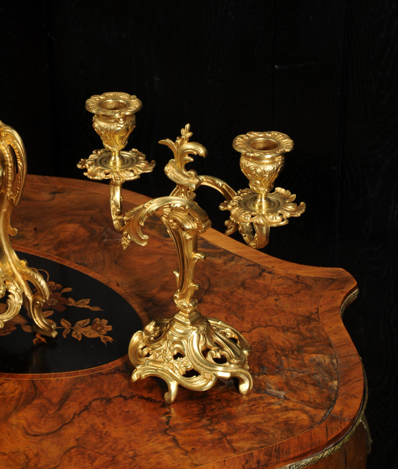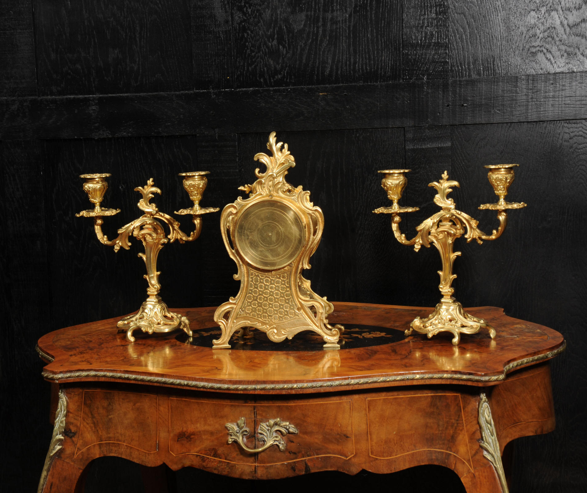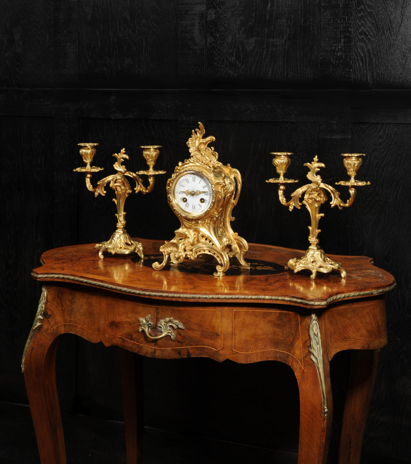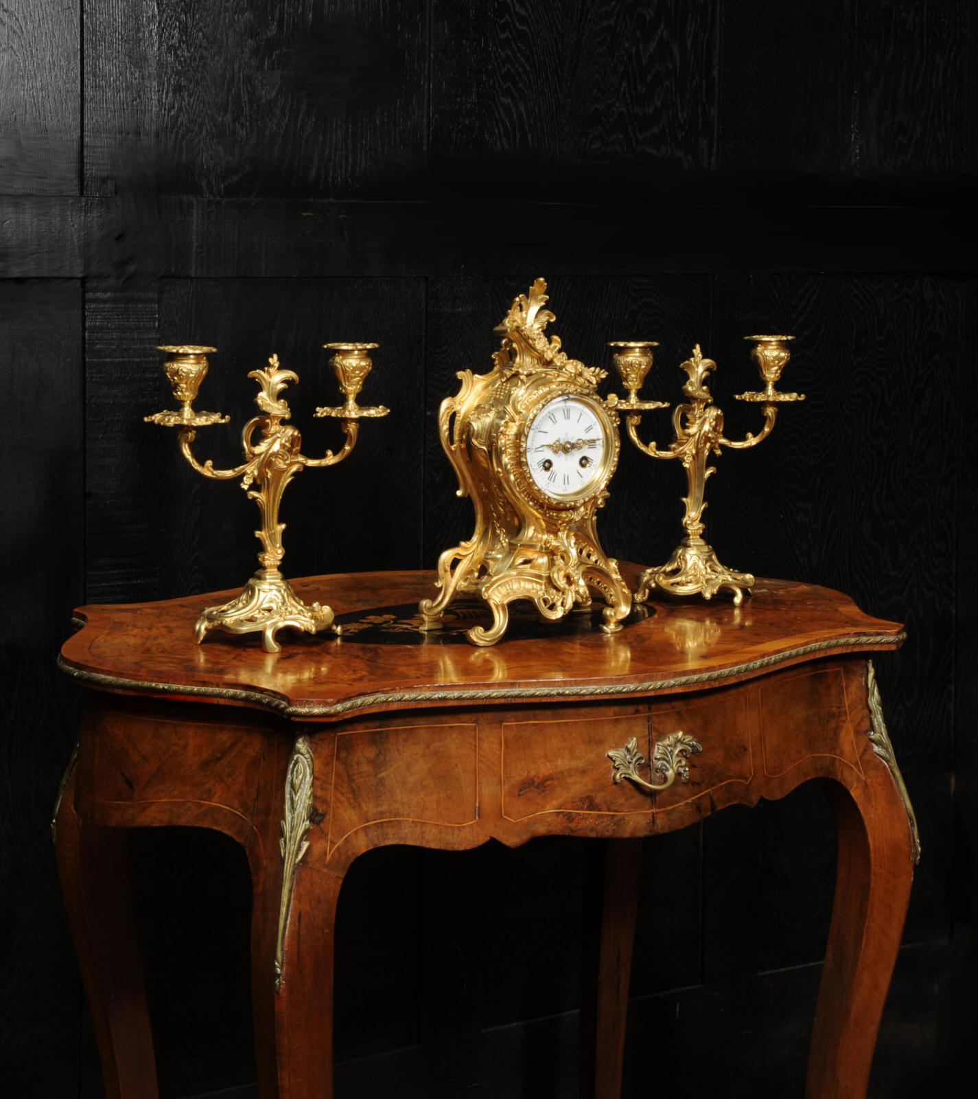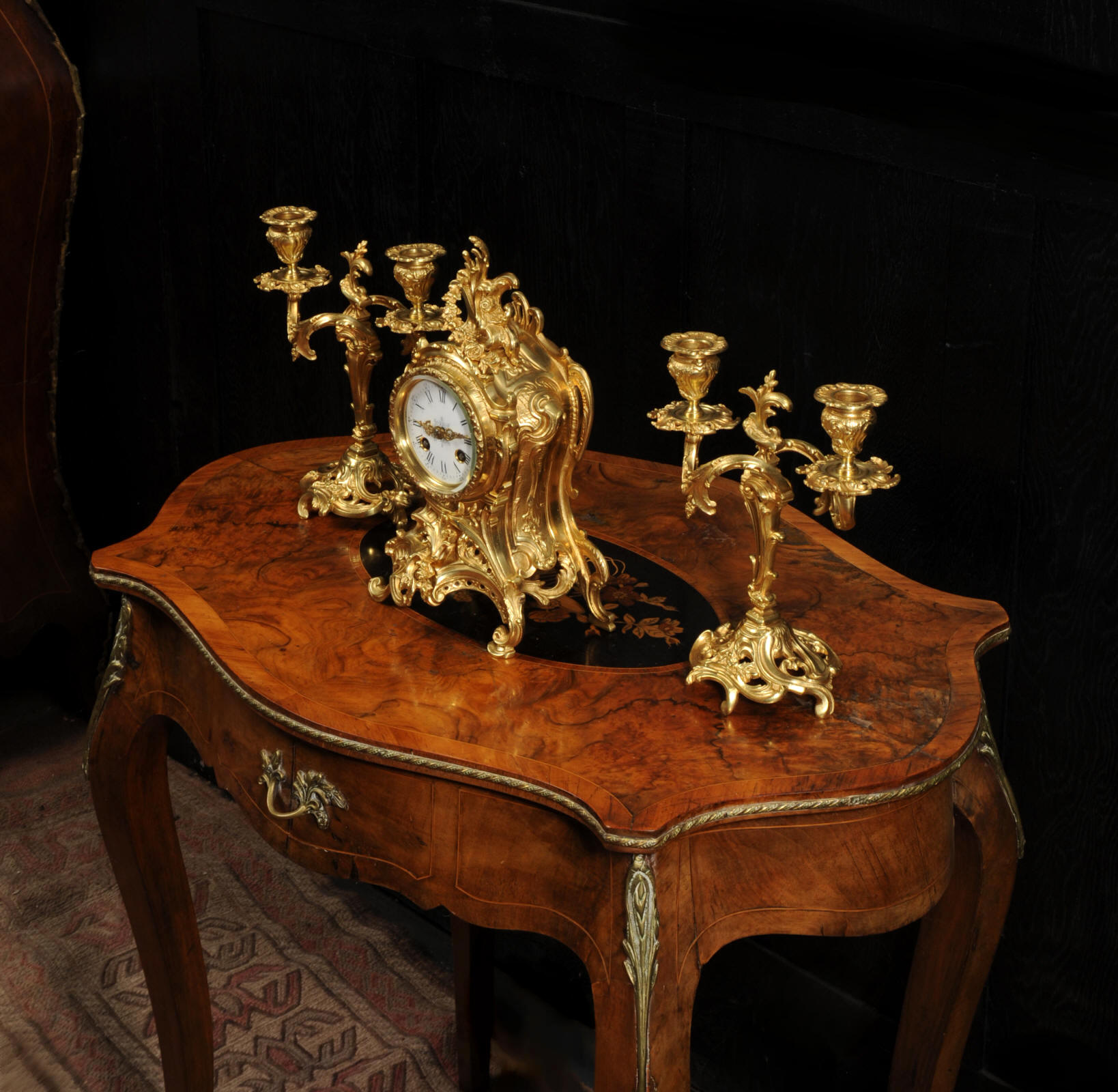The dial is porcelain enamel on copper with finely cut and fretted gilt brass hands and a Rococo bezel. The French movement is of high quality and is by Louis Japy. It is in excellent clean and running condition having been fully overhauled by our clockmaker. Pendulum is a replacement. It runs for 8 days and strikes the hours and halves on a bell. Click the video to hear the bell and watch the clock running. Condition of the case is excellent, the original gilding is beautifully clean and bright with hardly any wear or discolouration. The dial is also in excellent condition, just a small chip to the edge at the fifteen minutes.