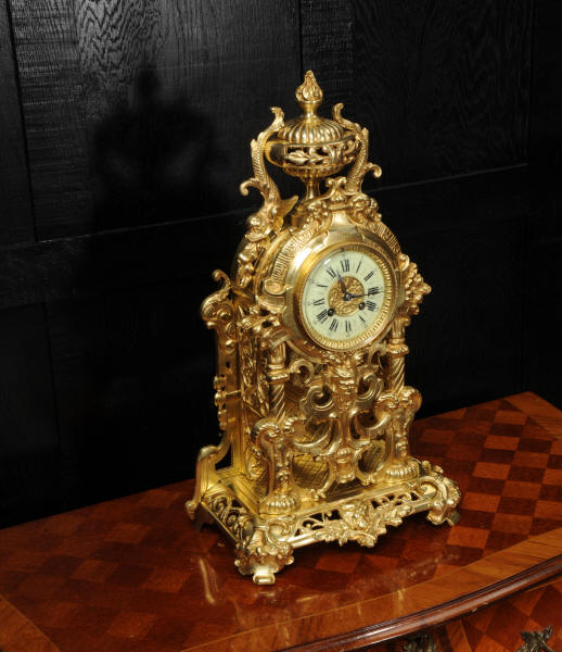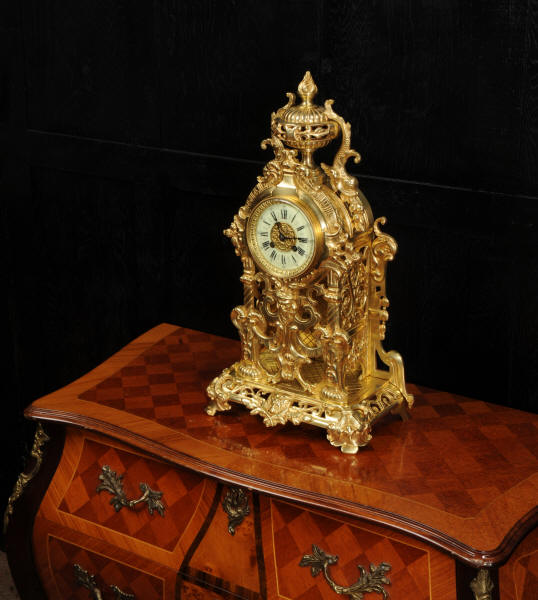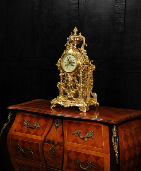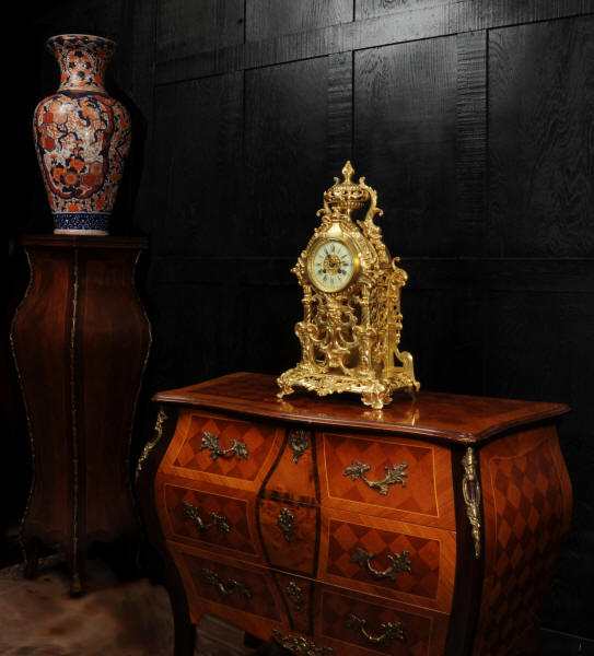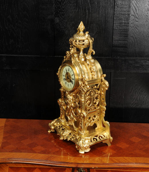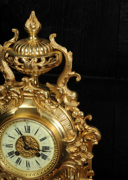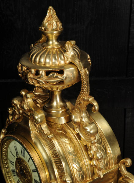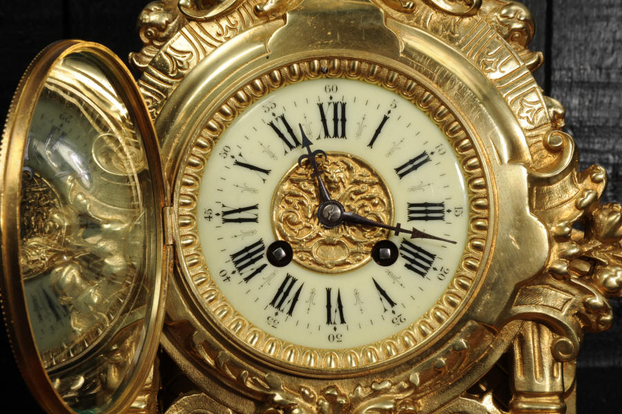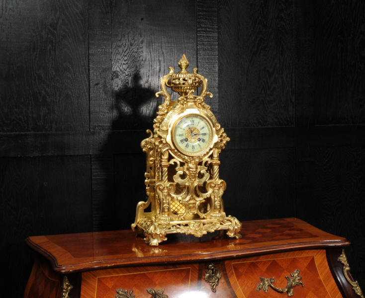 The dial is porcelain enamel on copper and is complete with its original fine blued steel hands. The French movement is of high quality and is by Louis Japy. It is in excellent clean and running condition having been fully overhauled by our clockmaker. Pendulum is original. It runs for 8 days and strikes the hours and halves on a bell. Click the video below to hear the bell and watch the clock running. Condition of the case is excellent, the original gilding is beautifully clean and bright with hardly any wear or discolouration. The dial is also in excellent condition just some tiny nibbles to the winding holes.
