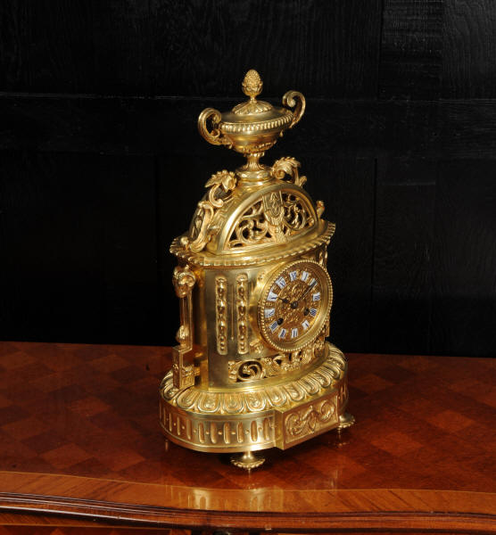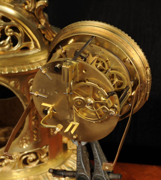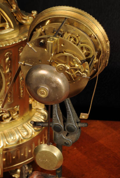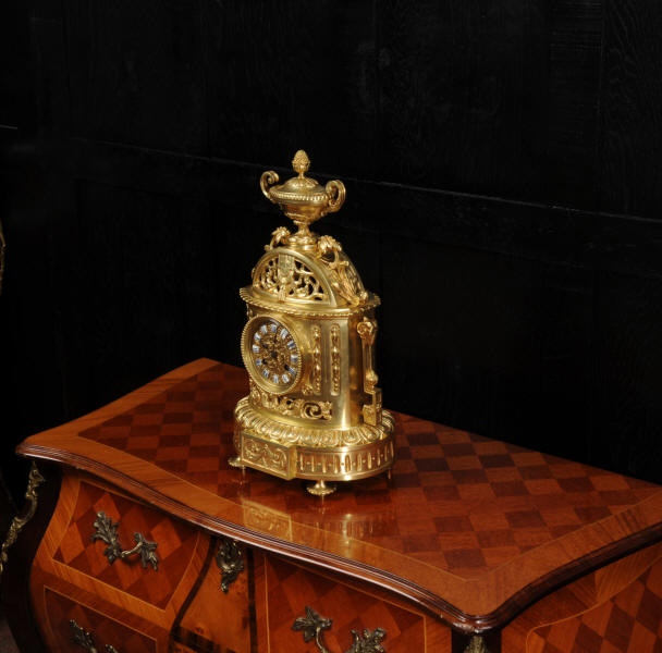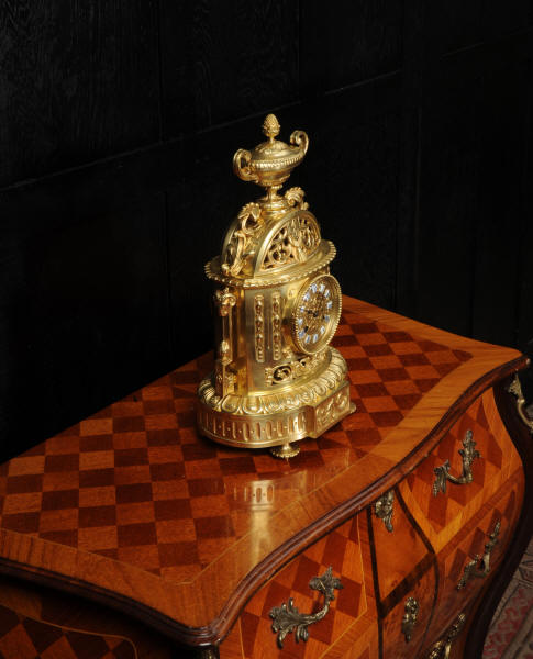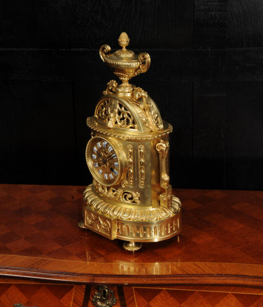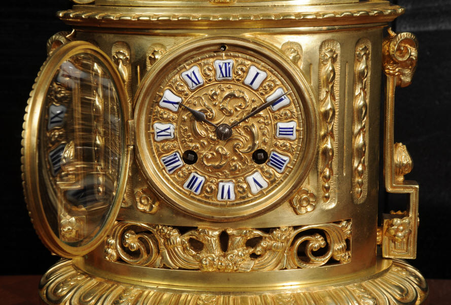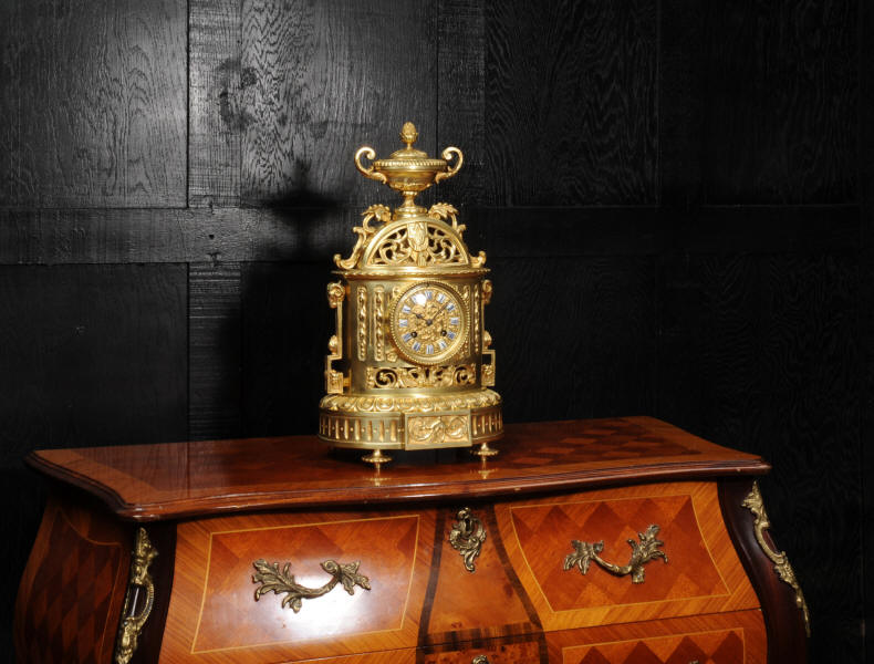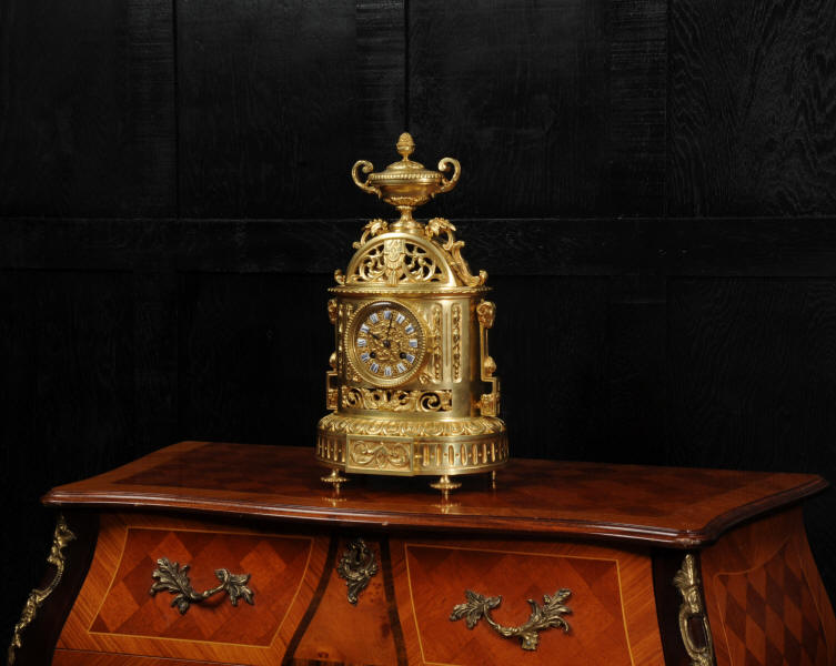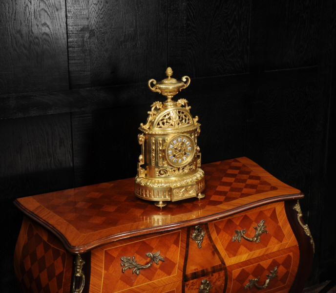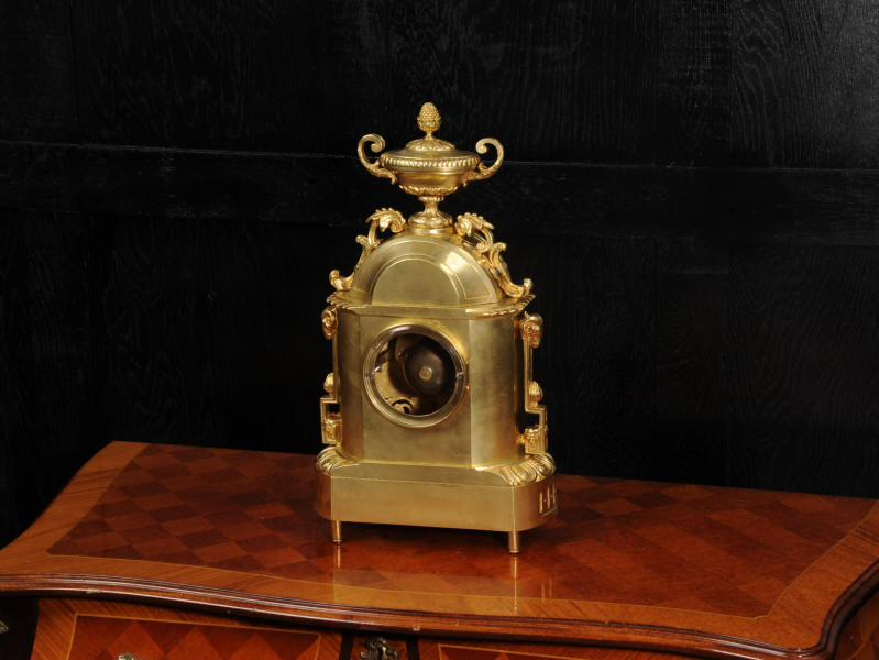 The dial is also gilt bronze with 12 individual enamel cartouches and blued steel hands. The rear door is also glazed to allow the movement to be seen. The French movement is of high quality and is by Japy Freres. It is in excellent clean and running condition having been fully overhauled by our clockmaker. Pendulum is an old replacement. It runs for 8 days and strikes the hours and halves on a bell. Click the video below to hear the bell and watch the clock running. Condition of the case is excellent, the original gilding is beautifully clean and bright with only slight discolouration, marks and tarnish. The dial is also in excellent condition with no damage.
