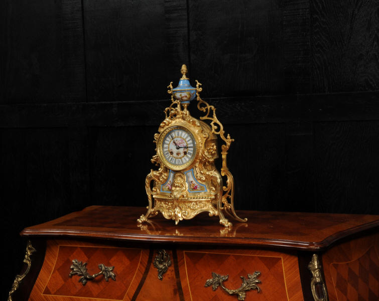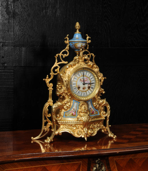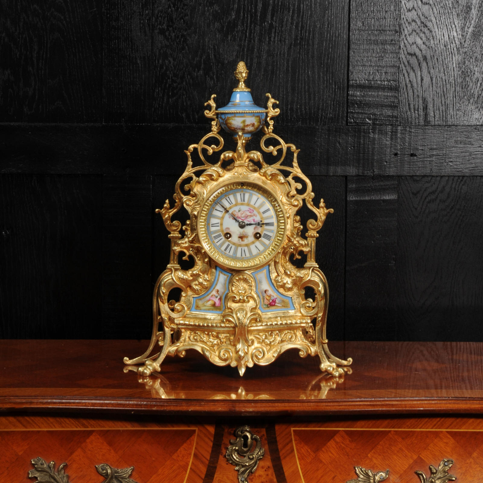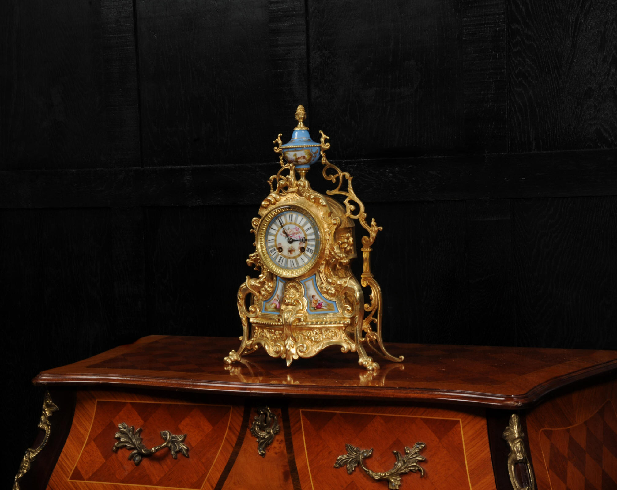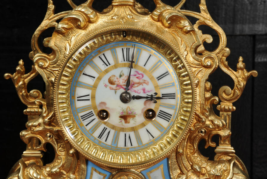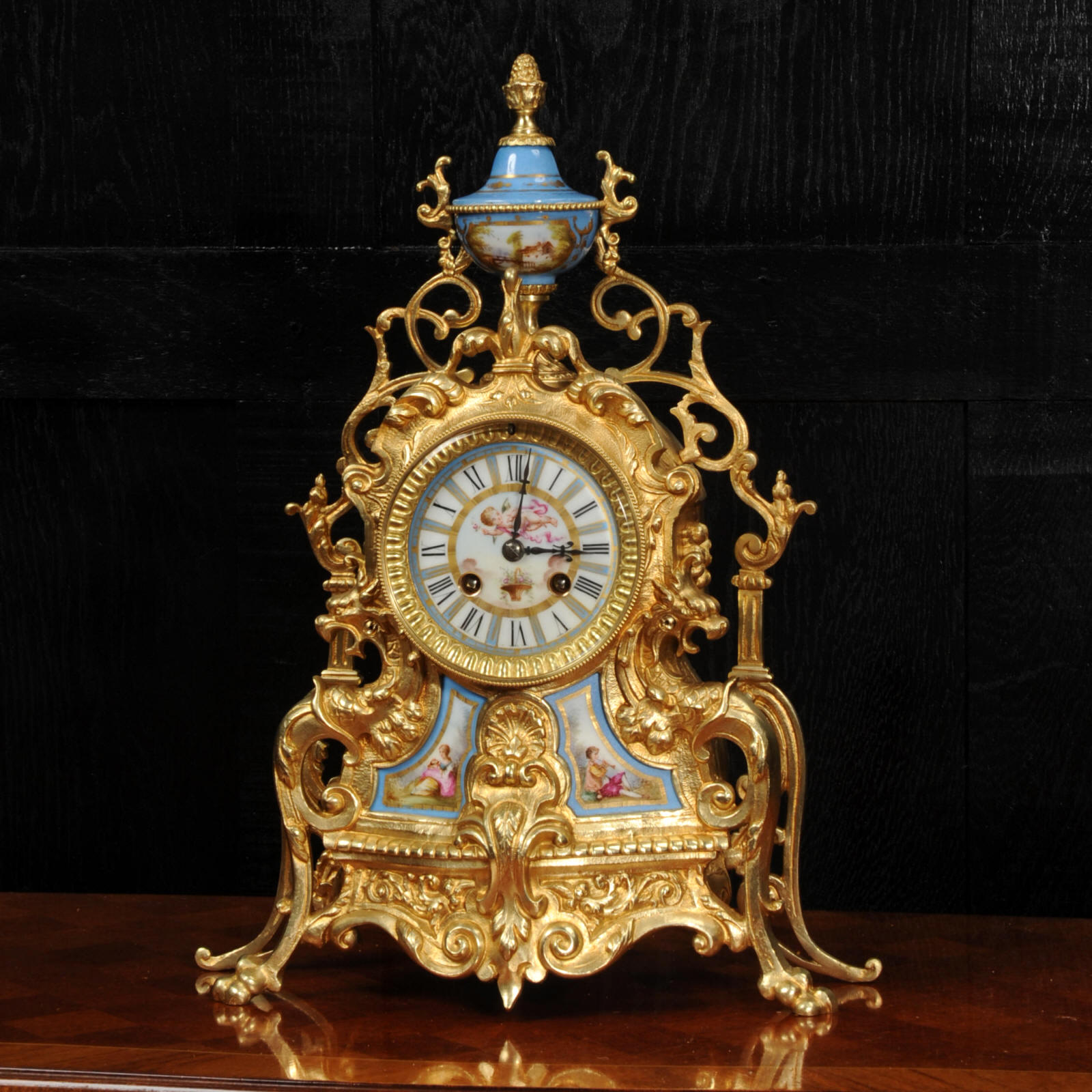 The dial has a cherub with a basket of flowers and is complete with its original finely cut blued steel hands and bevelled glass. The urn is beautifully painted with a tranquil country scene. The French movement is of high quality. It is in excellent clean and running condition having been fully overhauled by our clockmaker. Pendulum is a replacement. It runs for 8 days and strikes the hours and halves on a bell. Click the video clip below to hear the bell and watch the clock running. Condition of the case is excellent, the original gilding is beautifully clean and bright with hardly any wear or discolouration. The porcelain is in excellent condition, there is some rubbing to the over-glaze gilt decoration. Complete with pendulum, bell and a suitable key. Full setting up instructions supplied if required.