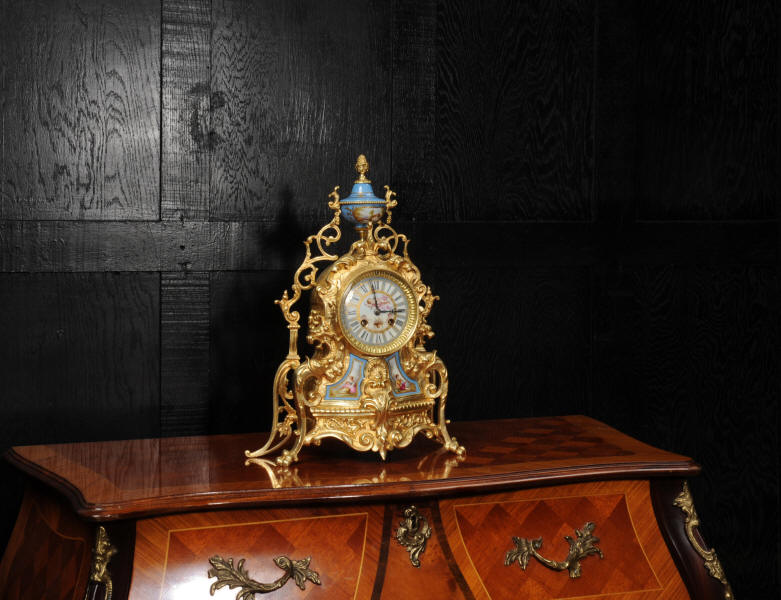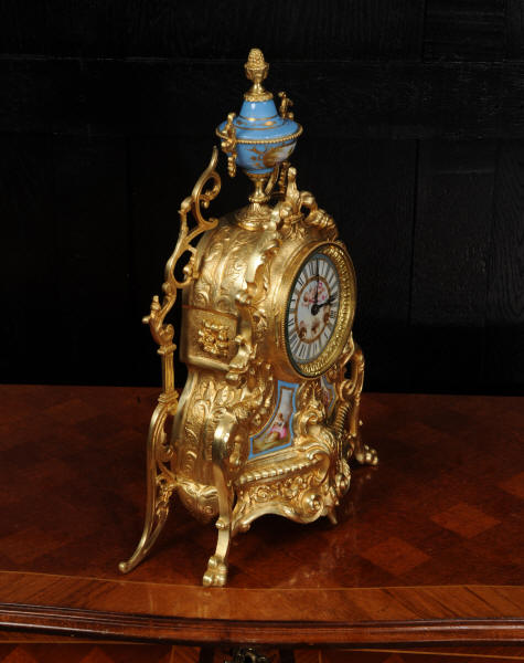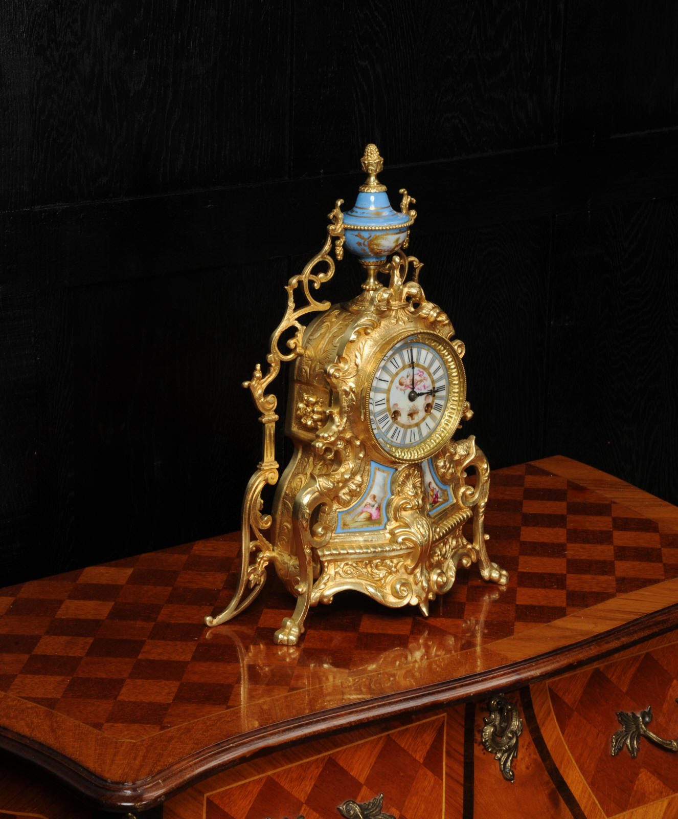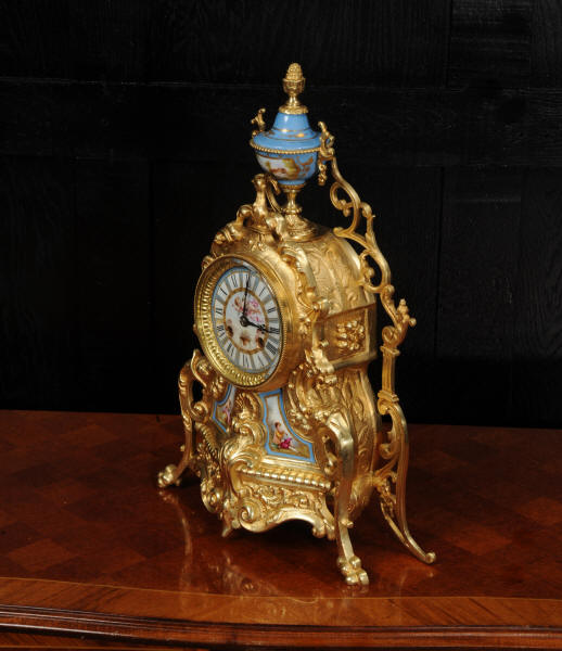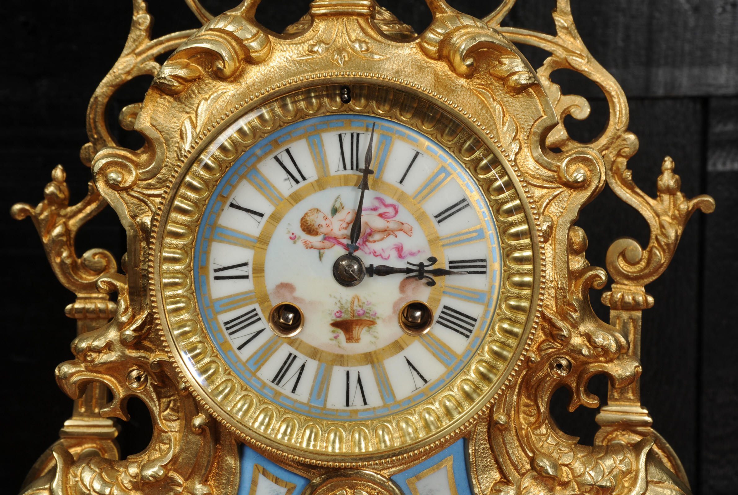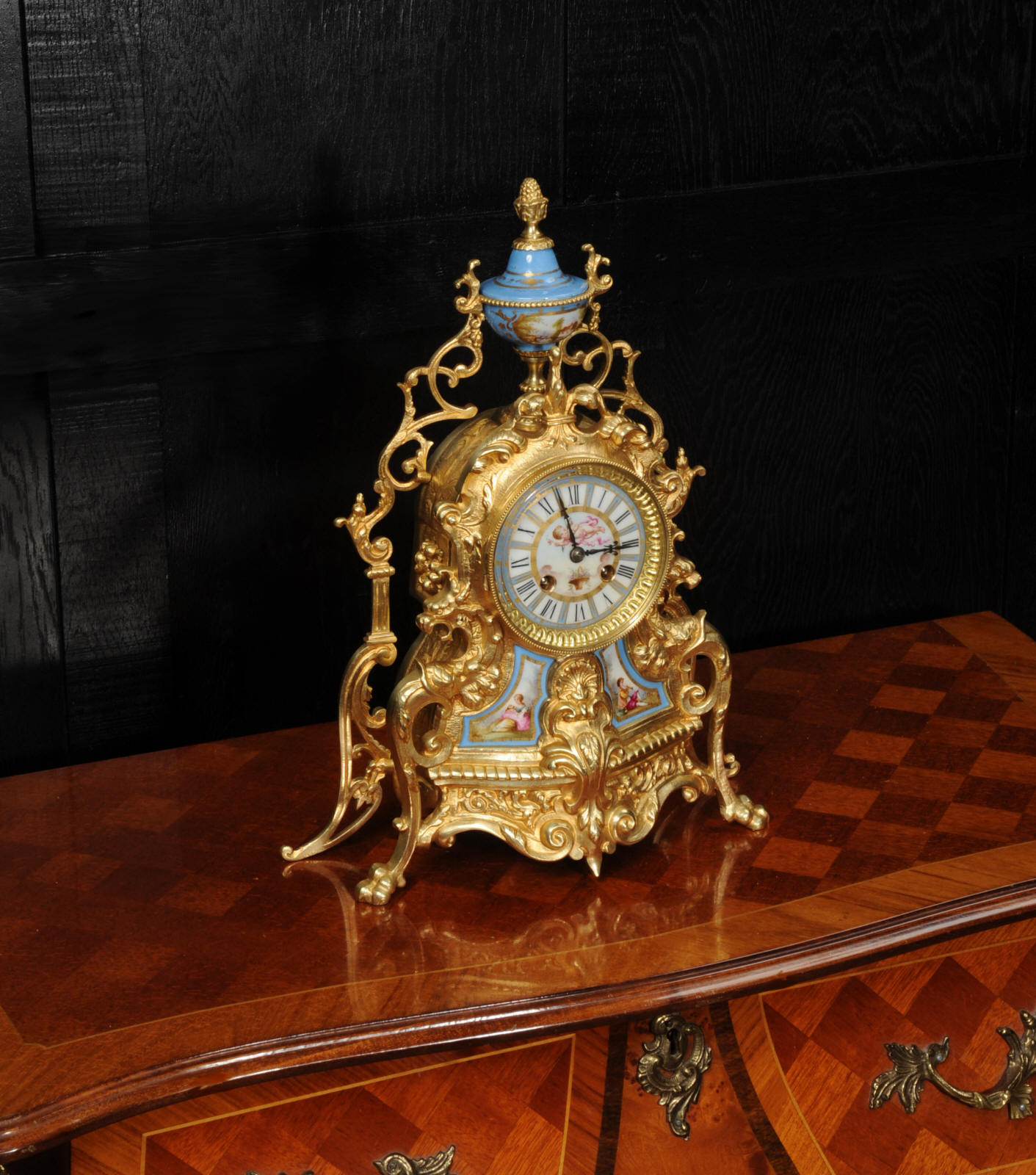 The dial has a cherub with a basket of flowers and is complete with its original finely cut blued steel hands and bevelled glass. The urn is beautifully painted with a tranquil country scene. The French movement is of high quality. It is in excellent clean and running condition having been fully overhauled by our clockmaker. Pendulum is a replacement. It runs for 8 days and strikes the hours and halves on a bell. Click the video clip below to hear the bell and watch the clock running. Condition of the case is excellent, the original gilding is beautifully clean and bright with hardly any wear or discolouration. The porcelain is in excellent condition, there is some rubbing to the over-glaze gilt decoration. Complete with pendulum, bell and a suitable key. Full setting up instructions supplied if required.