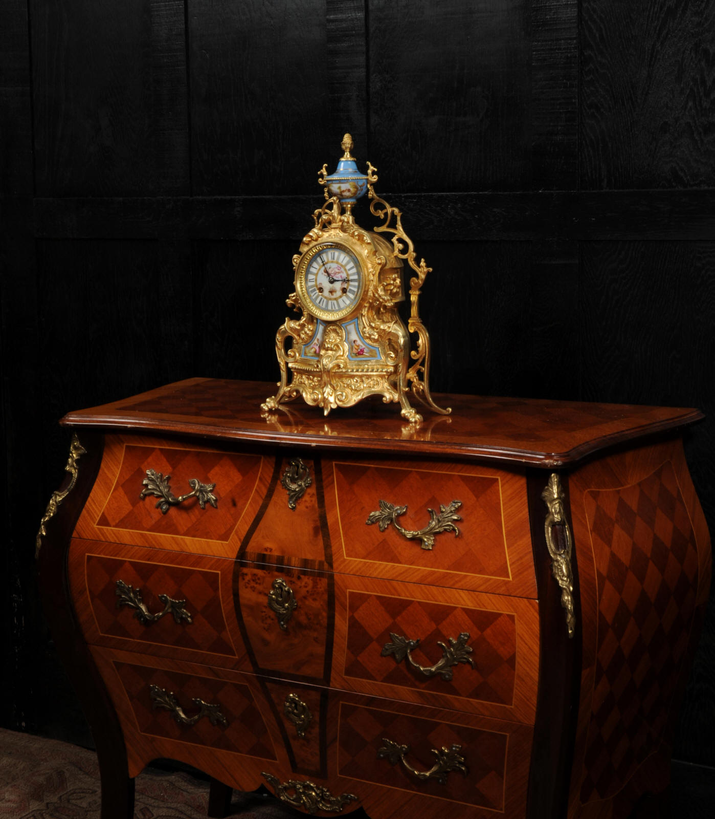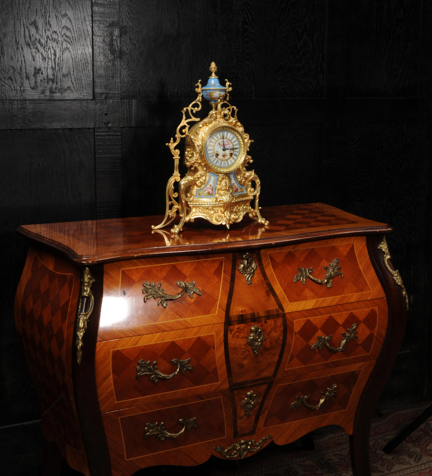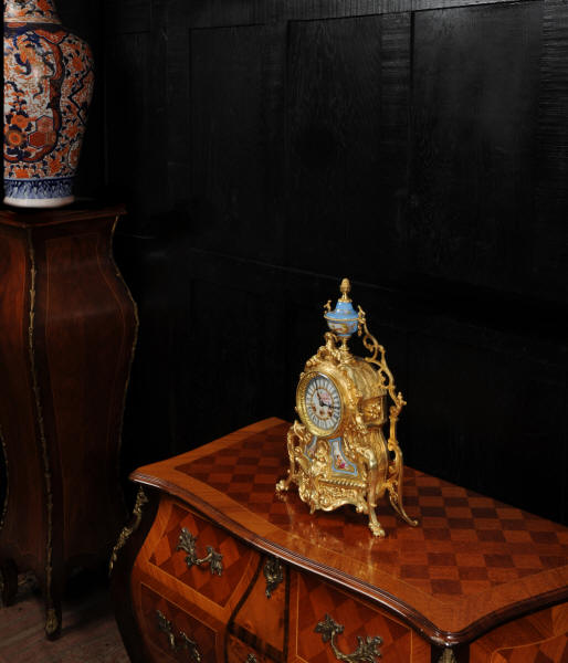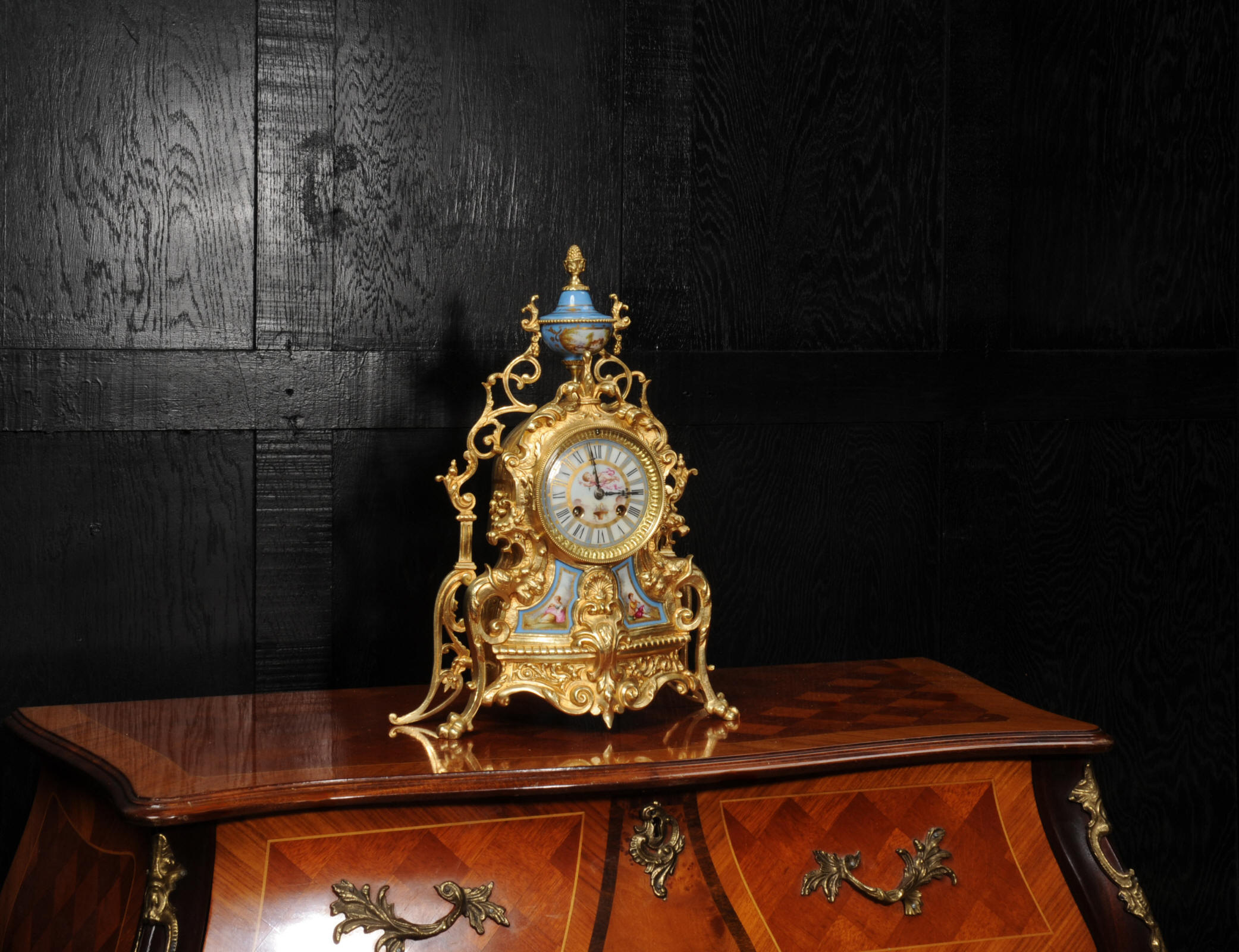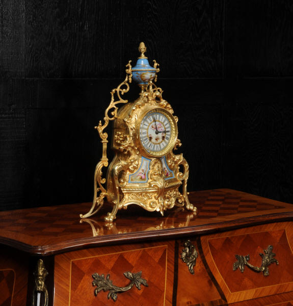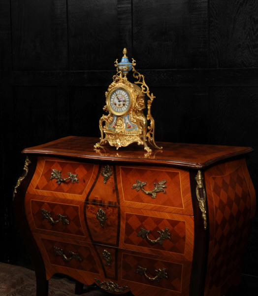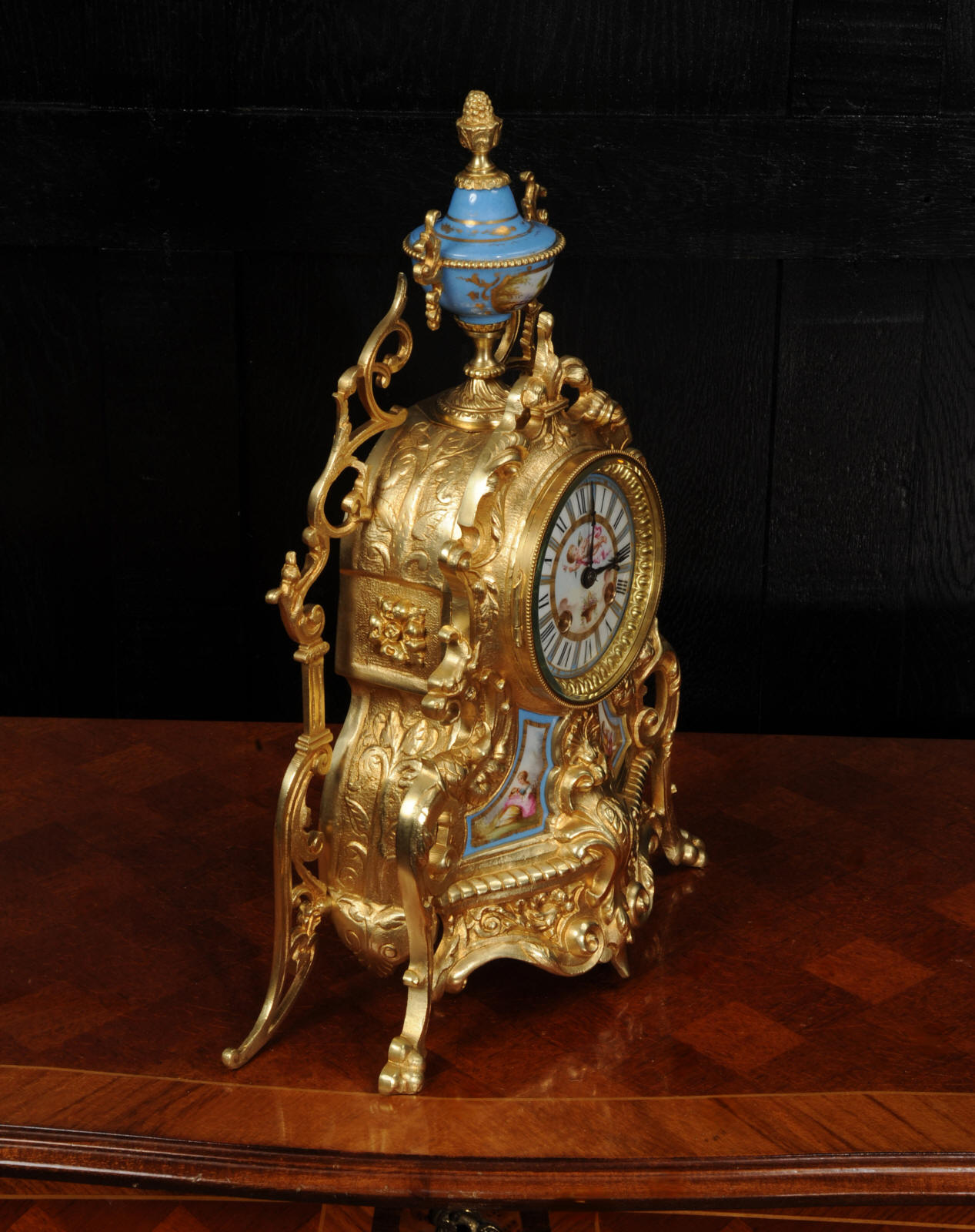 The dial has a cherub with a basket of flowers and is complete with its original finely cut blued steel hands and bevelled glass. The urn is beautifully painted with a tranquil country scene. The French movement is of high quality. It is in excellent clean and running condition having been fully overhauled by our clockmaker. Pendulum is a replacement. It runs for 8 days and strikes the hours and halves on a bell. Click the video clip below to hear the bell and watch the clock running. Condition of the case is excellent, the original gilding is beautifully clean and bright with hardly any wear or discolouration. The porcelain is in excellent condition, there is some rubbing to the over-glaze gilt decoration. Complete with pendulum, bell and a suitable key. Full setting up instructions supplied if required.