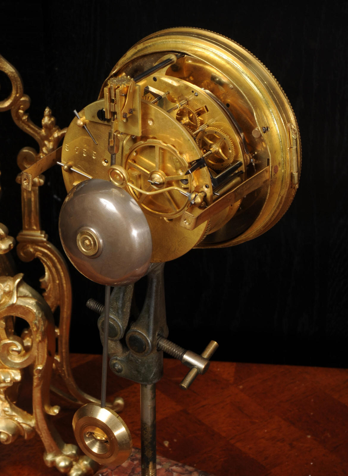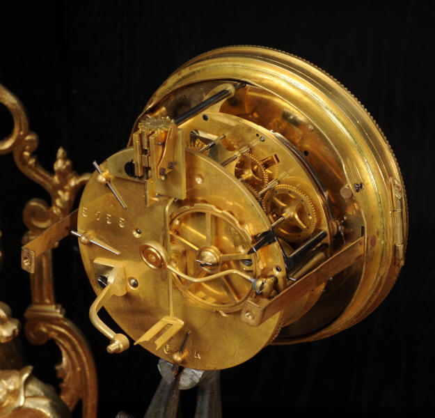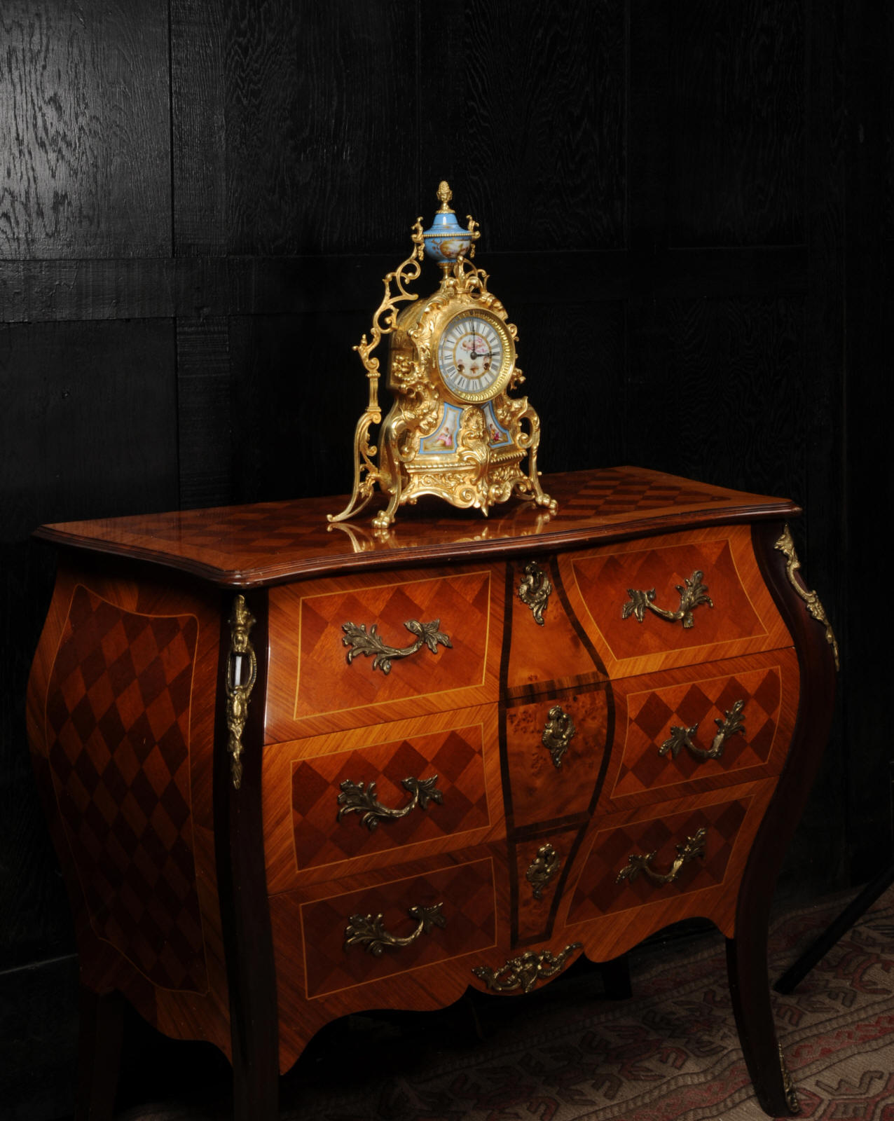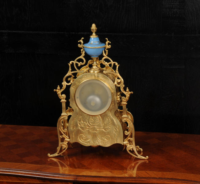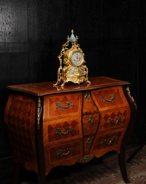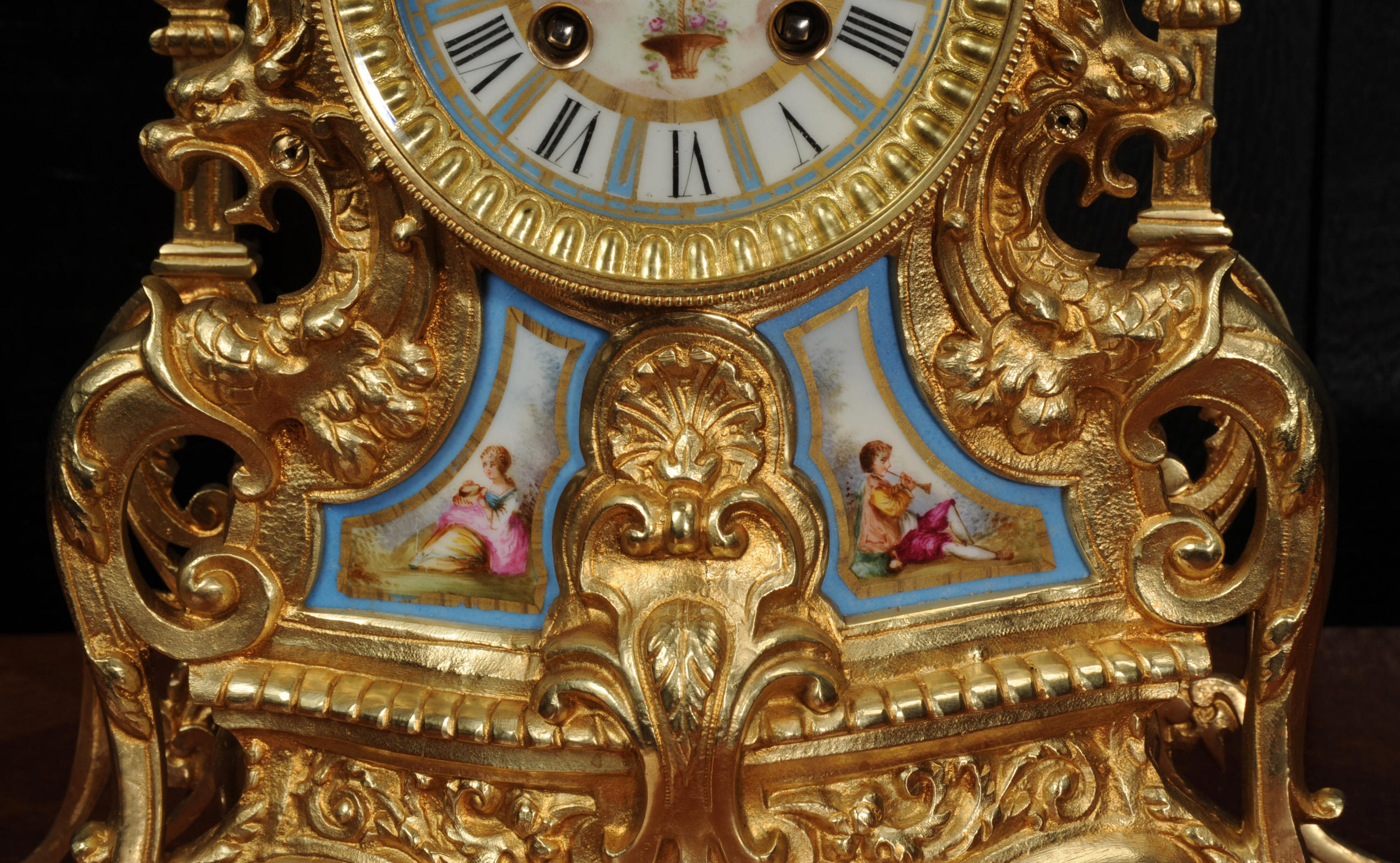 The dial has a cherub with a basket of flowers and is complete with its original finely cut blued steel hands and bevelled glass. The urn is beautifully painted with a tranquil country scene. The French movement is of high quality. It is in excellent clean and running condition having been fully overhauled by our clockmaker. Pendulum is a replacement. It runs for 8 days and strikes the hours and halves on a bell. Click the video clip below to hear the bell and watch the clock running. Condition of the case is excellent, the original gilding is beautifully clean and bright with hardly any wear or discolouration. The porcelain is in excellent condition, there is some rubbing to the over-glaze gilt decoration. Complete with pendulum, bell and a suitable key. Full setting up instructions supplied if required.